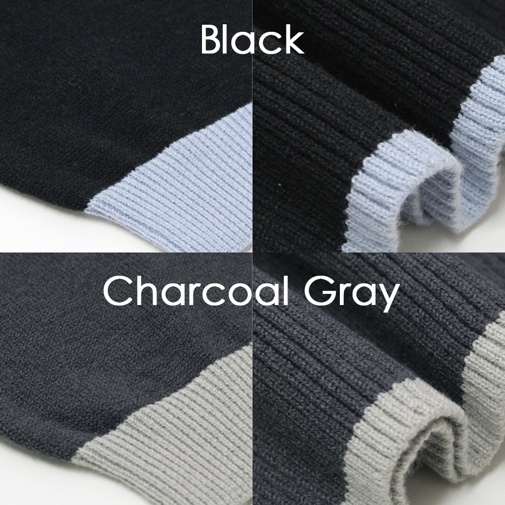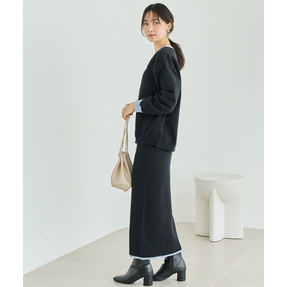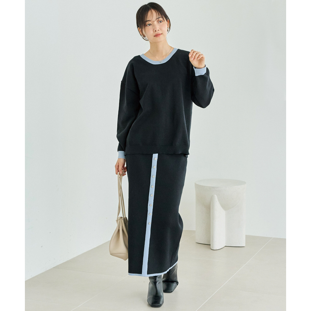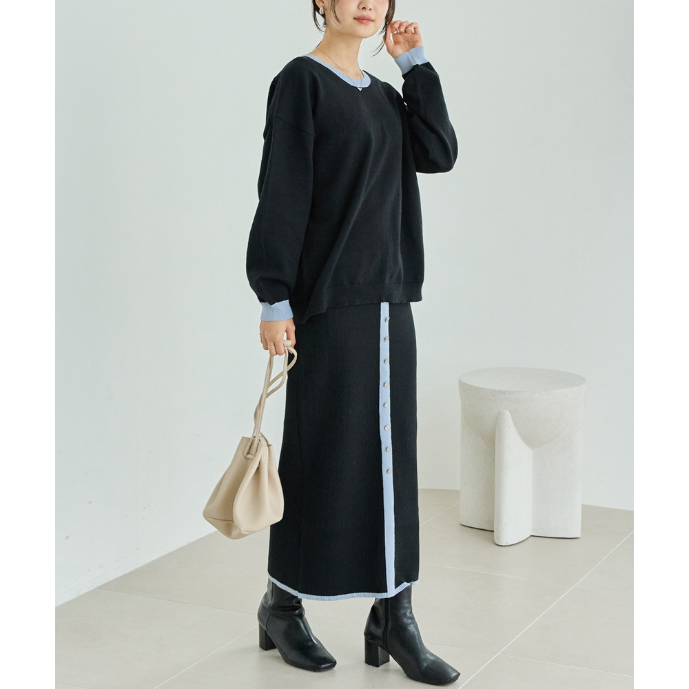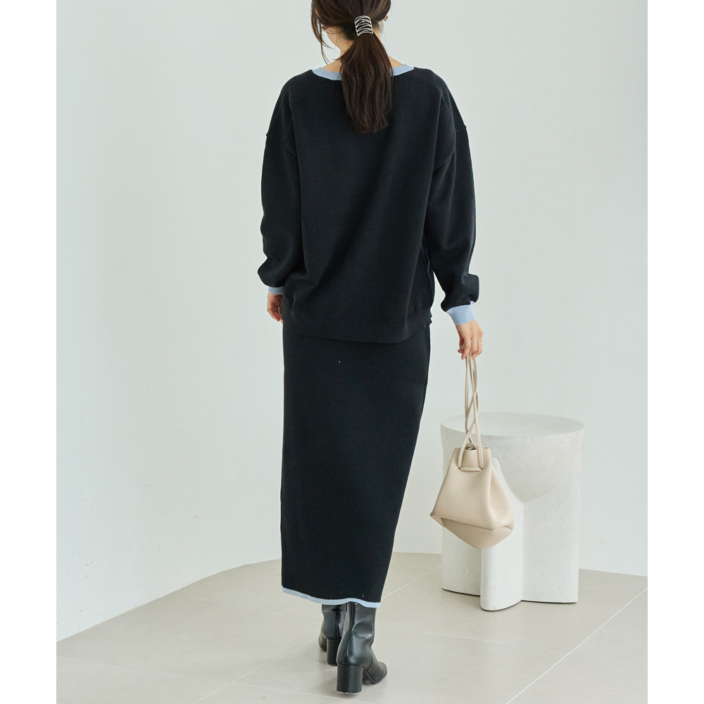 バイカラーの配色が目を引くニットセットアップ。
