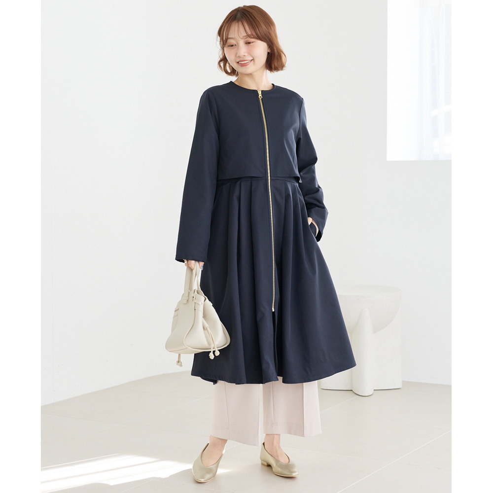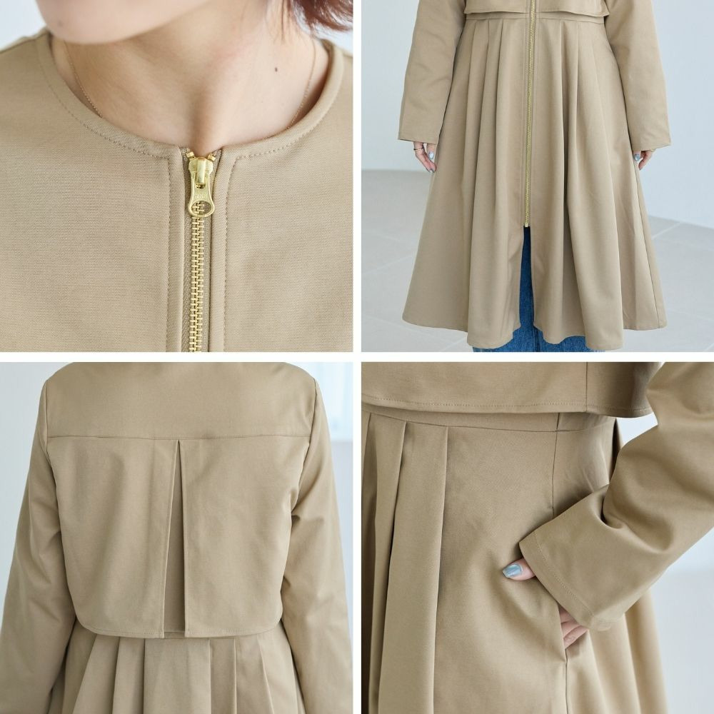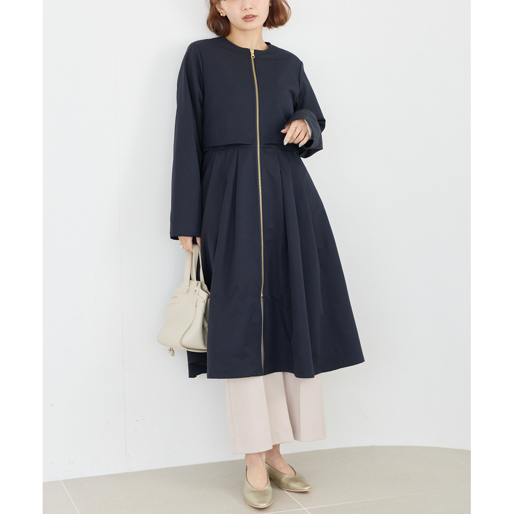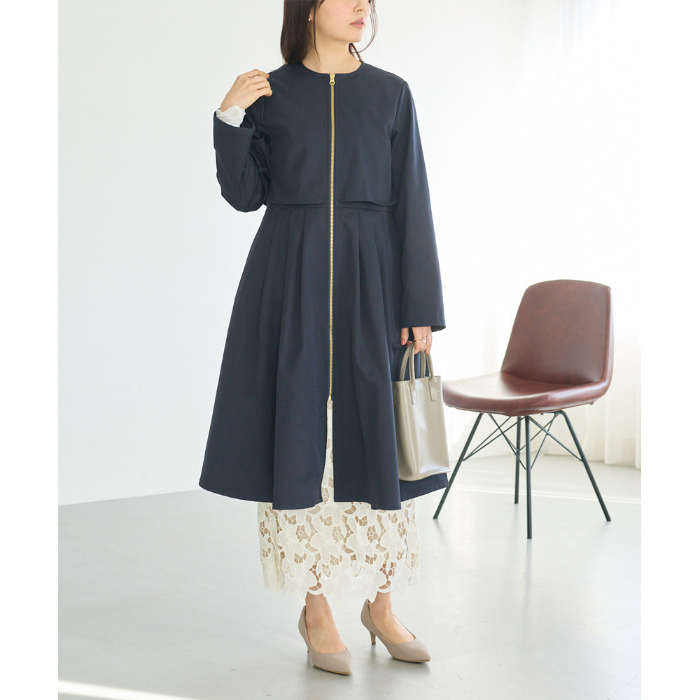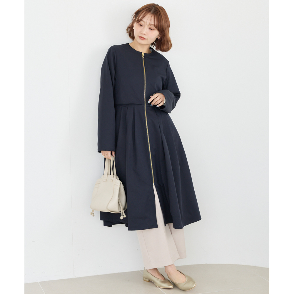 上品なノーカラーと美しいプリーツディティールが目を引くブルゾンコート。