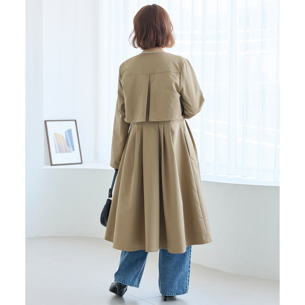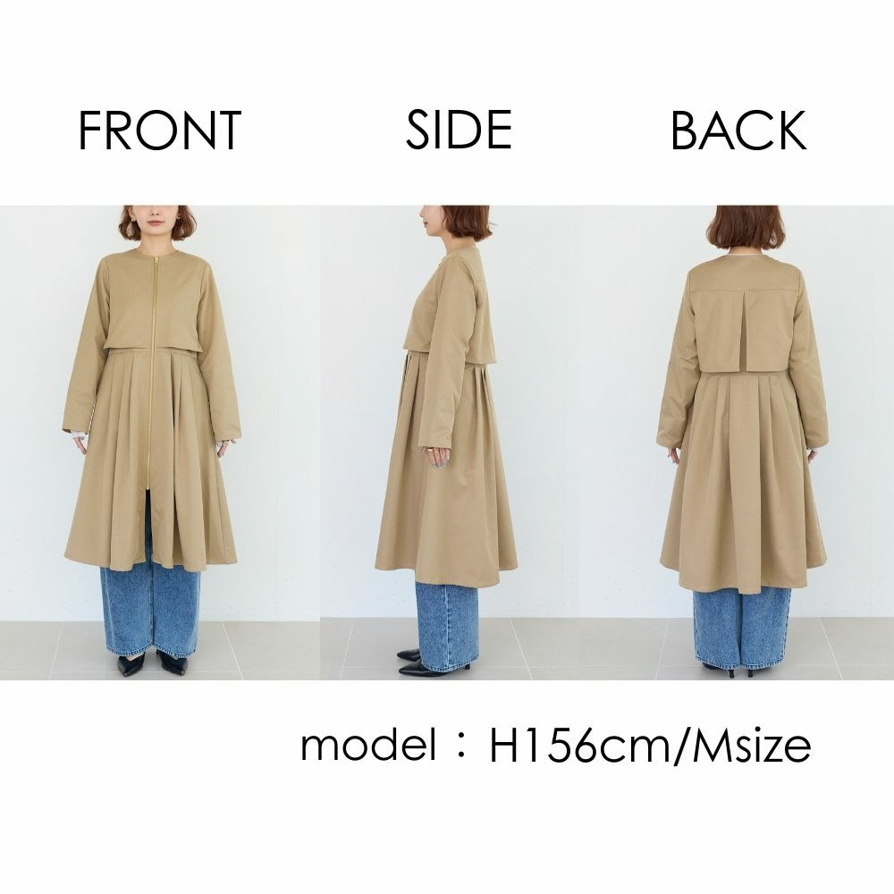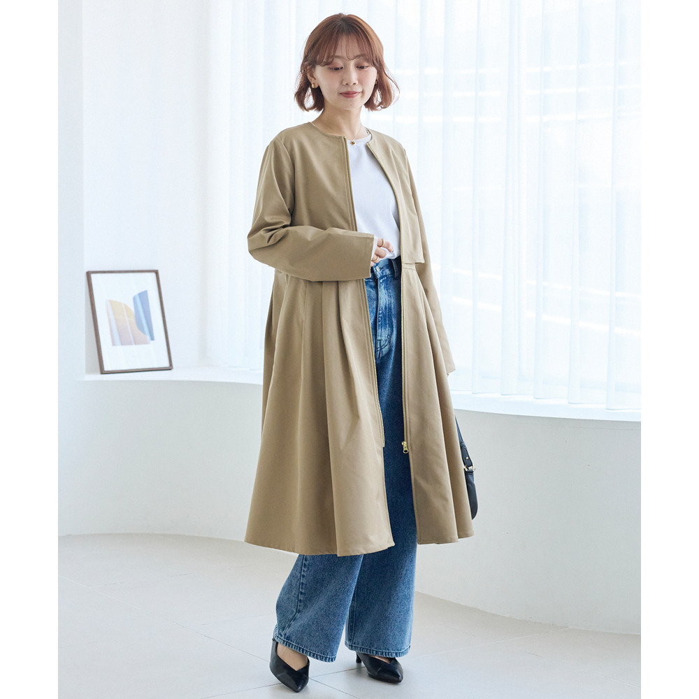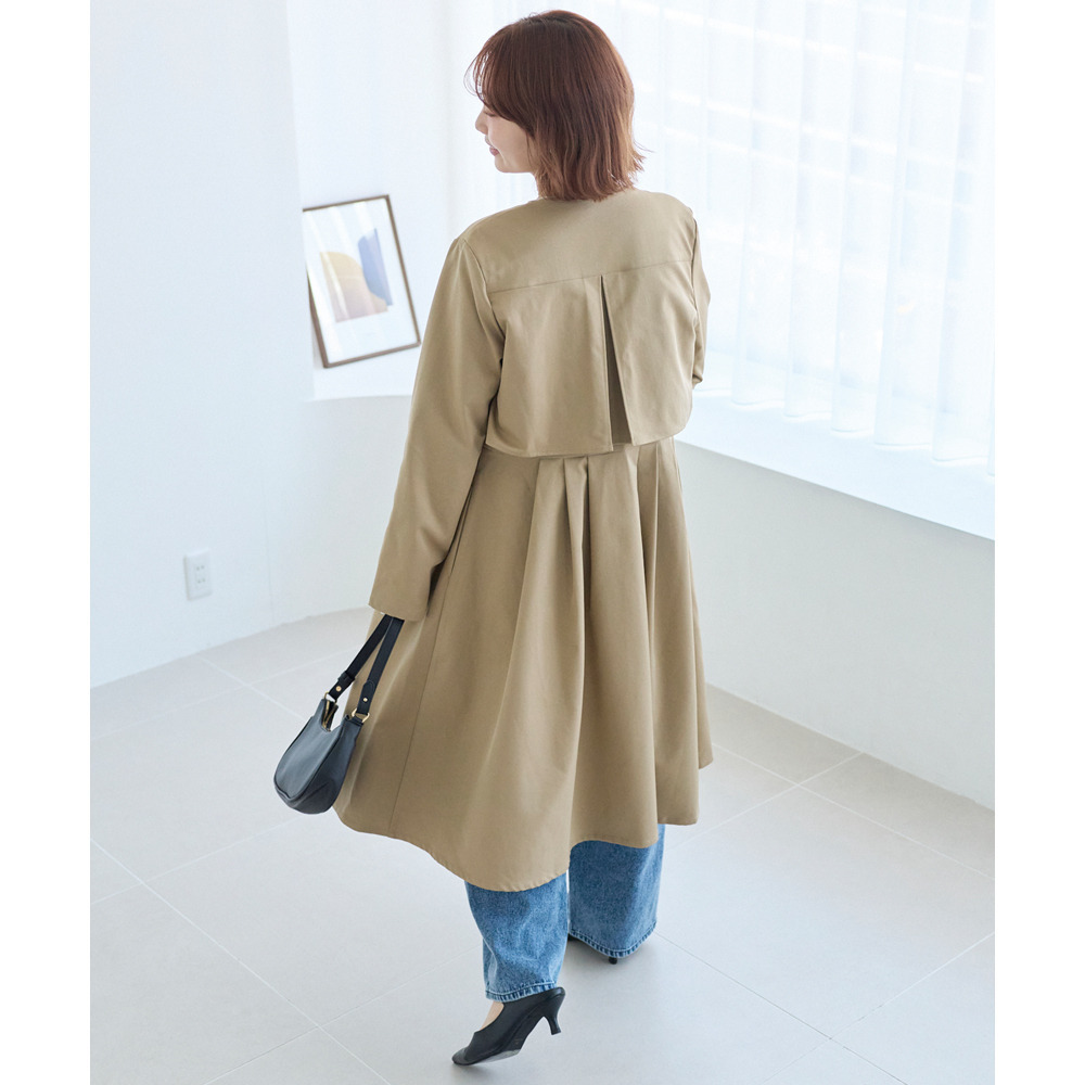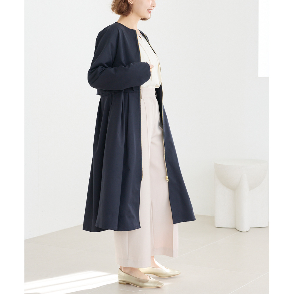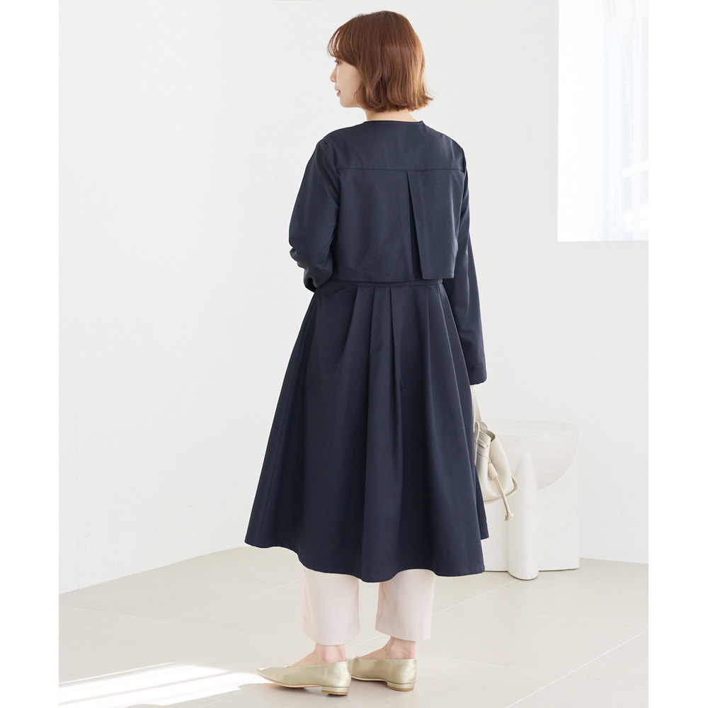 上品なノーカラーと美しいプリーツディティールが目を引くブルゾンコート。