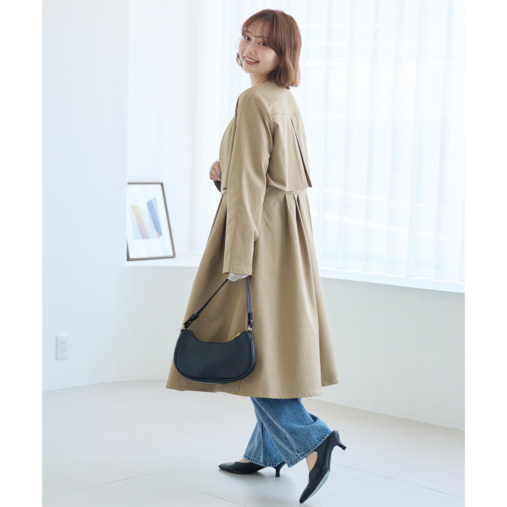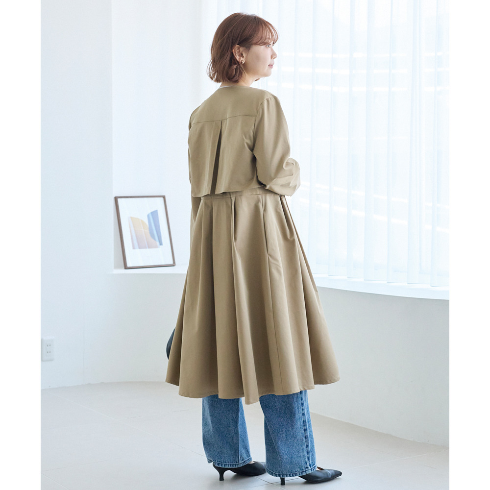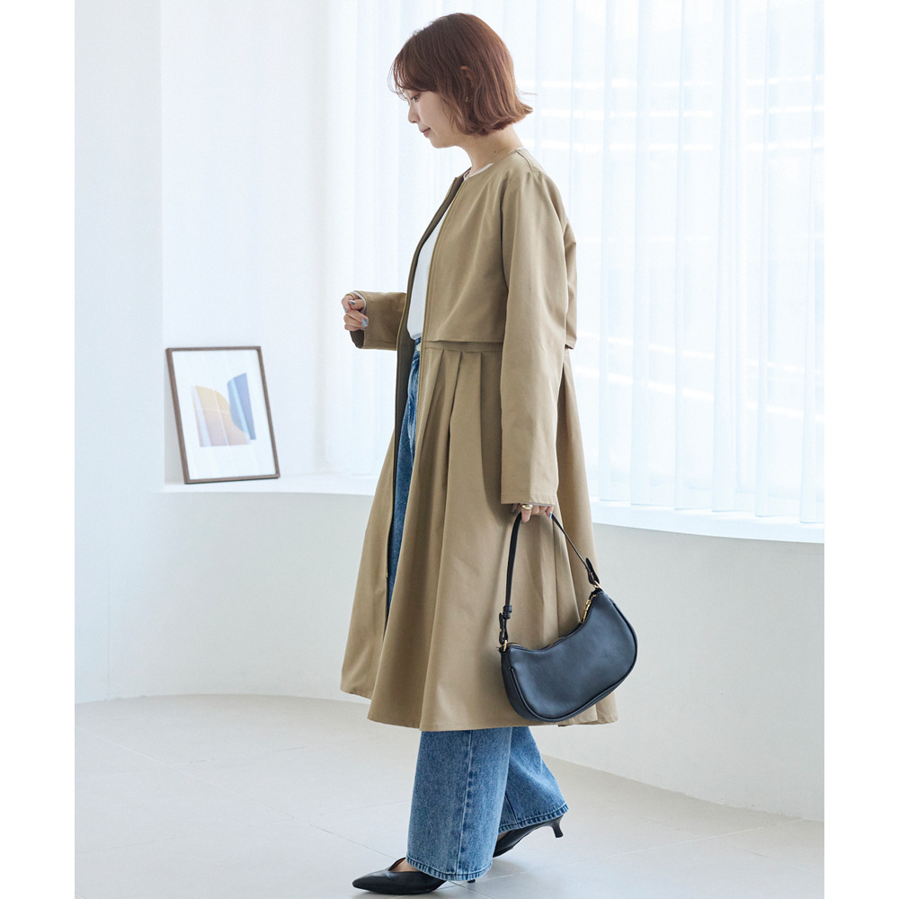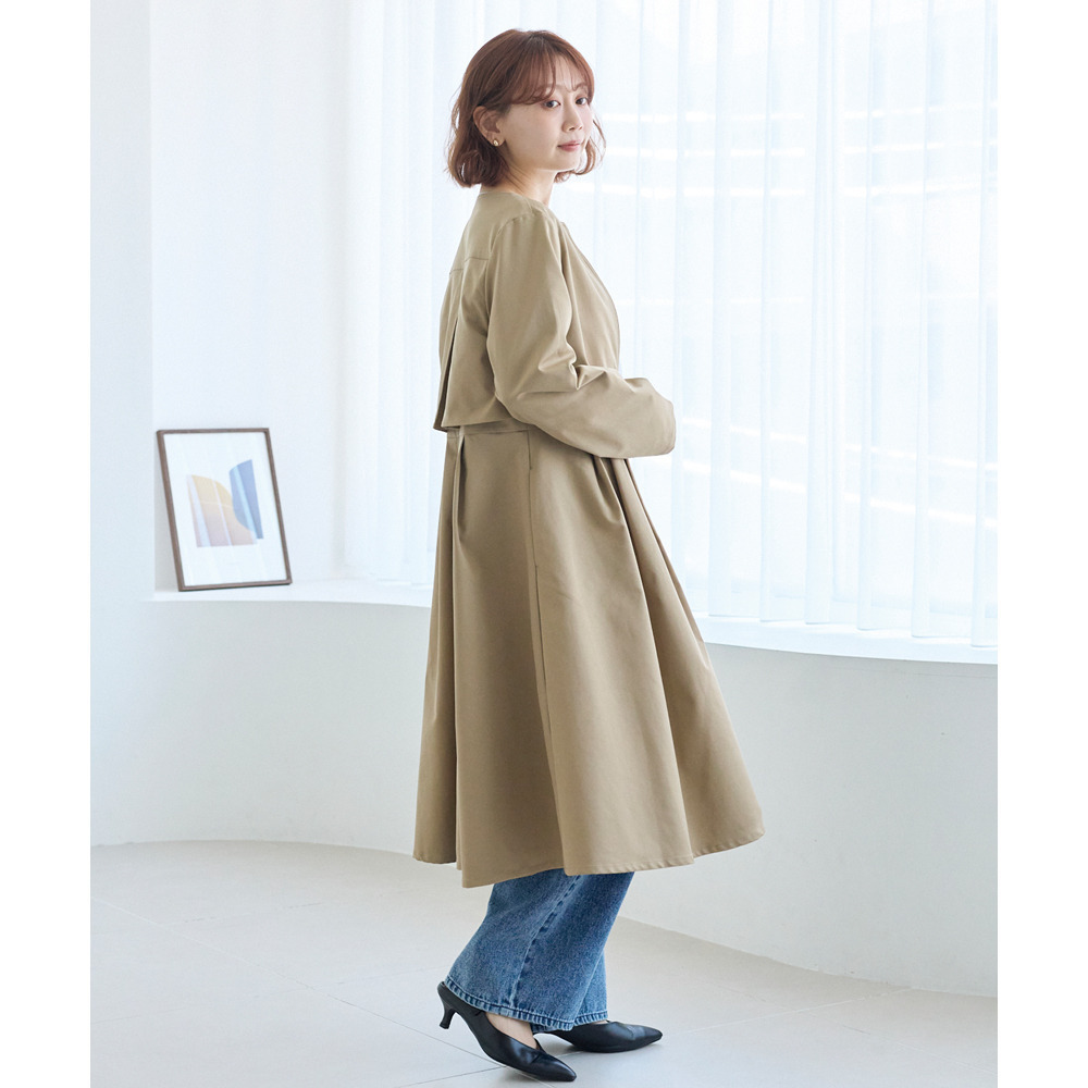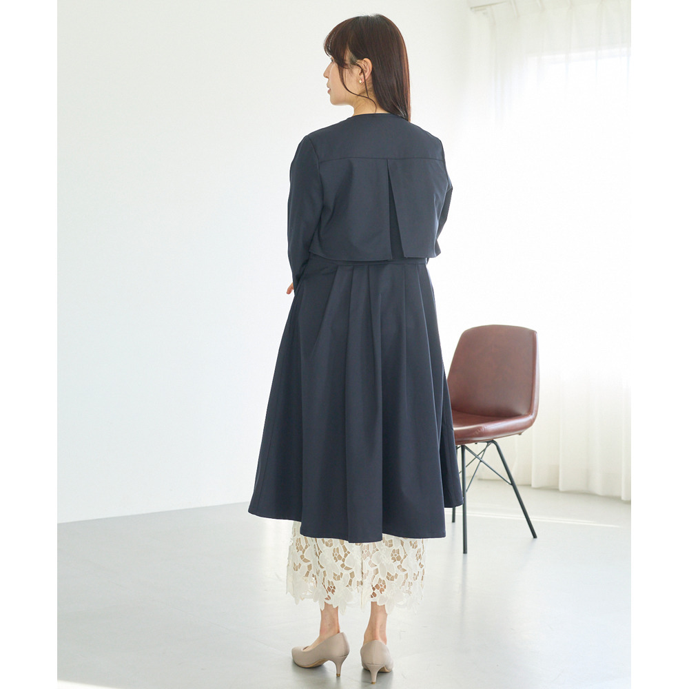 上品なノーカラーと美しいプリーツディティールが目を引くブルゾンコート。
