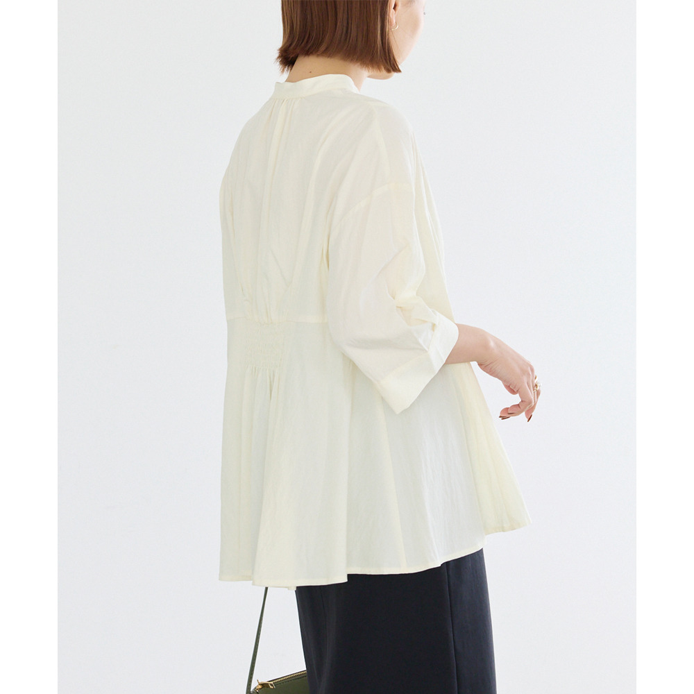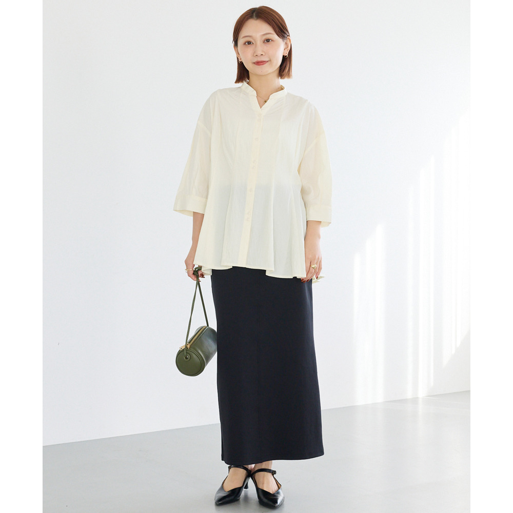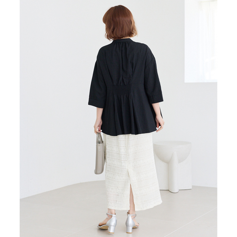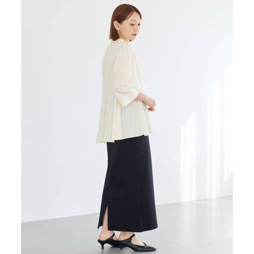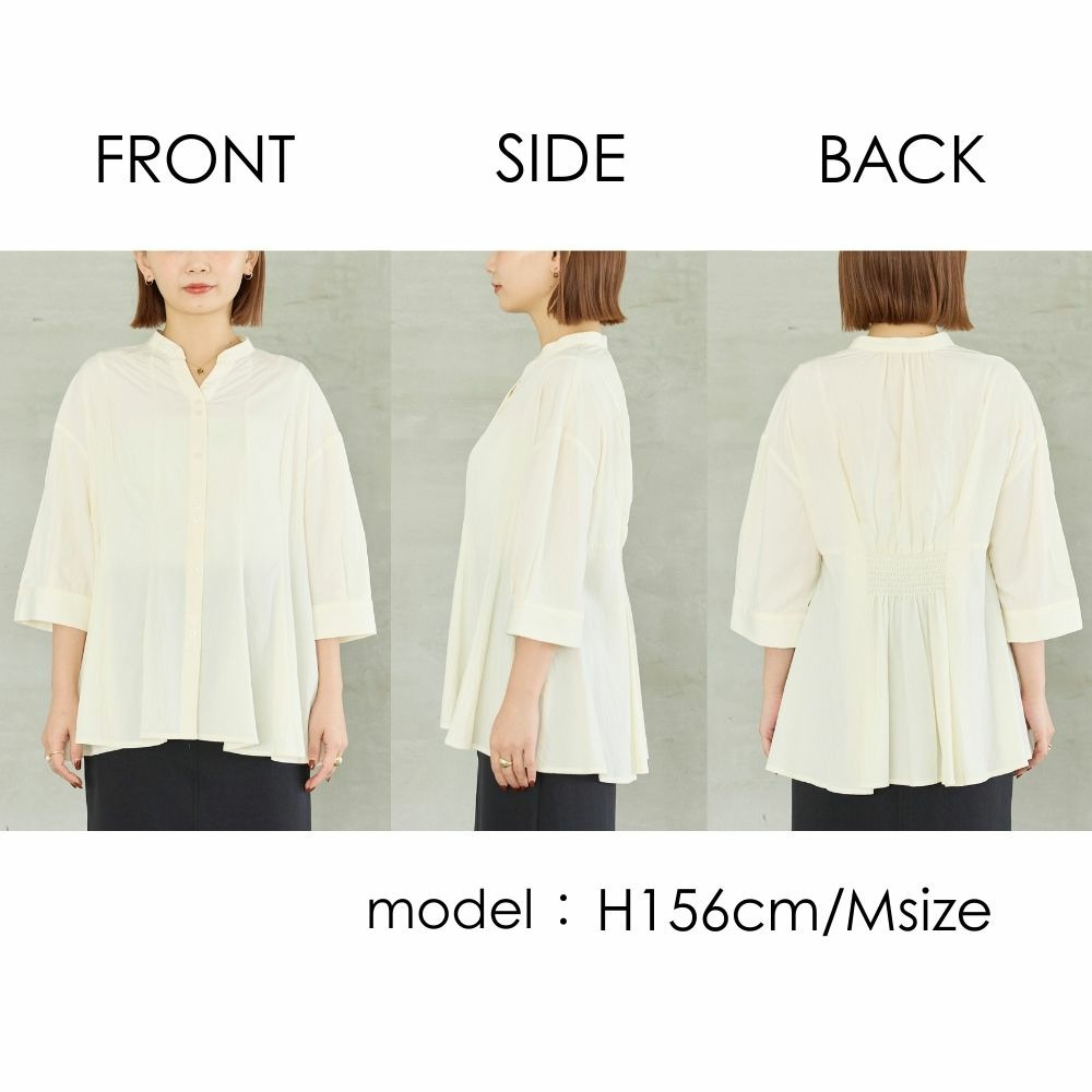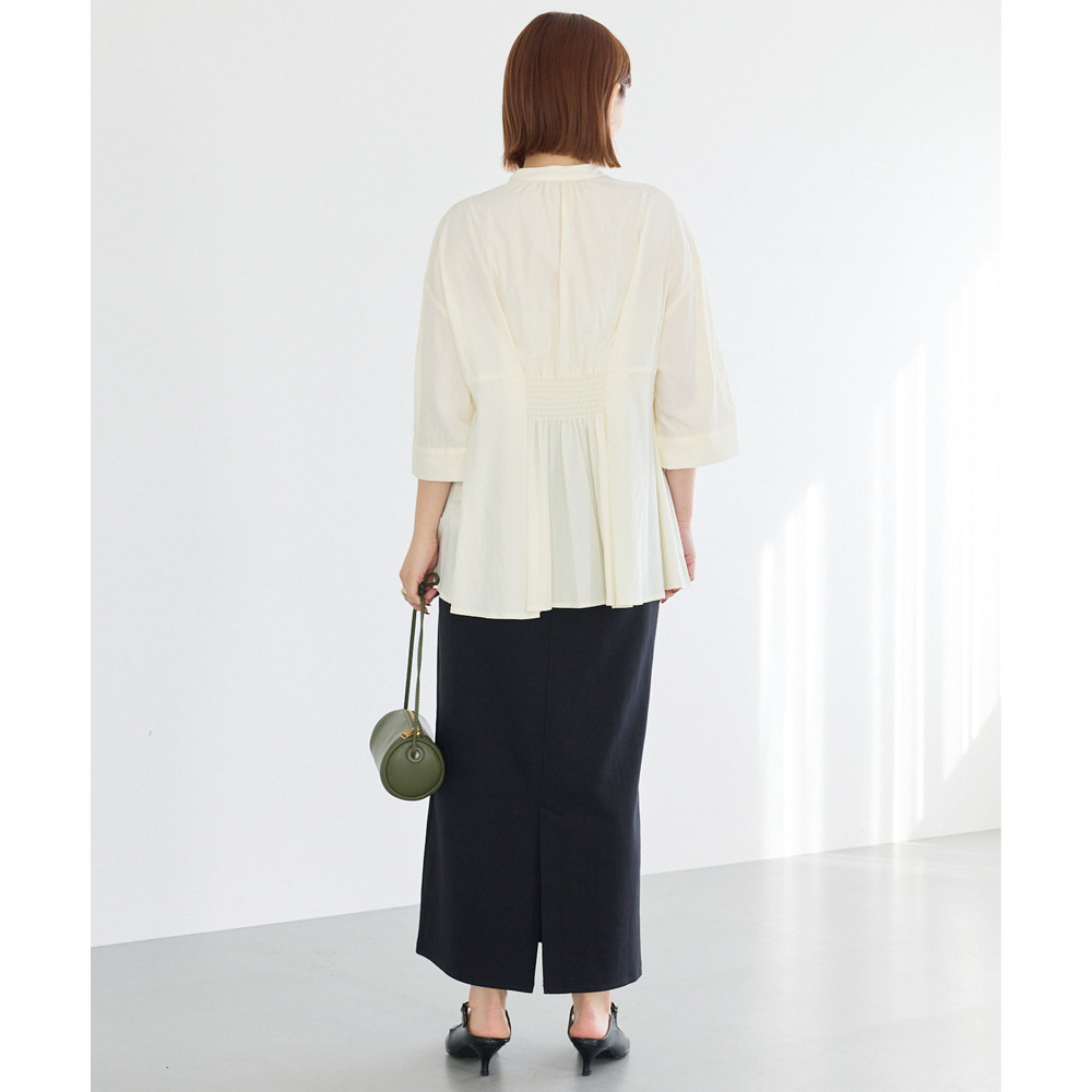 フロントに施されたタックと背中のウエストギャザーが縦のラインを強調し、アウトスタイルでもスッキリと決まります。合わせるボトム次第で、きれいめからカジュアルまで自分らしいアレンジを楽しめる万能アイテムです。