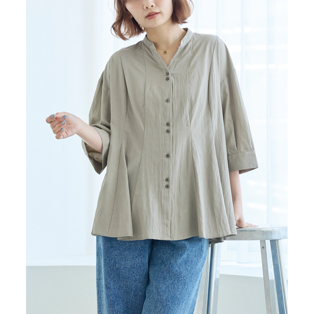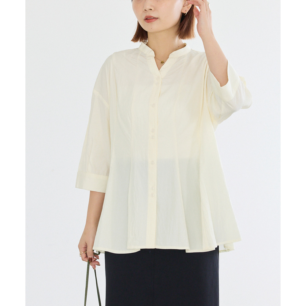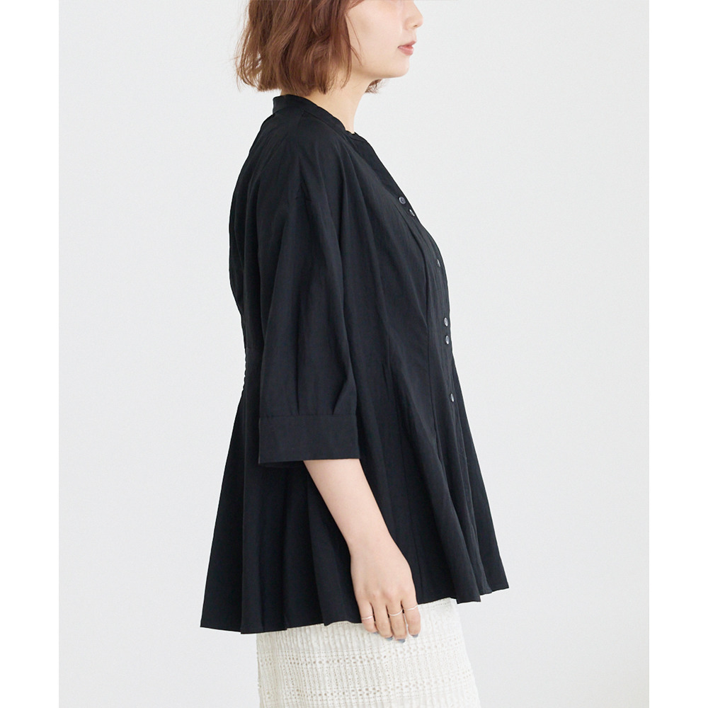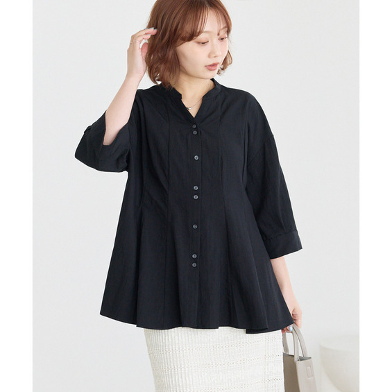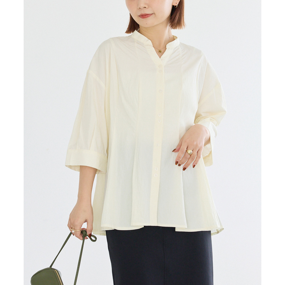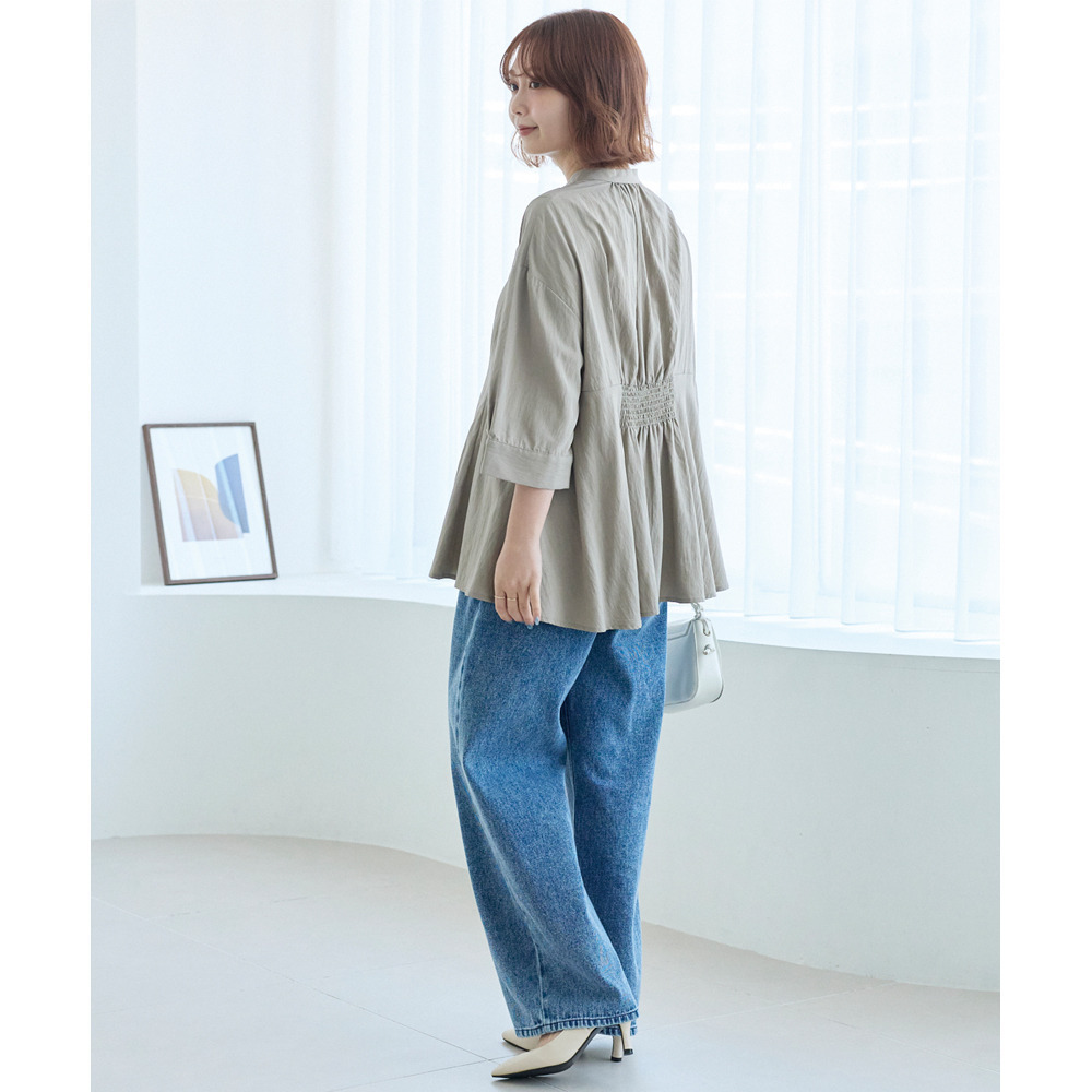 フロントに施されたタックと背中のウエストギャザーが縦のラインを強調し、アウトスタイルでもスッキリと決まります。合わせるボトム次第で、きれいめからカジュアルまで自分らしいアレンジを楽しめる万能アイテムです。