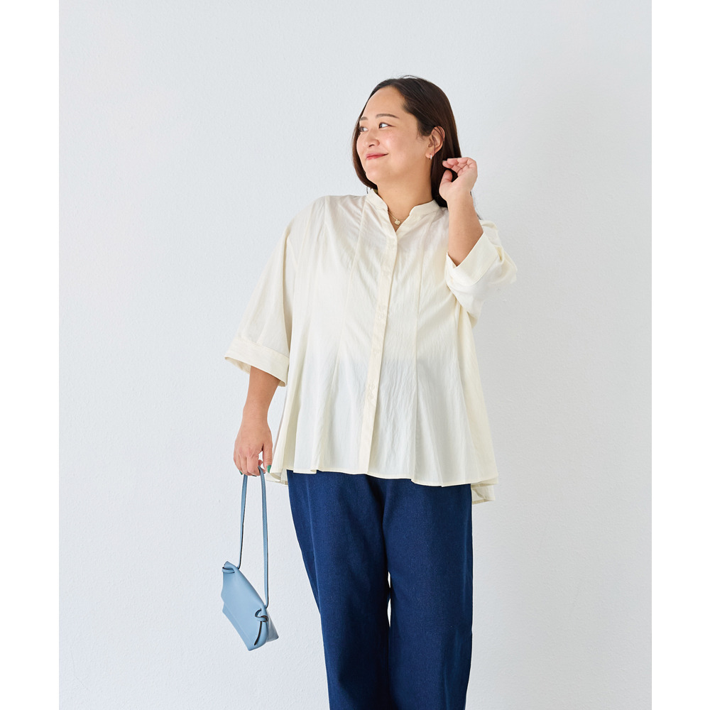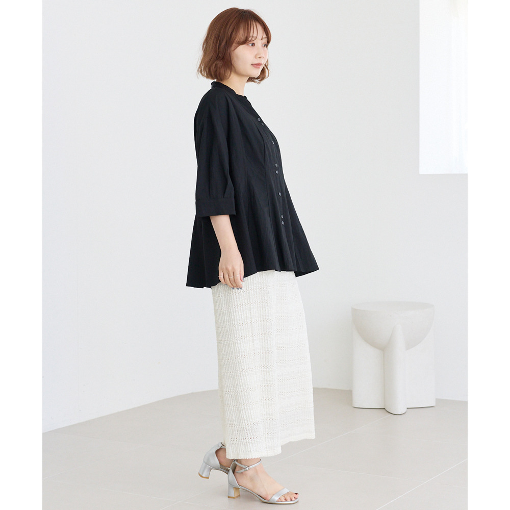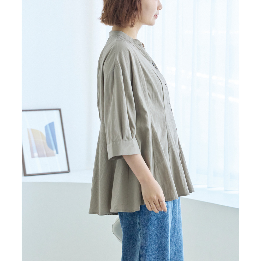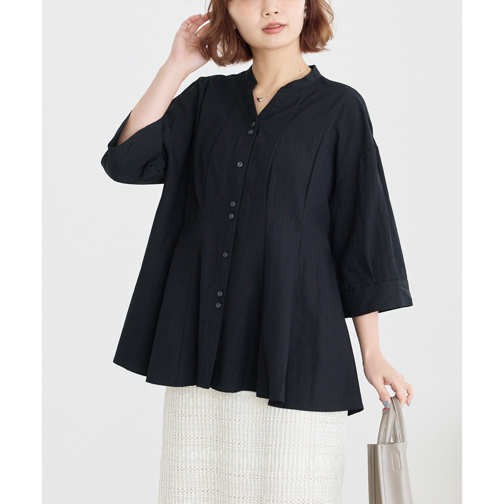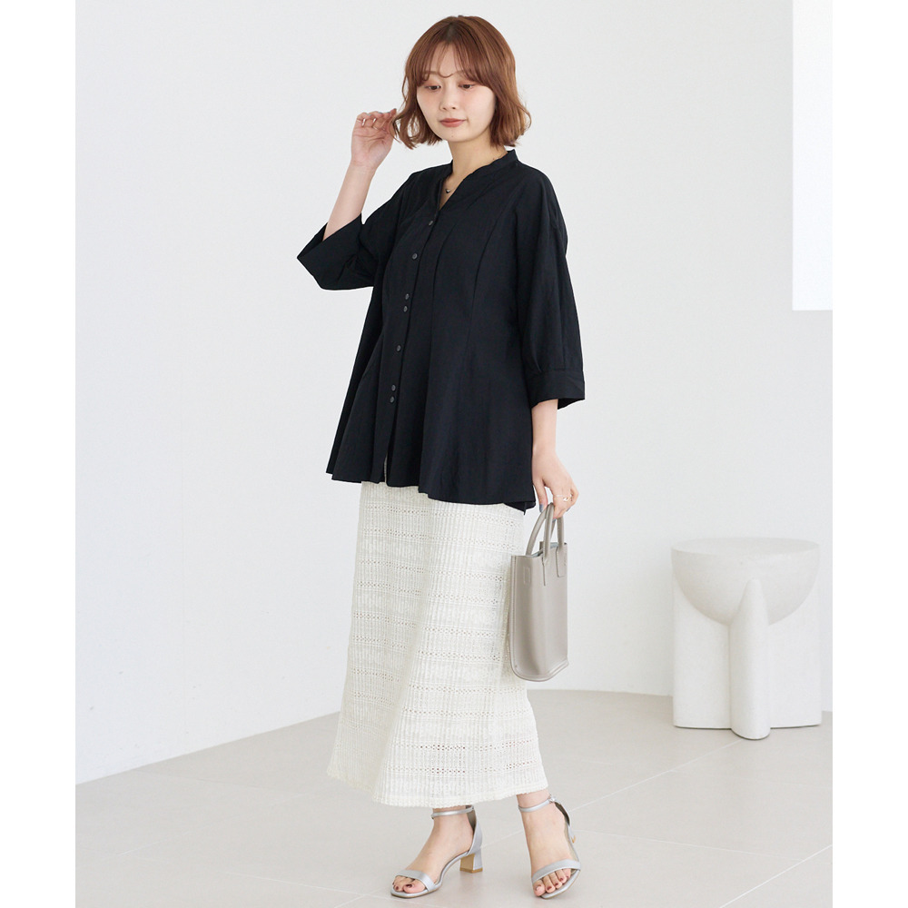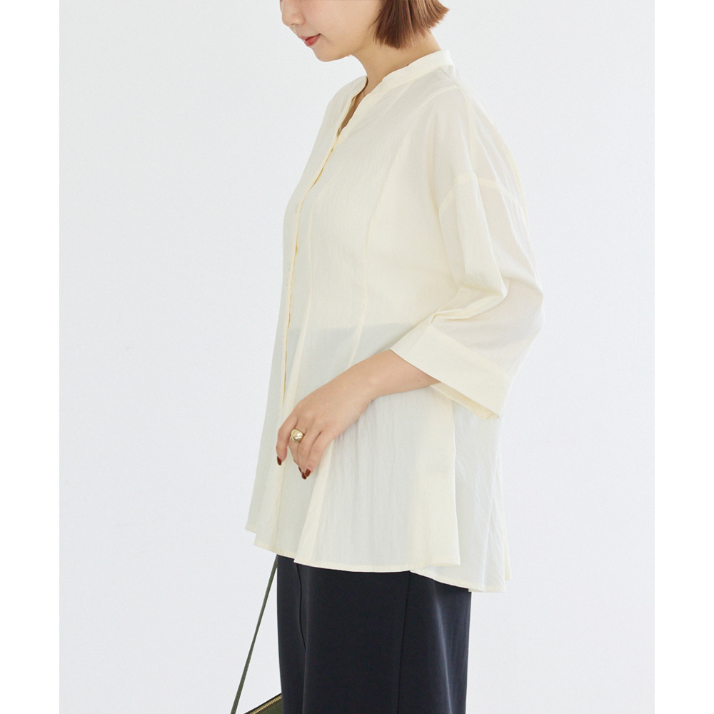 フロントに施されたタックと背中のウエストギャザーが縦のラインを強調し、アウトスタイルでもスッキリと決まります。合わせるボトム次第で、きれいめからカジュアルまで自分らしいアレンジを楽しめる万能アイテムです。