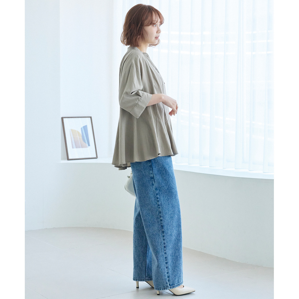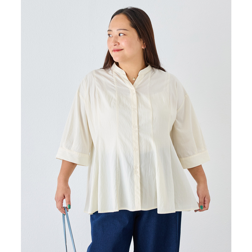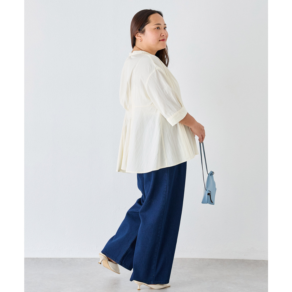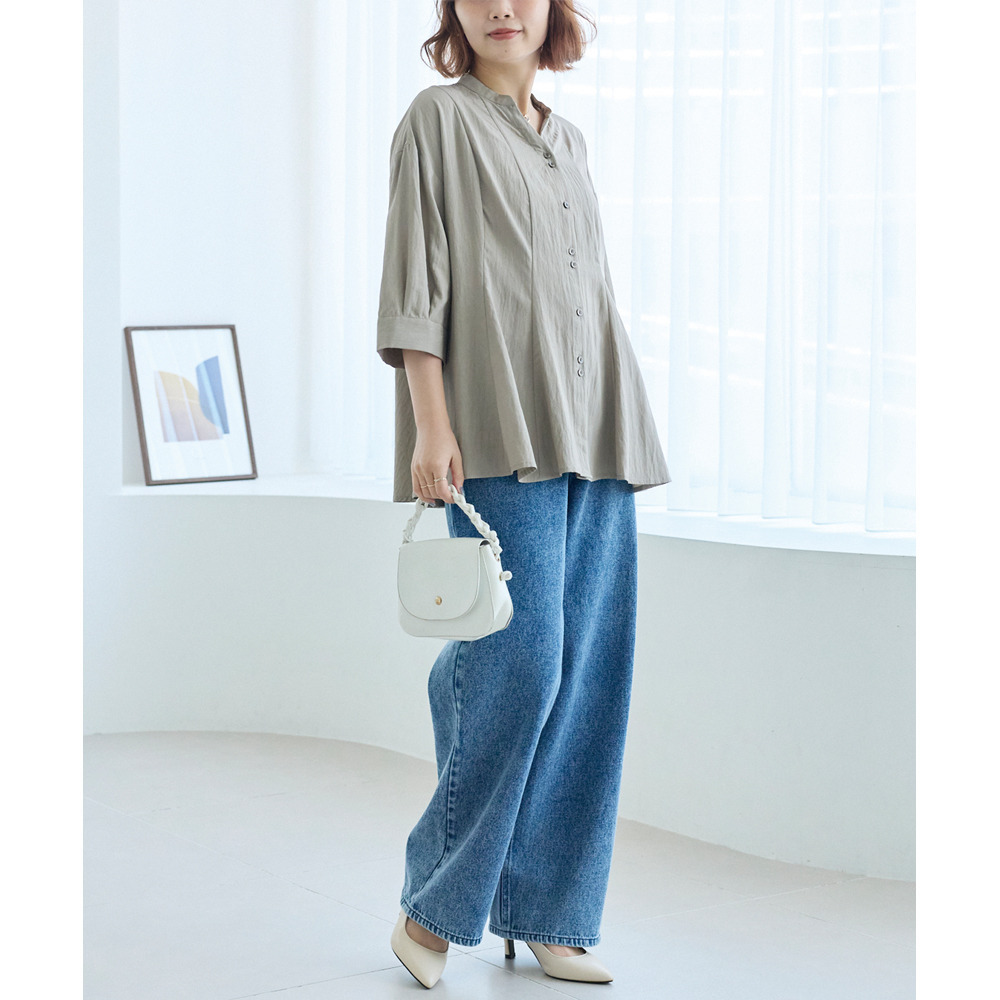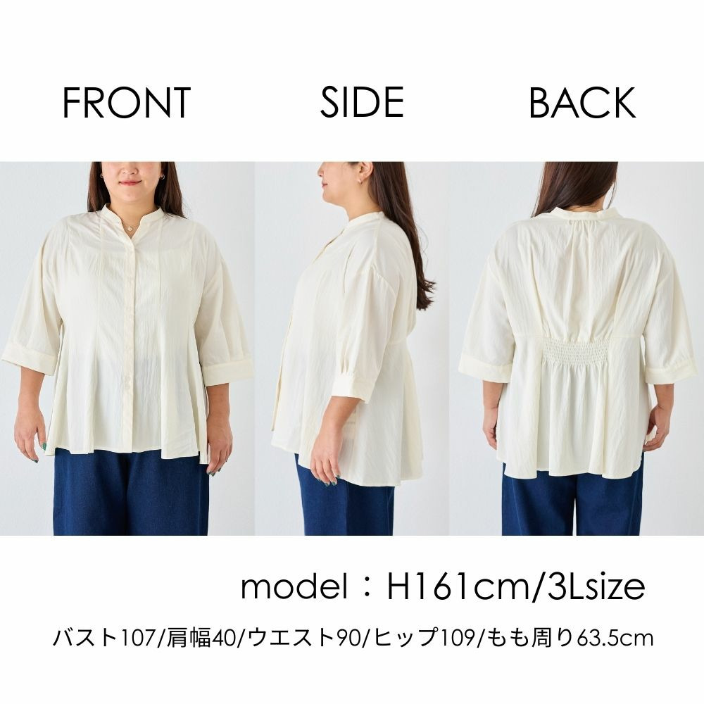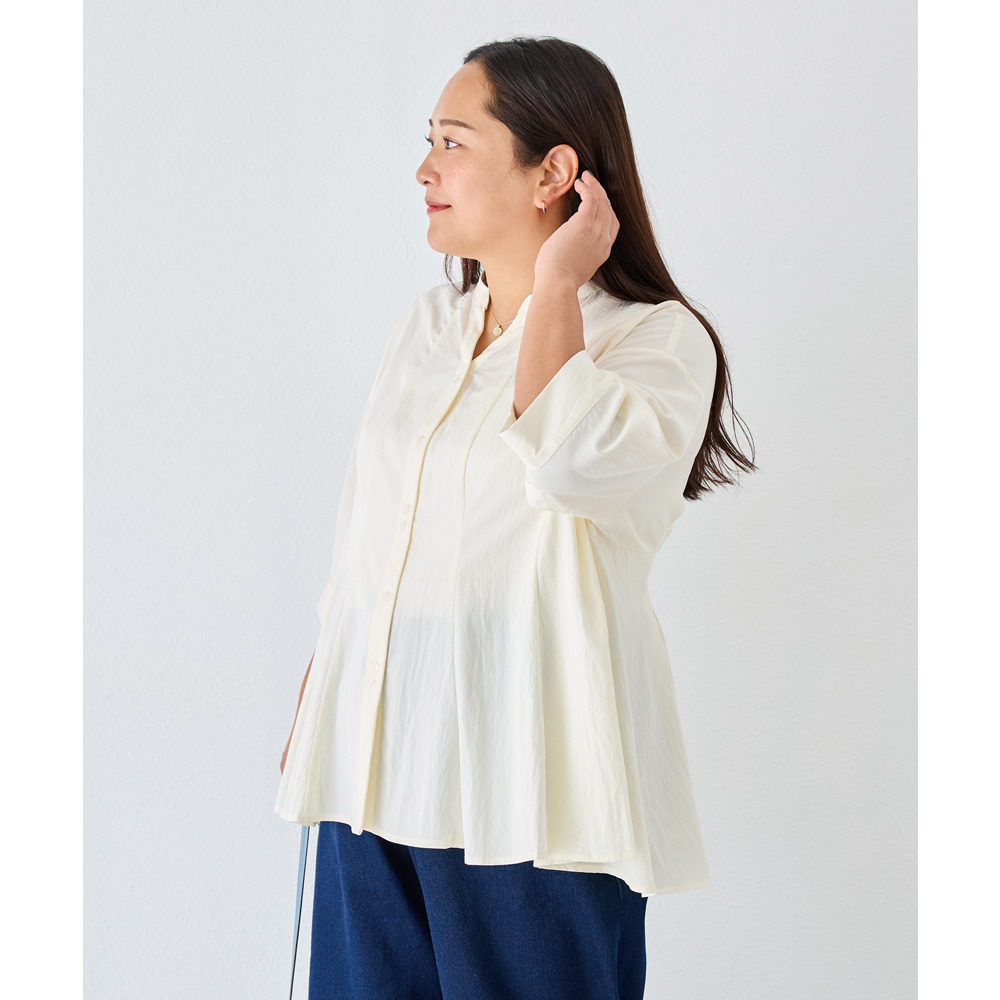 フロントに施されたタックと背中のウエストギャザーが縦のラインを強調し、アウトスタイルでもスッキリと決まります。合わせるボトム次第で、きれいめからカジュアルまで自分らしいアレンジを楽しめる万能アイテムです。