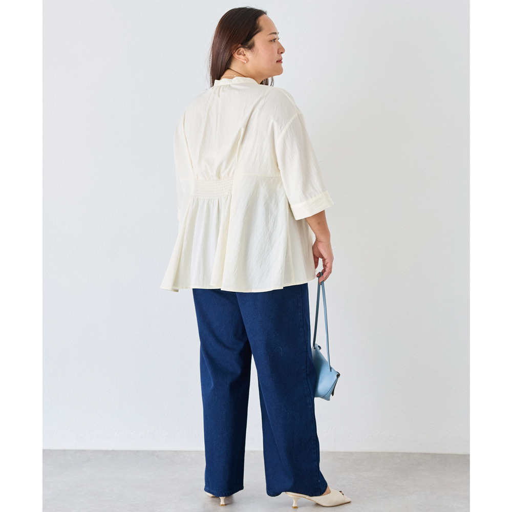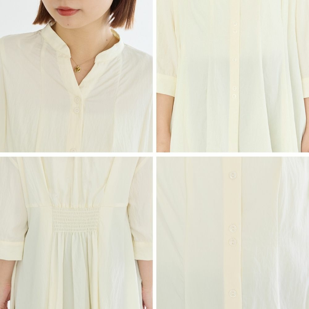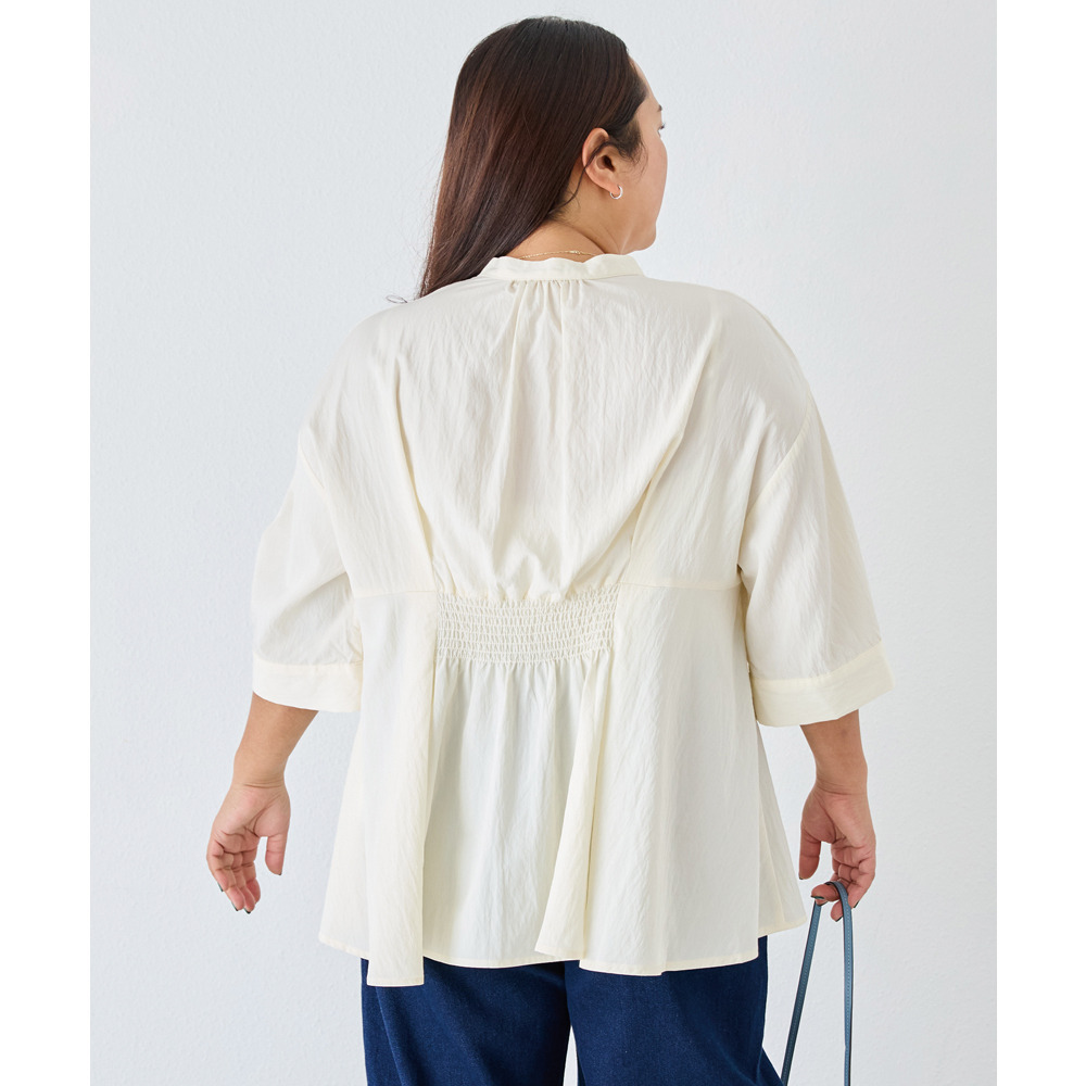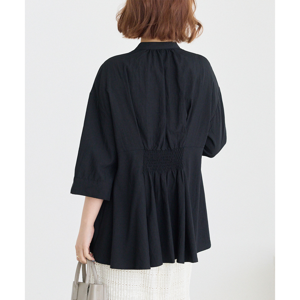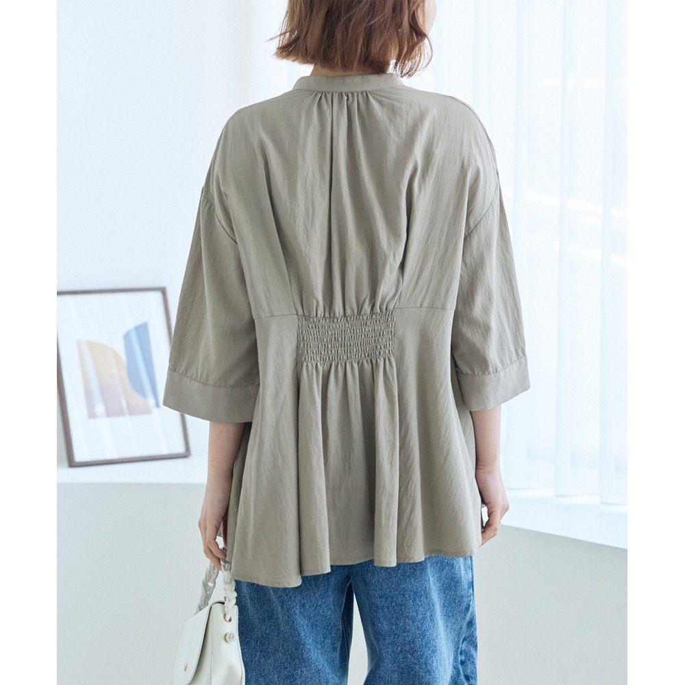スッキリとしたVネックに、ボタンデザインや袖のタック、後ろのギャザーゴムが生み出す立体的なシルエットがポイントです。