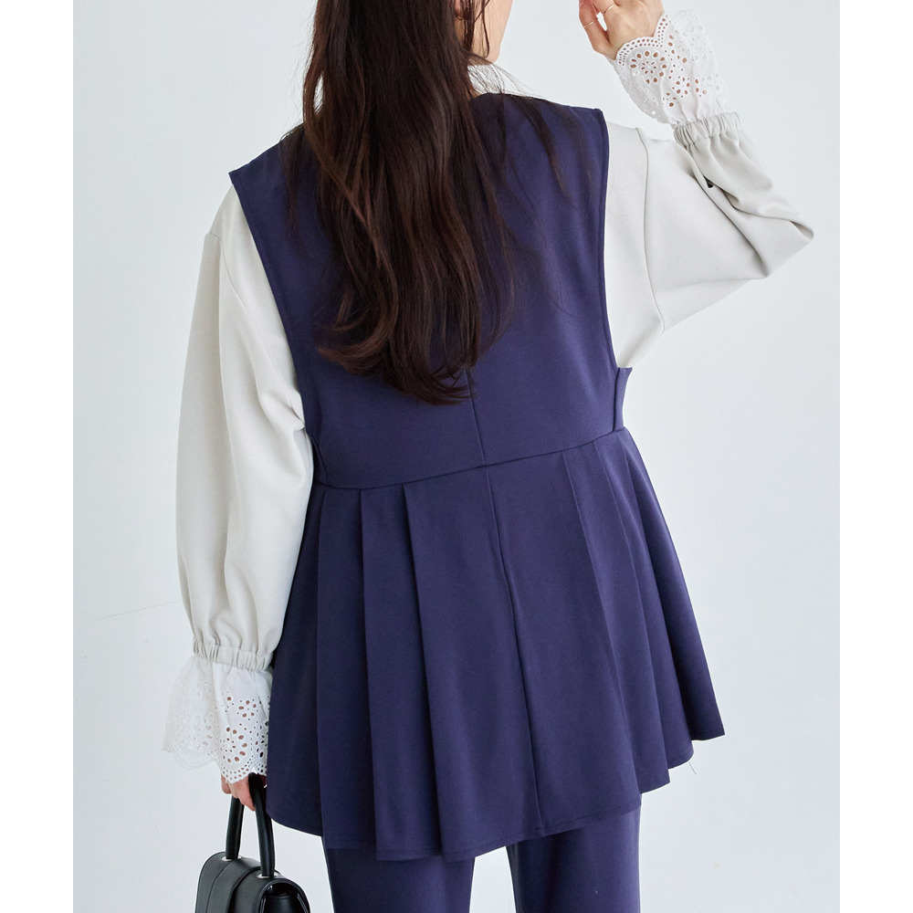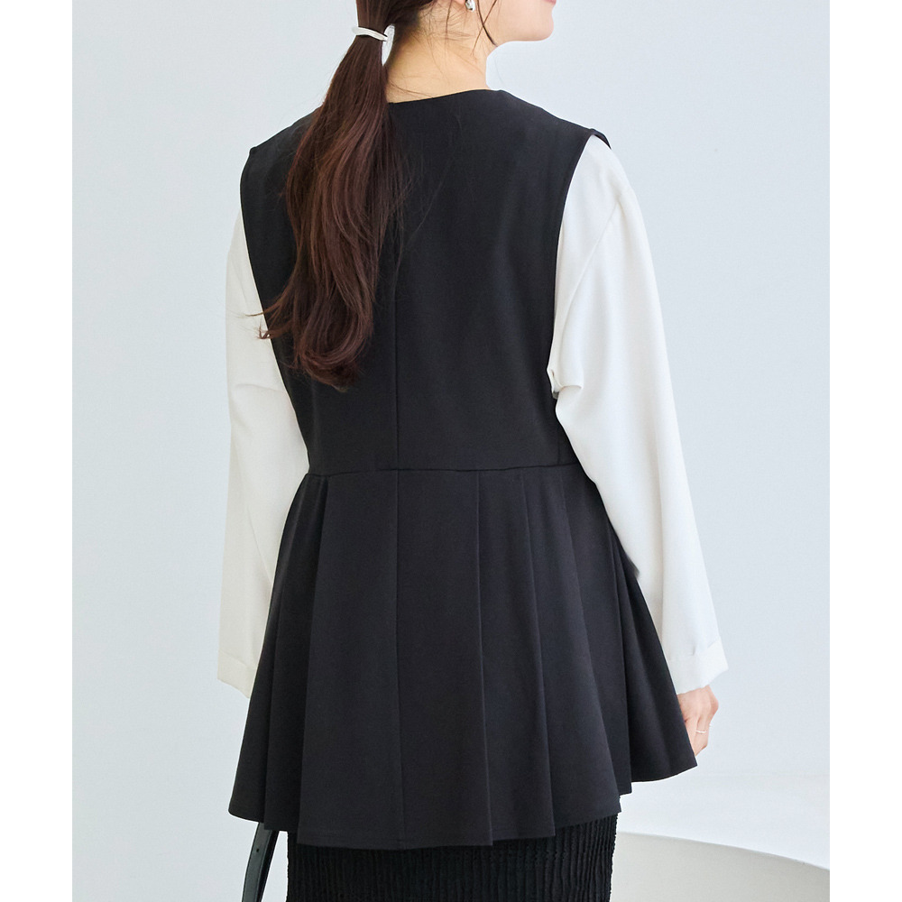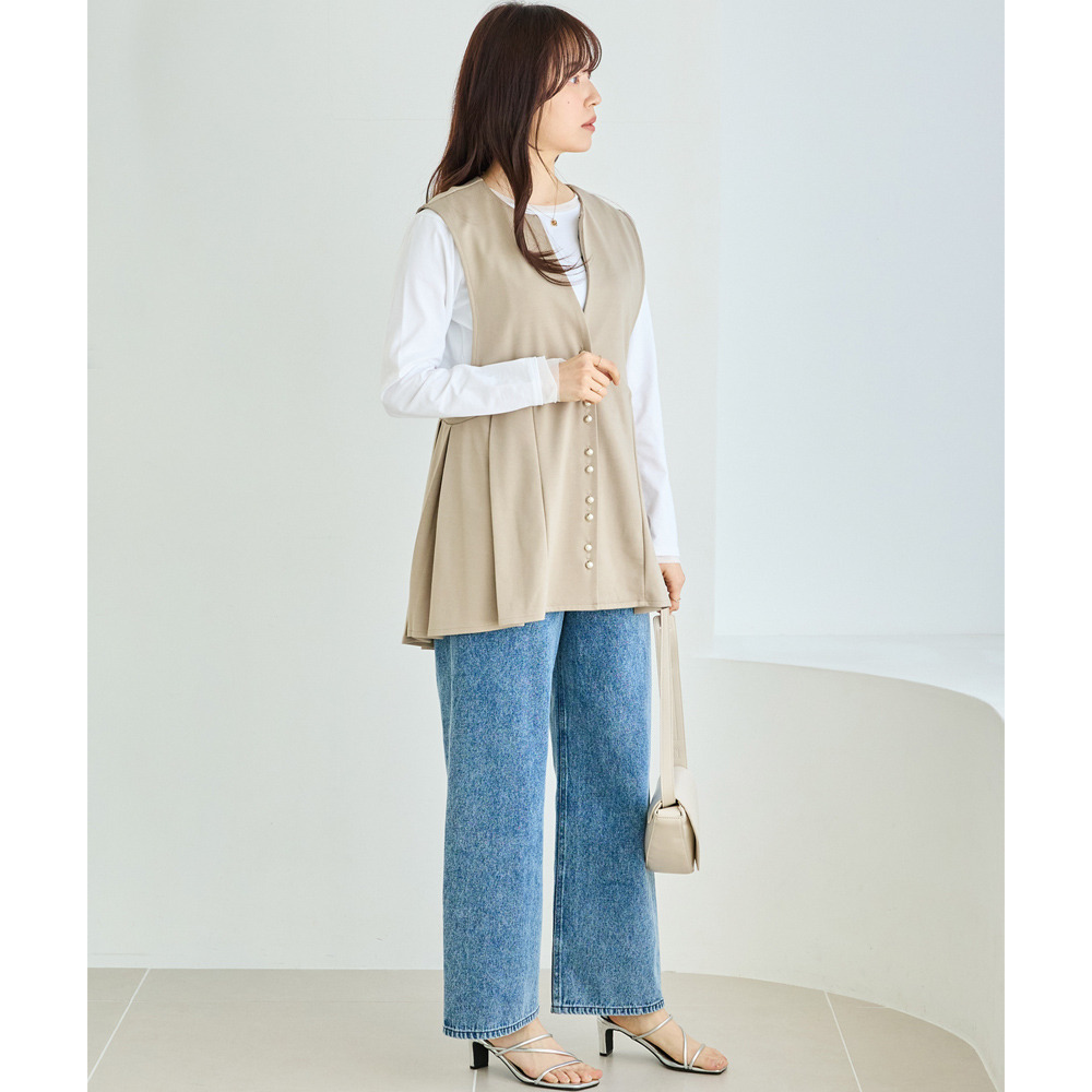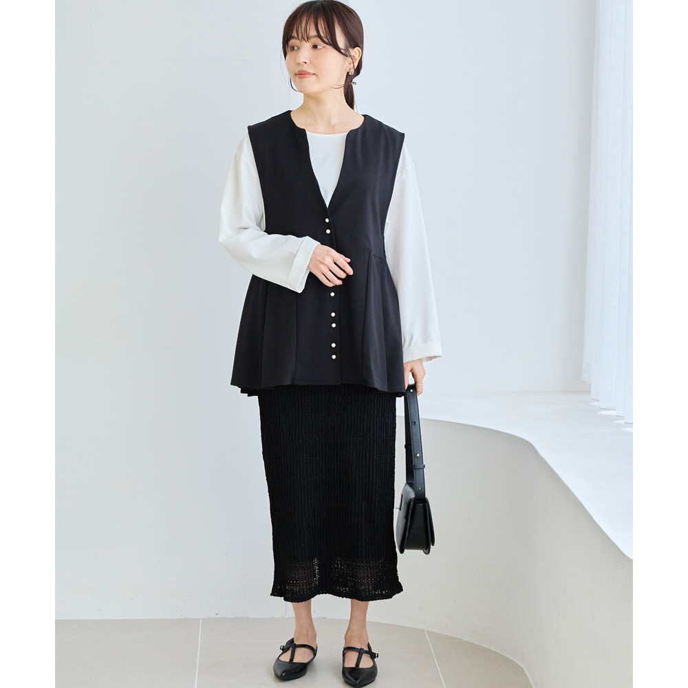 キーネックとパールボタンが、上品で洗練された印象を与えます。後ろのタックが動きに合わせて揺れ、女性らしさを演出。