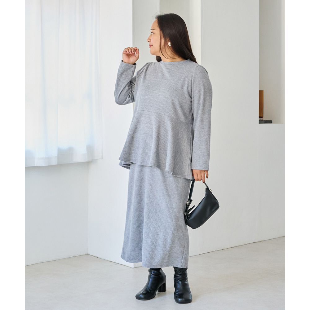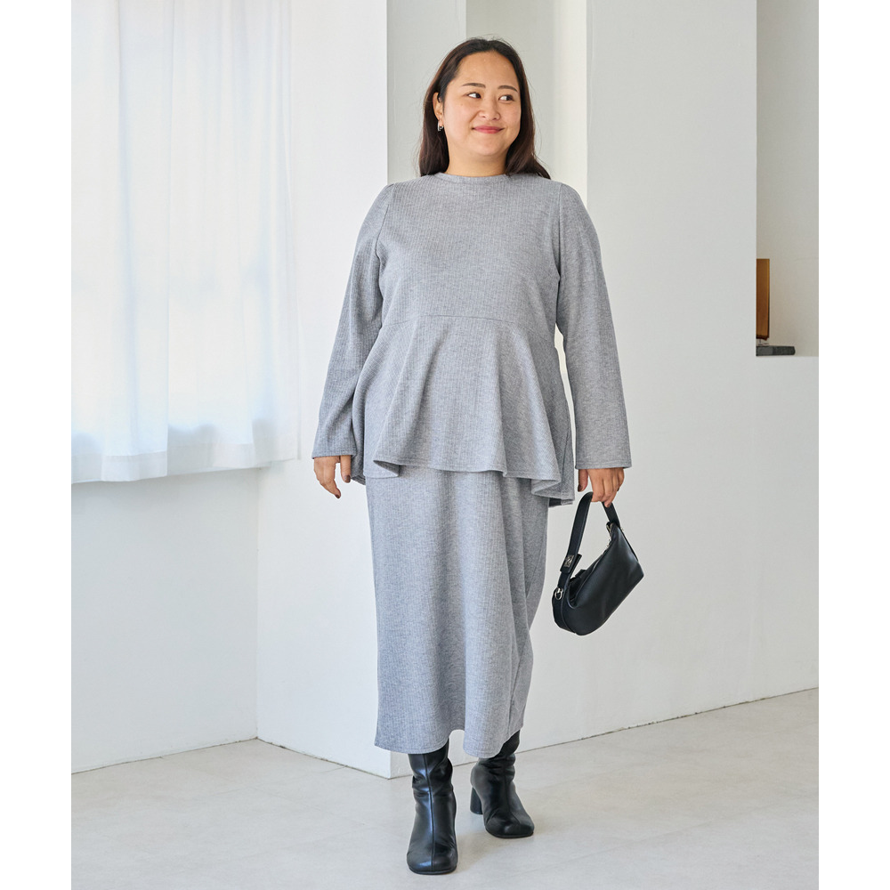 トップスは女性らしいペプラムシルエット、スカートはタイトなナロースカートで、メリハリのある上品なシルエットに。