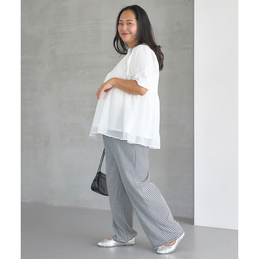 チュールを切り替えた甘めのトップスなので、ワイドパンツやカジュアルなデニムなど甘くなり過ぎないアイテムとのコーディネートがオススメです。