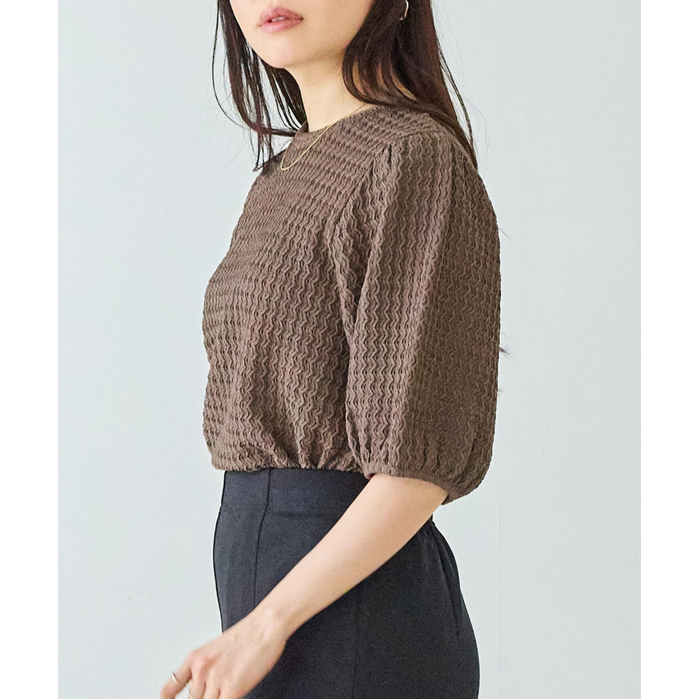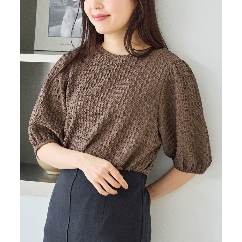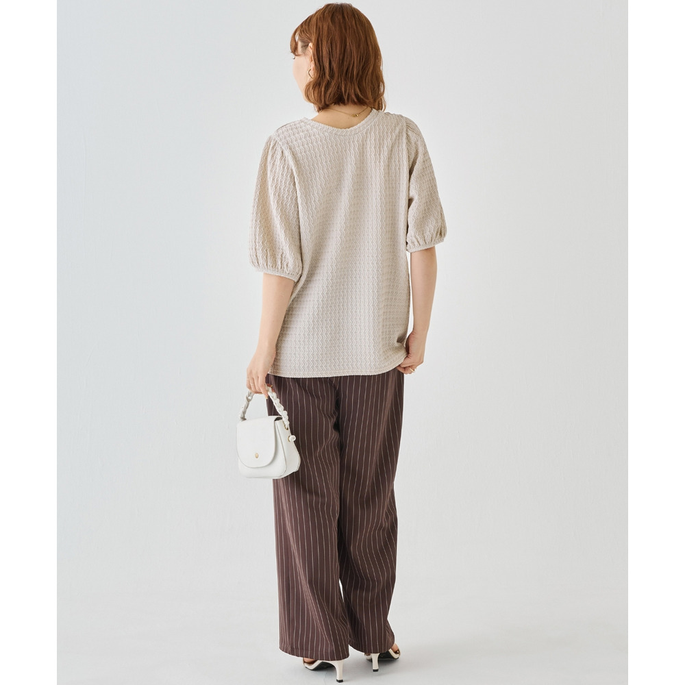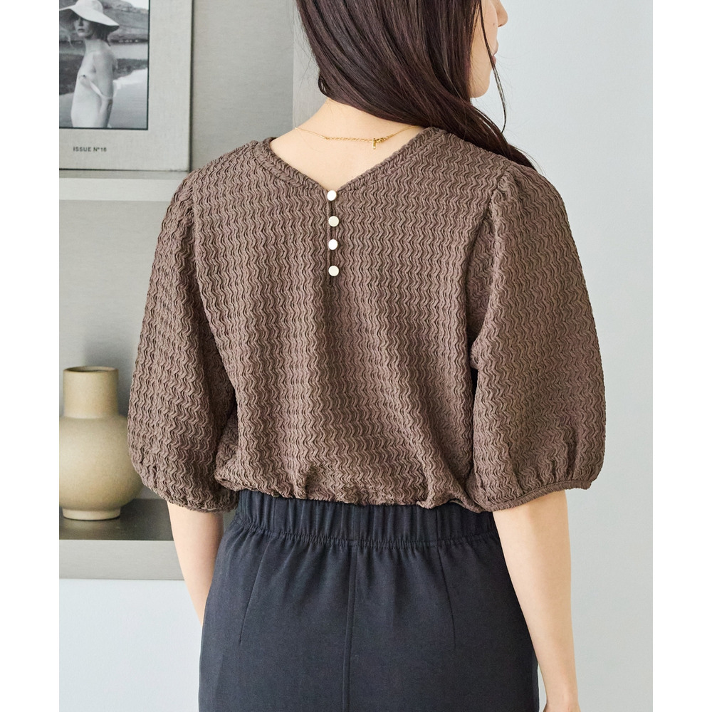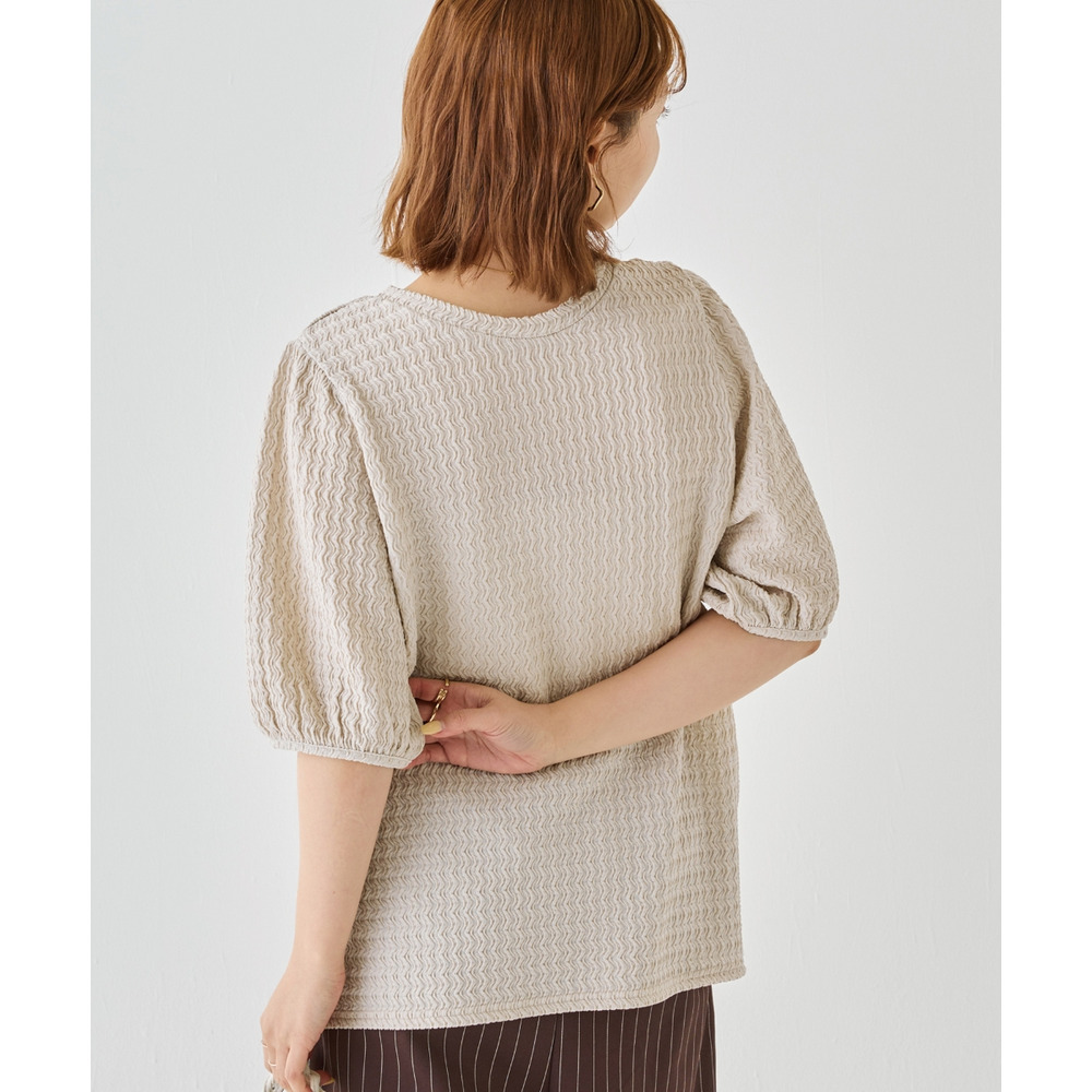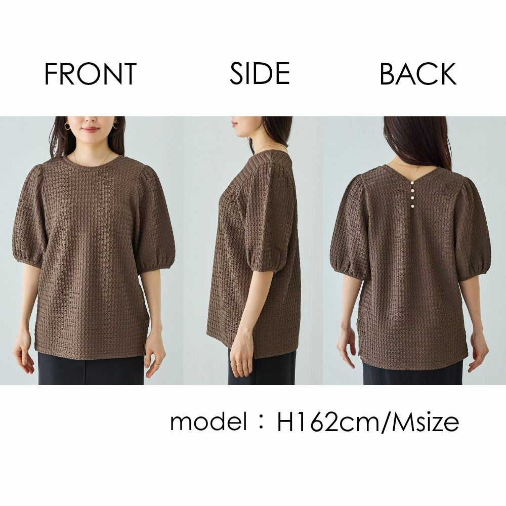 ややパフスリーブが、程よいボリュームで女性らしい柔らかな印象を演出し、立体感のあるシルエットに仕上げています。