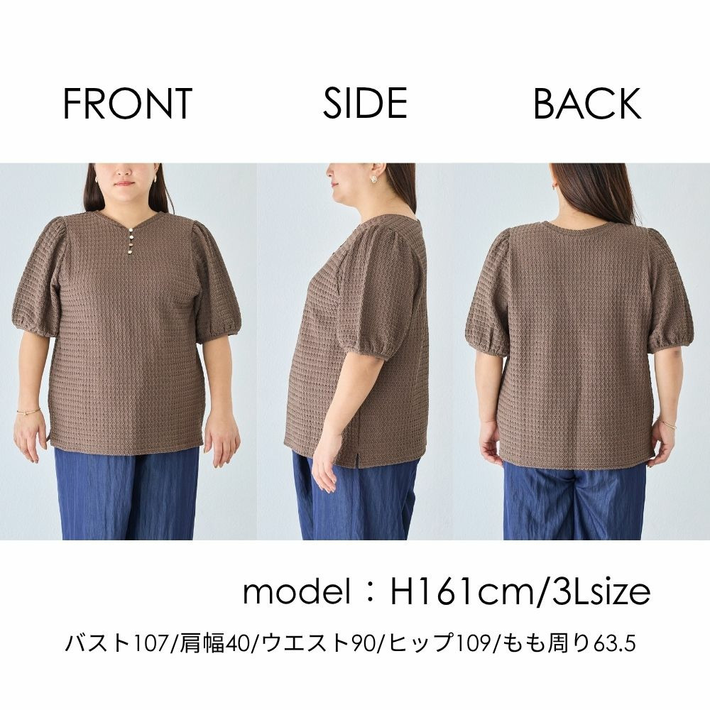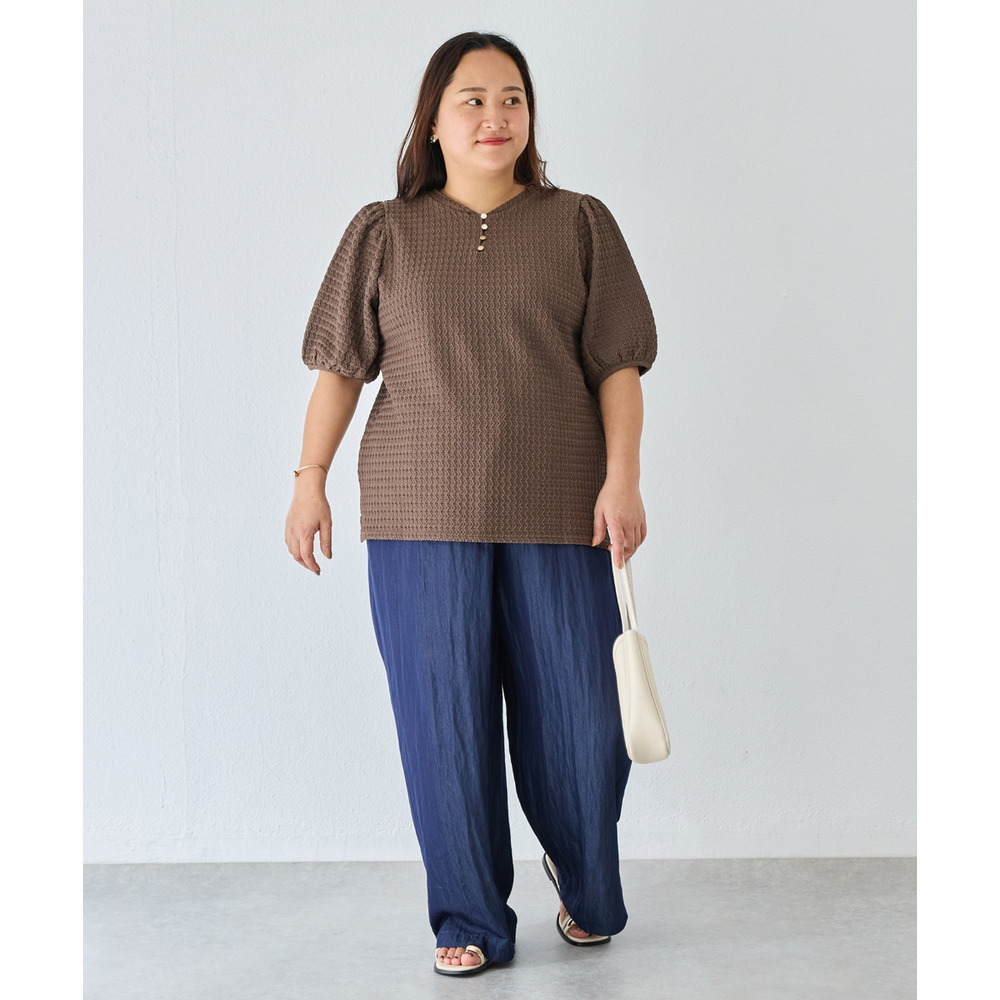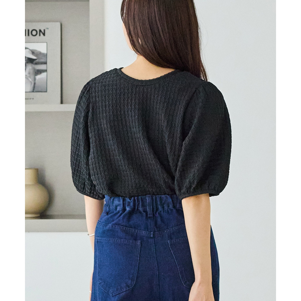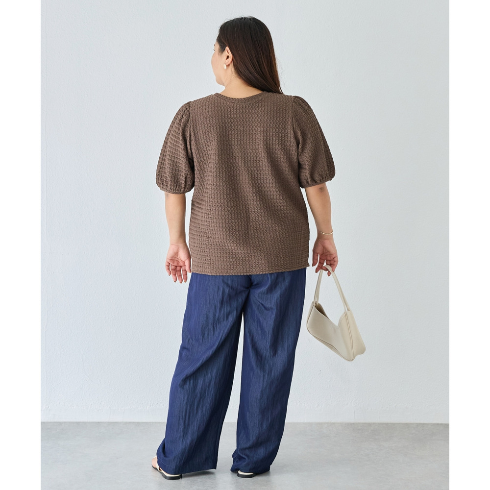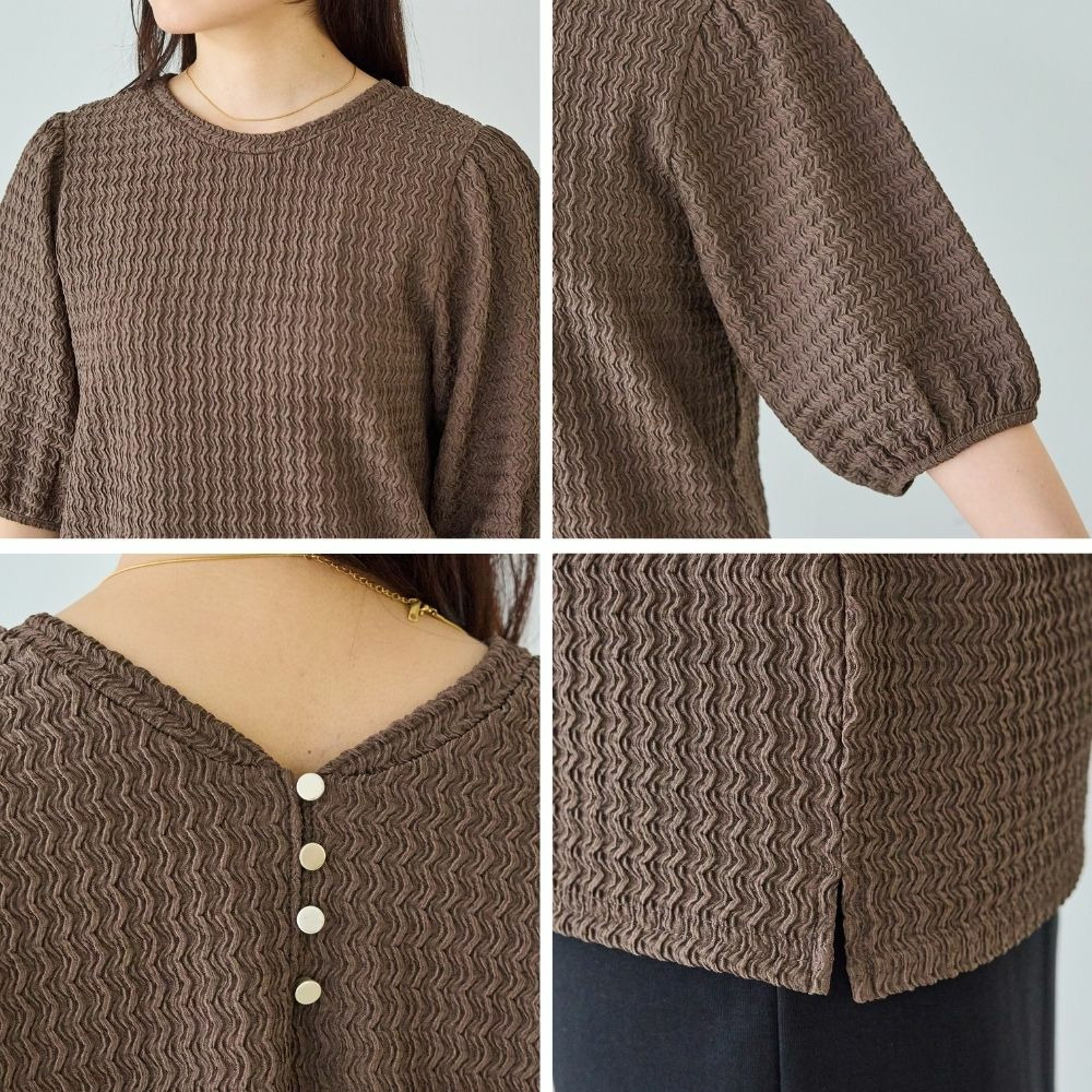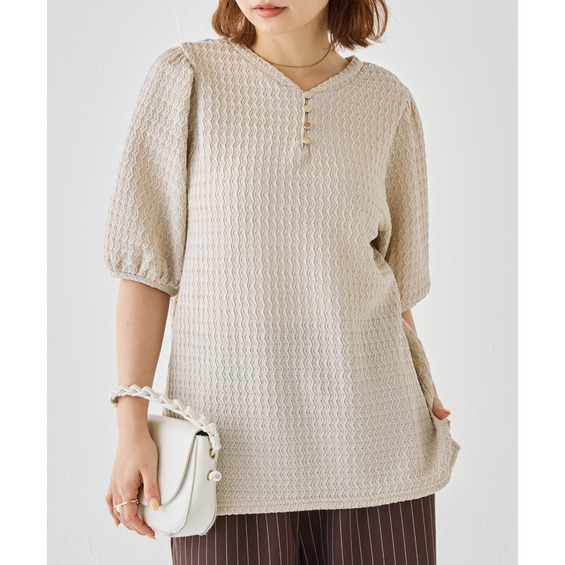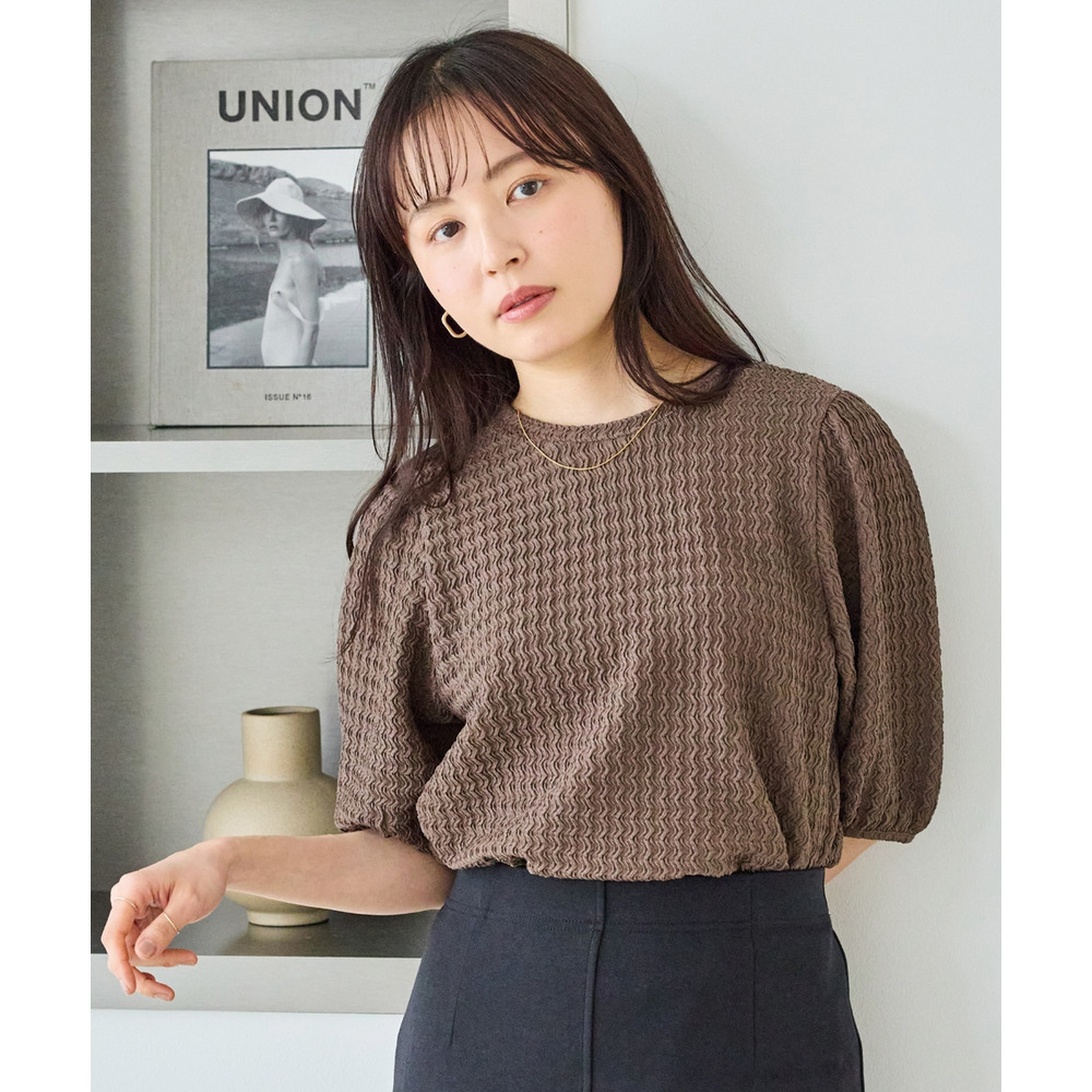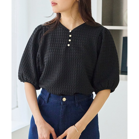ややパフスリーブが、程よいボリュームで女性らしい柔らかな印象を演出し、立体感のあるシルエットに仕上げています。