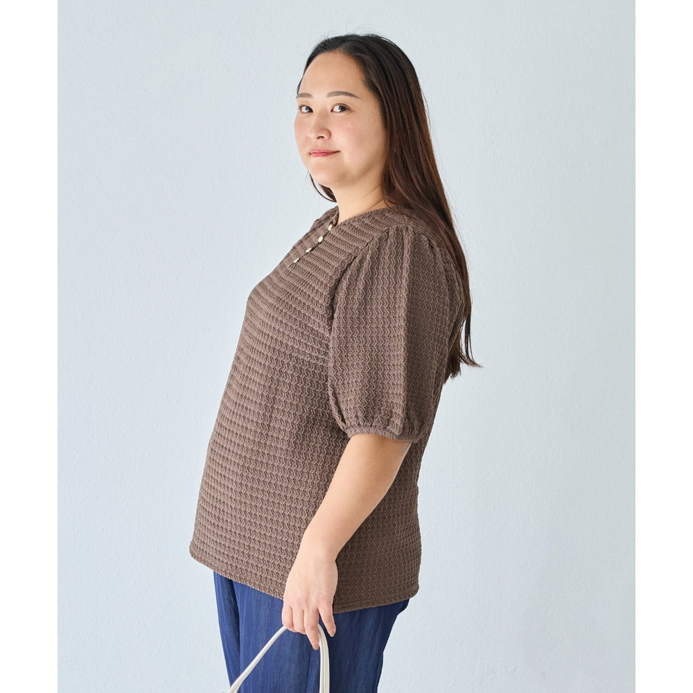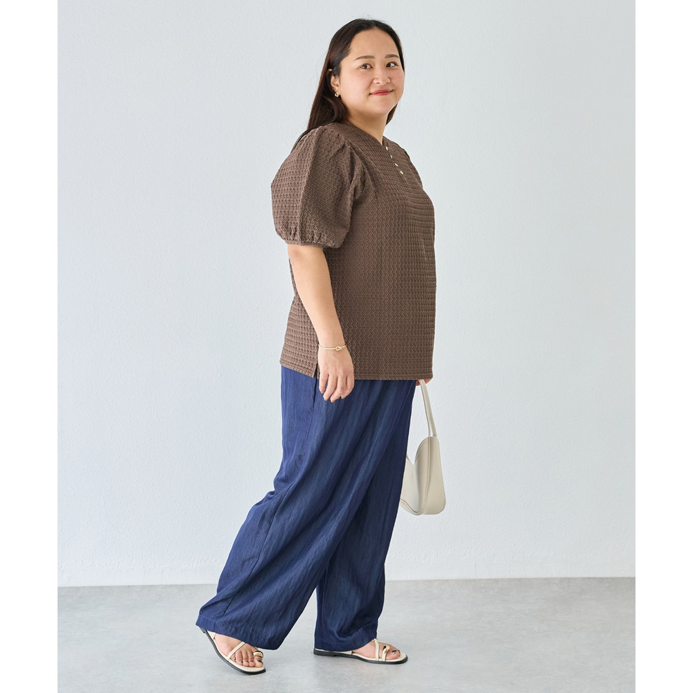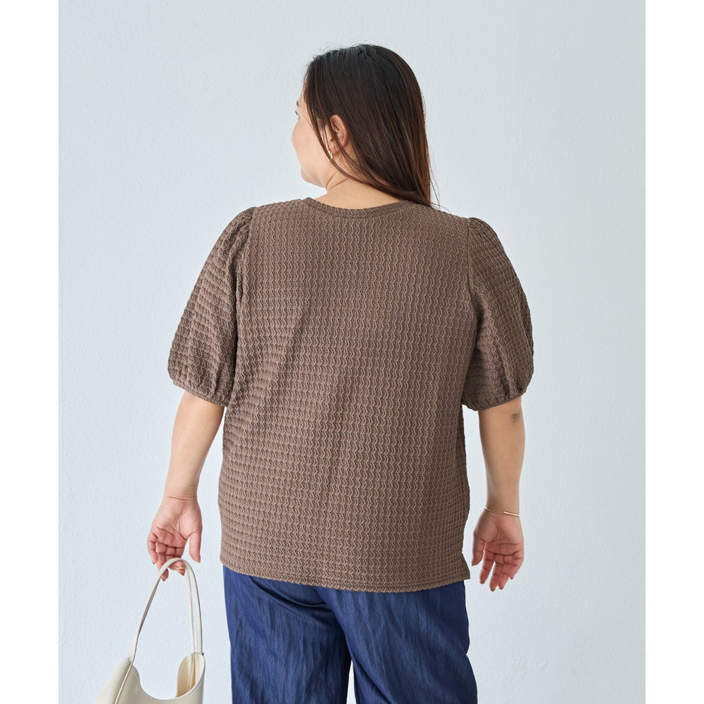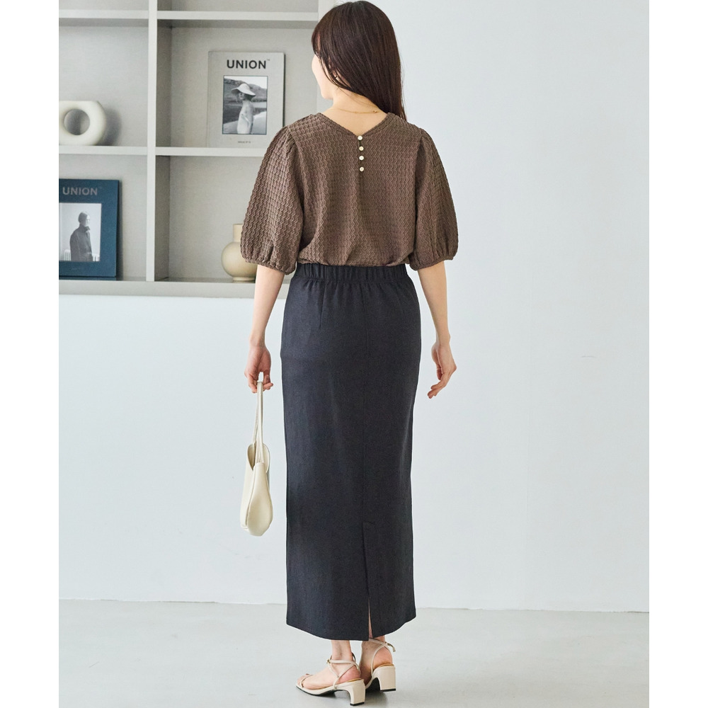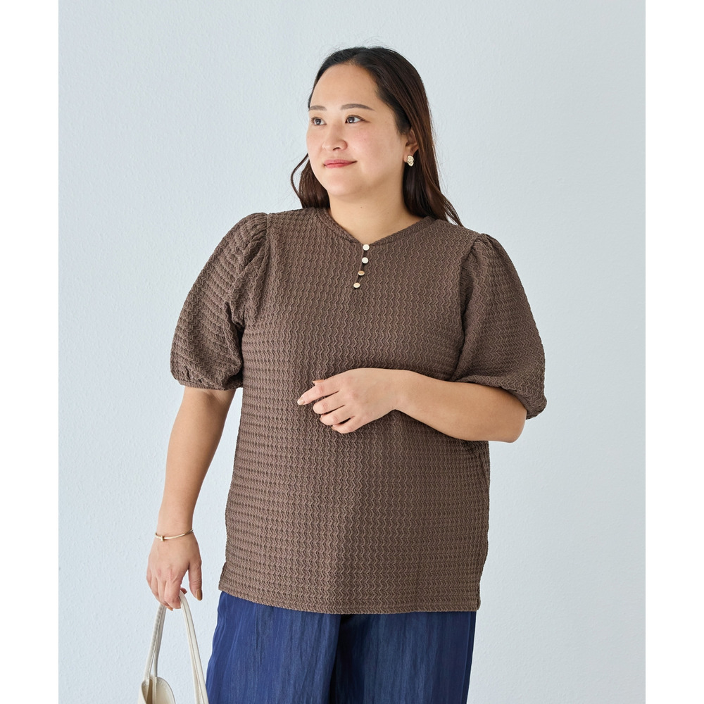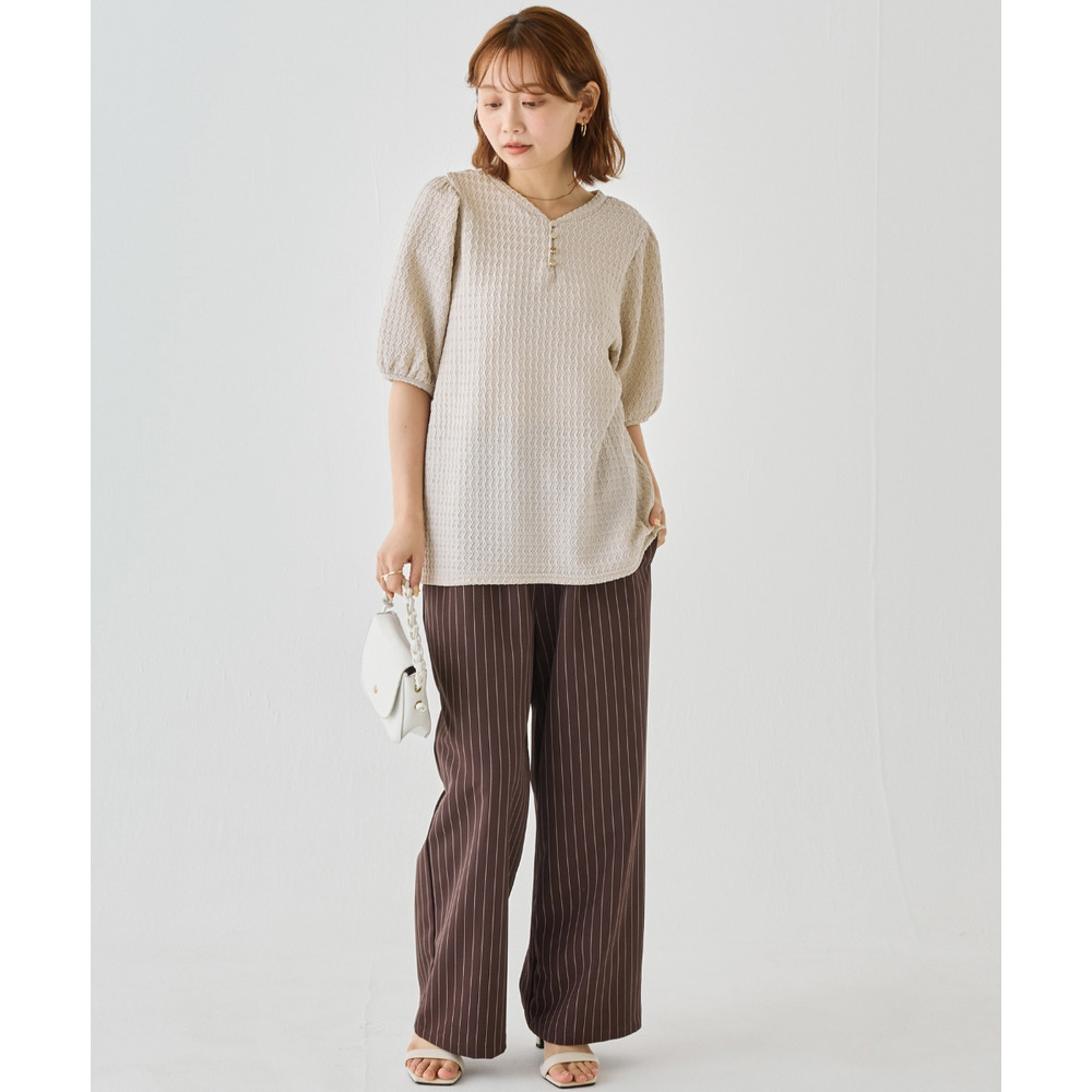 ややパフスリーブが、程よいボリュームで女性らしい柔らかな印象を演出し、立体感のあるシルエットに仕上げています。