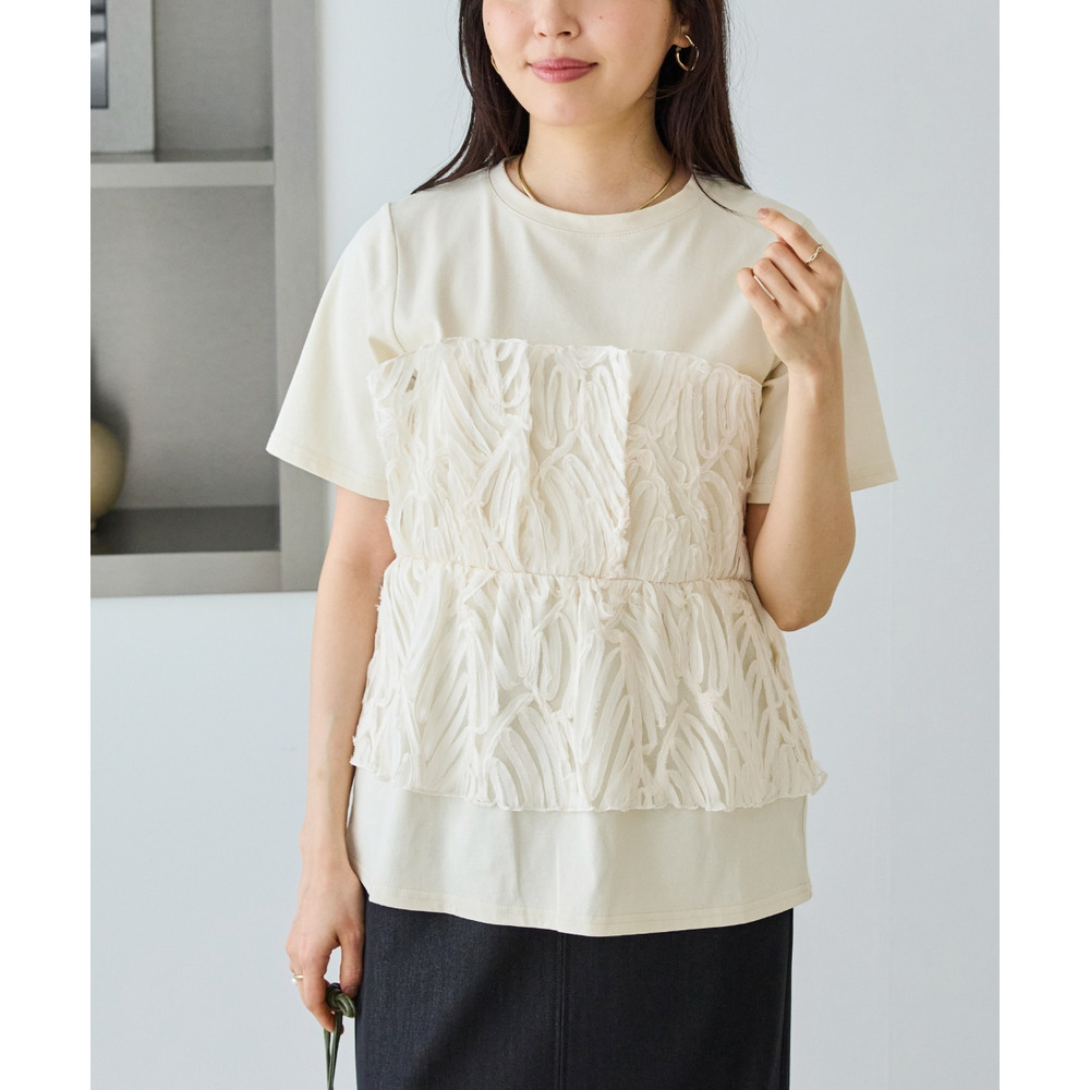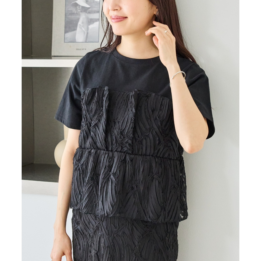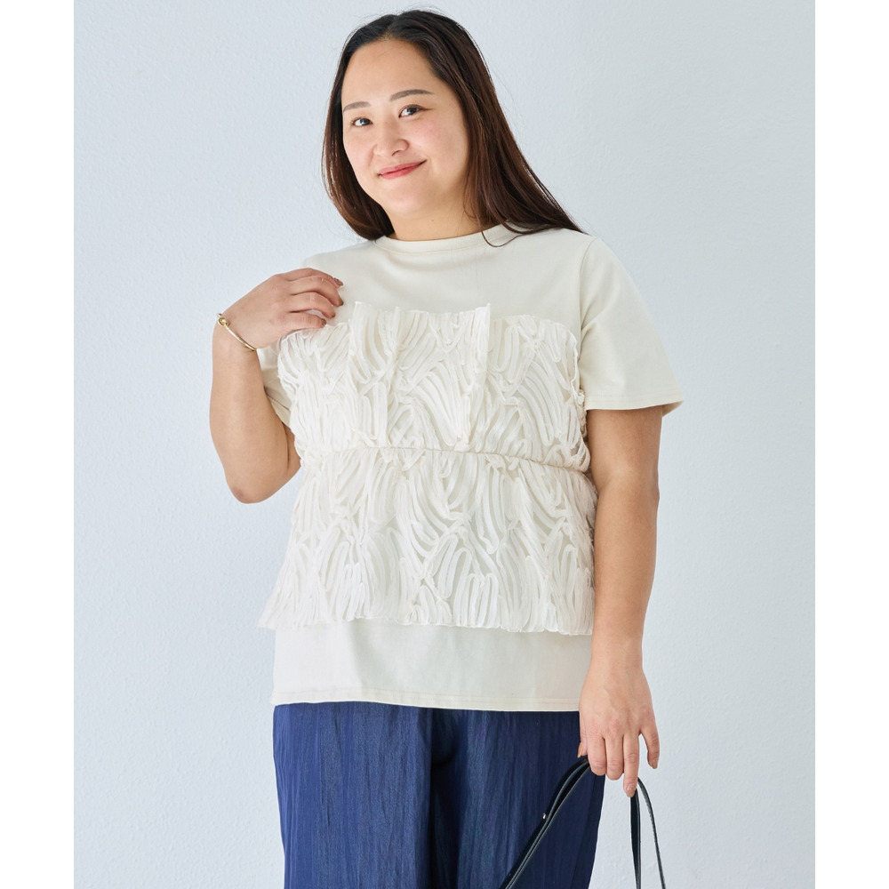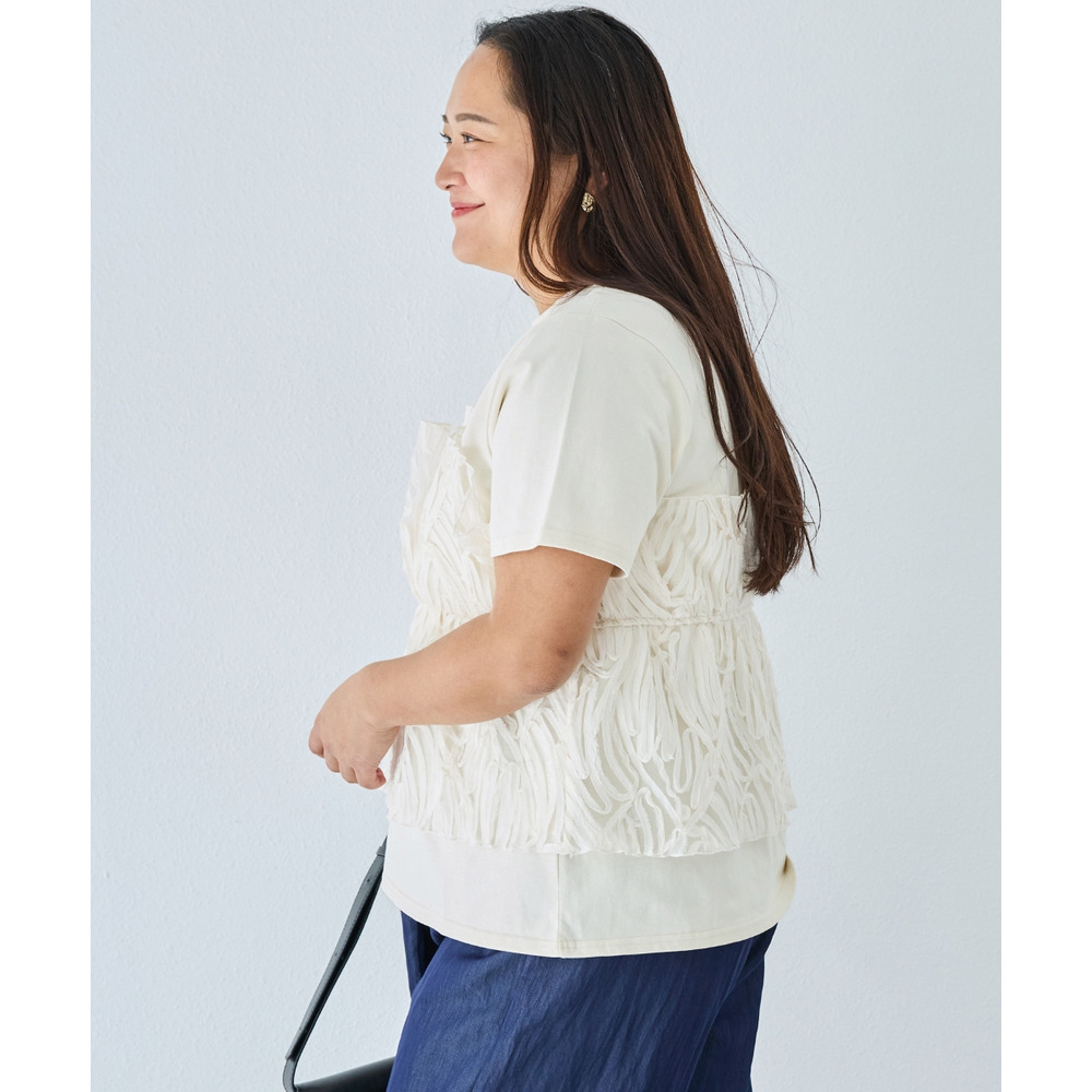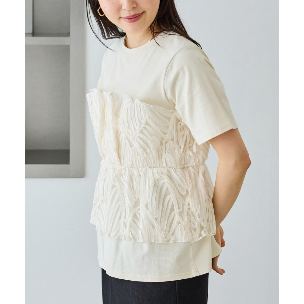 天竺Tシャツに立体感のあるチュールビスチェをドッキングした、着映えするトップス。