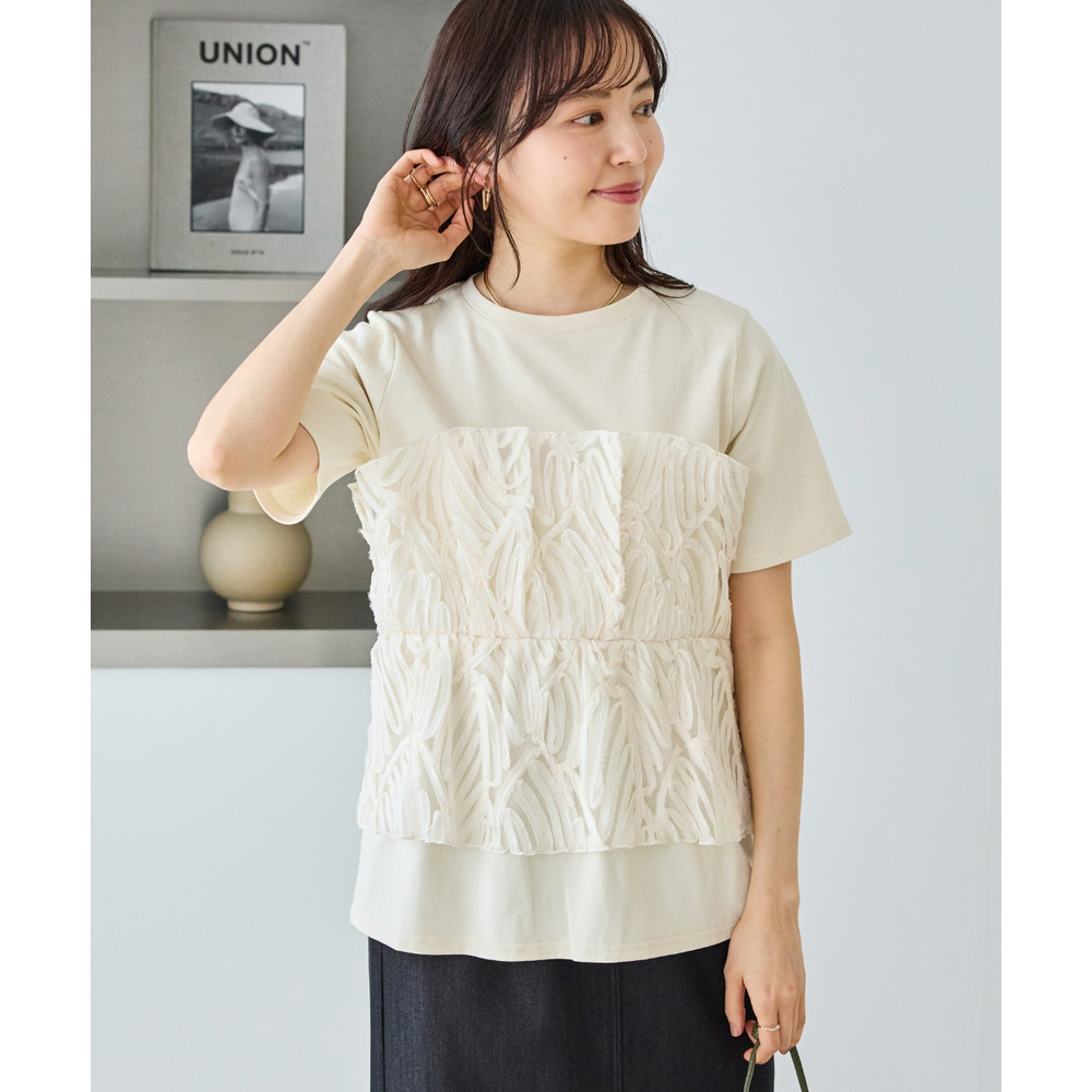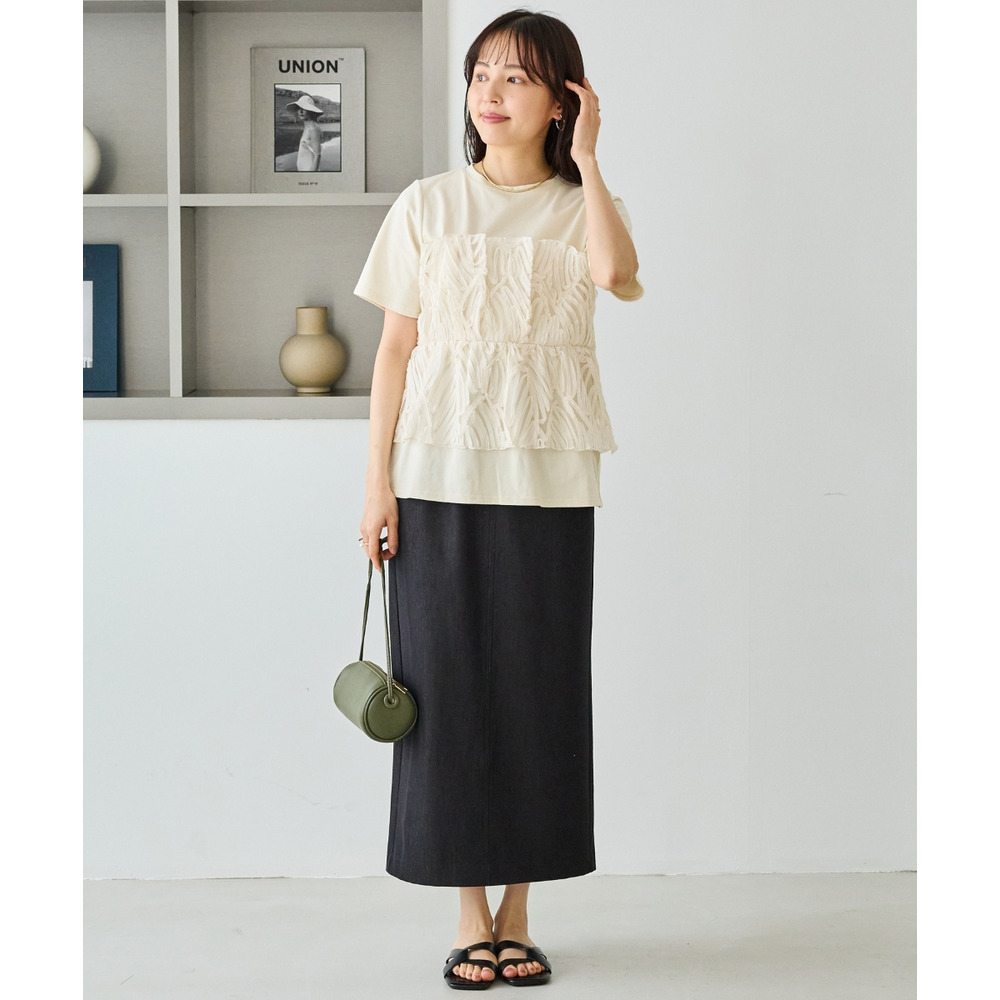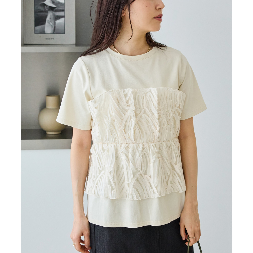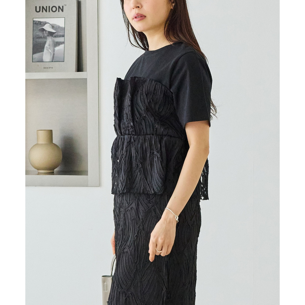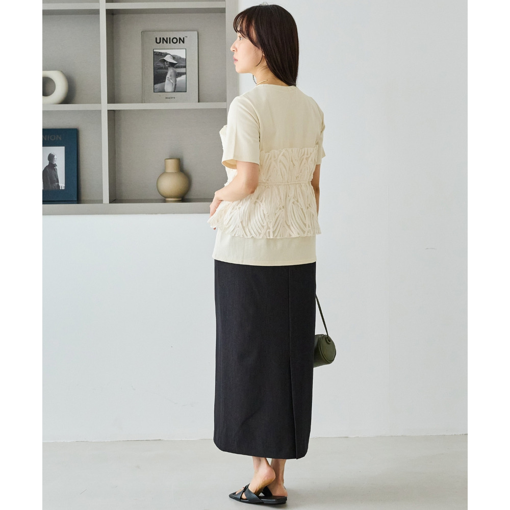 天竺Tシャツに立体感のあるチュールビスチェをドッキングした、着映えするトップス。
