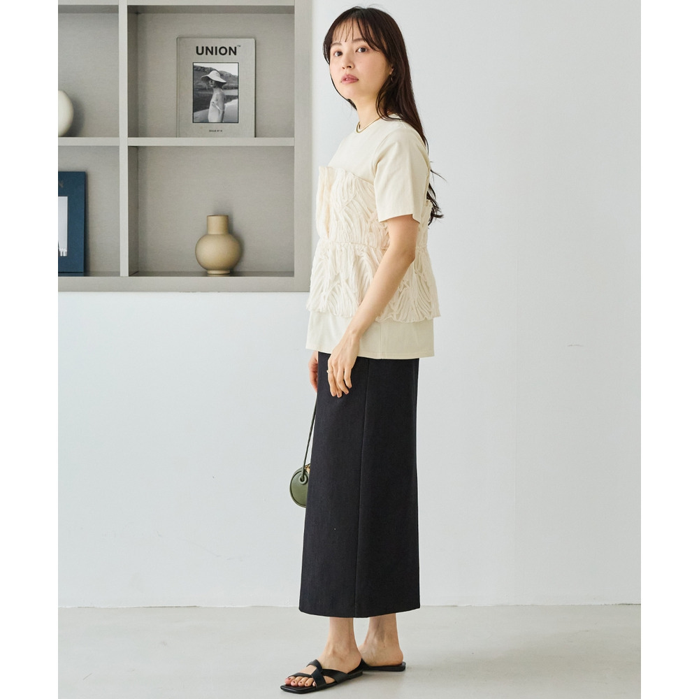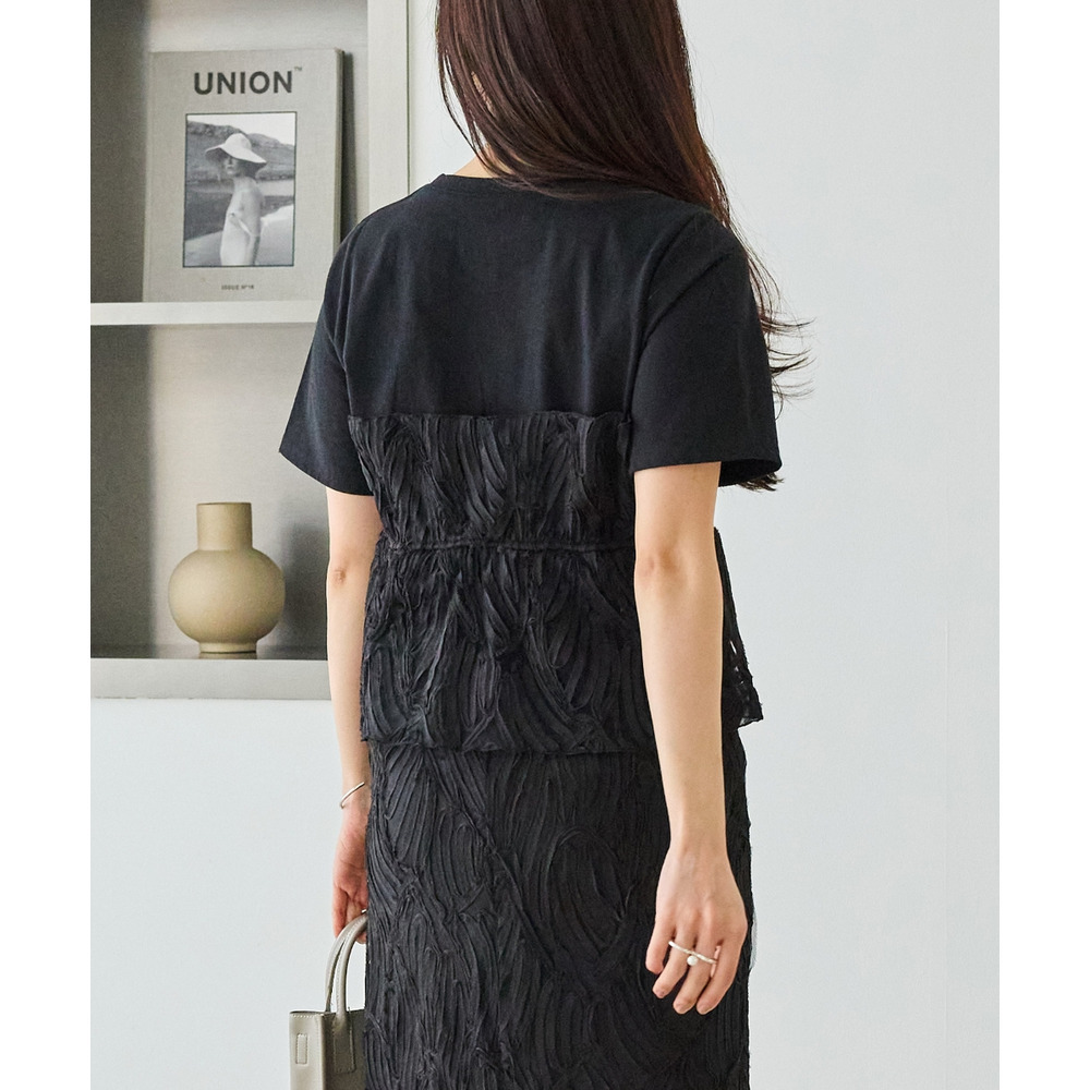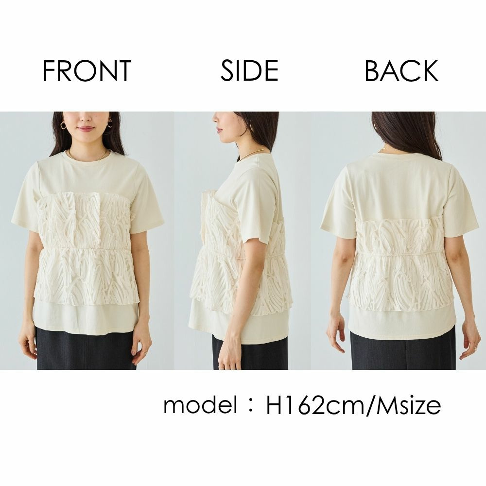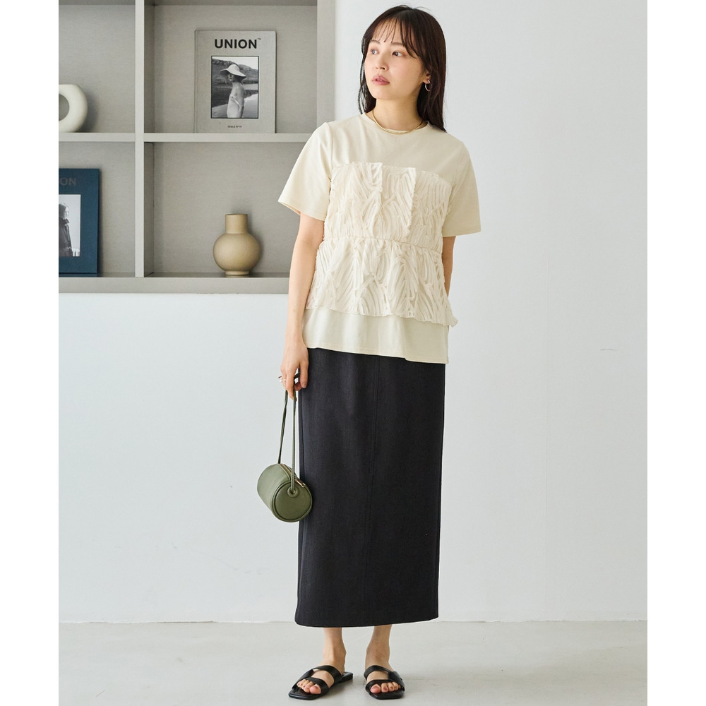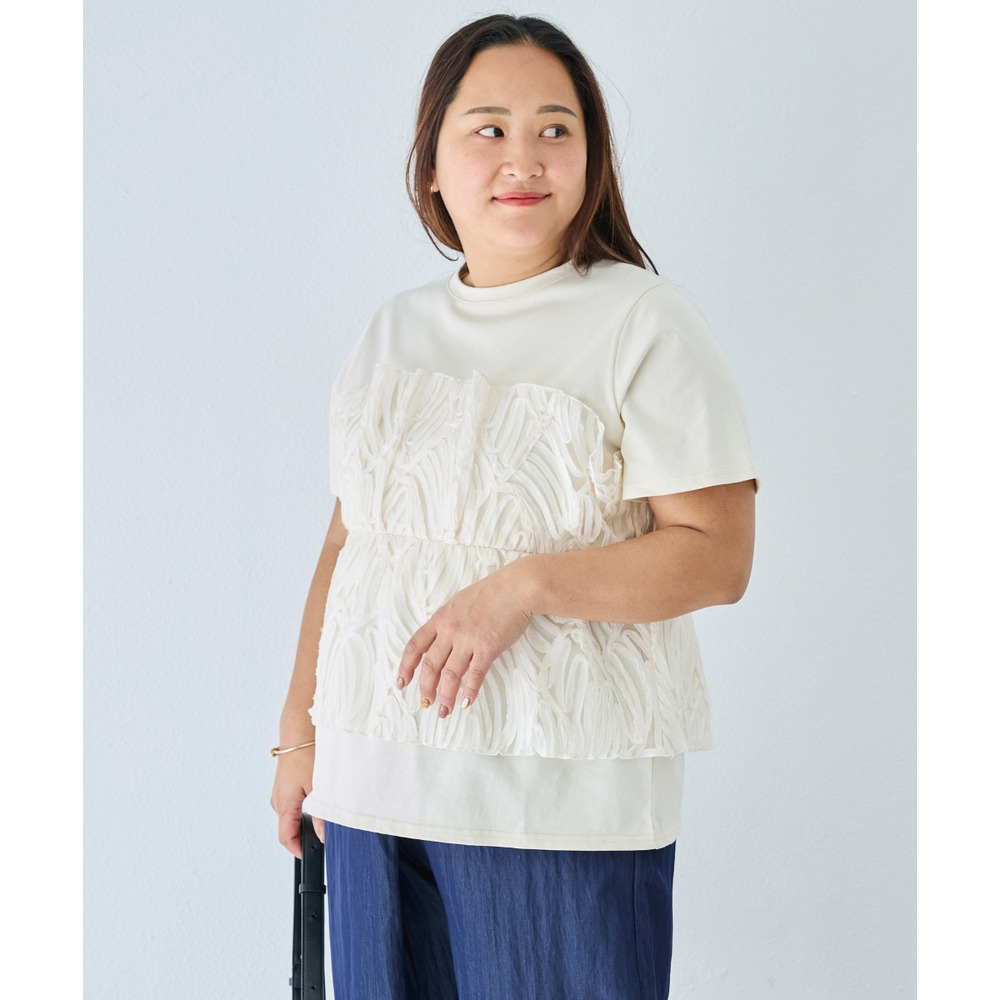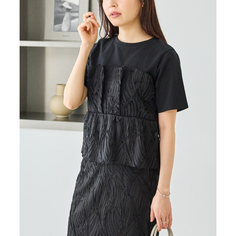 天竺Tシャツに立体感のあるチュールビスチェをドッキングした、着映えするトップス。