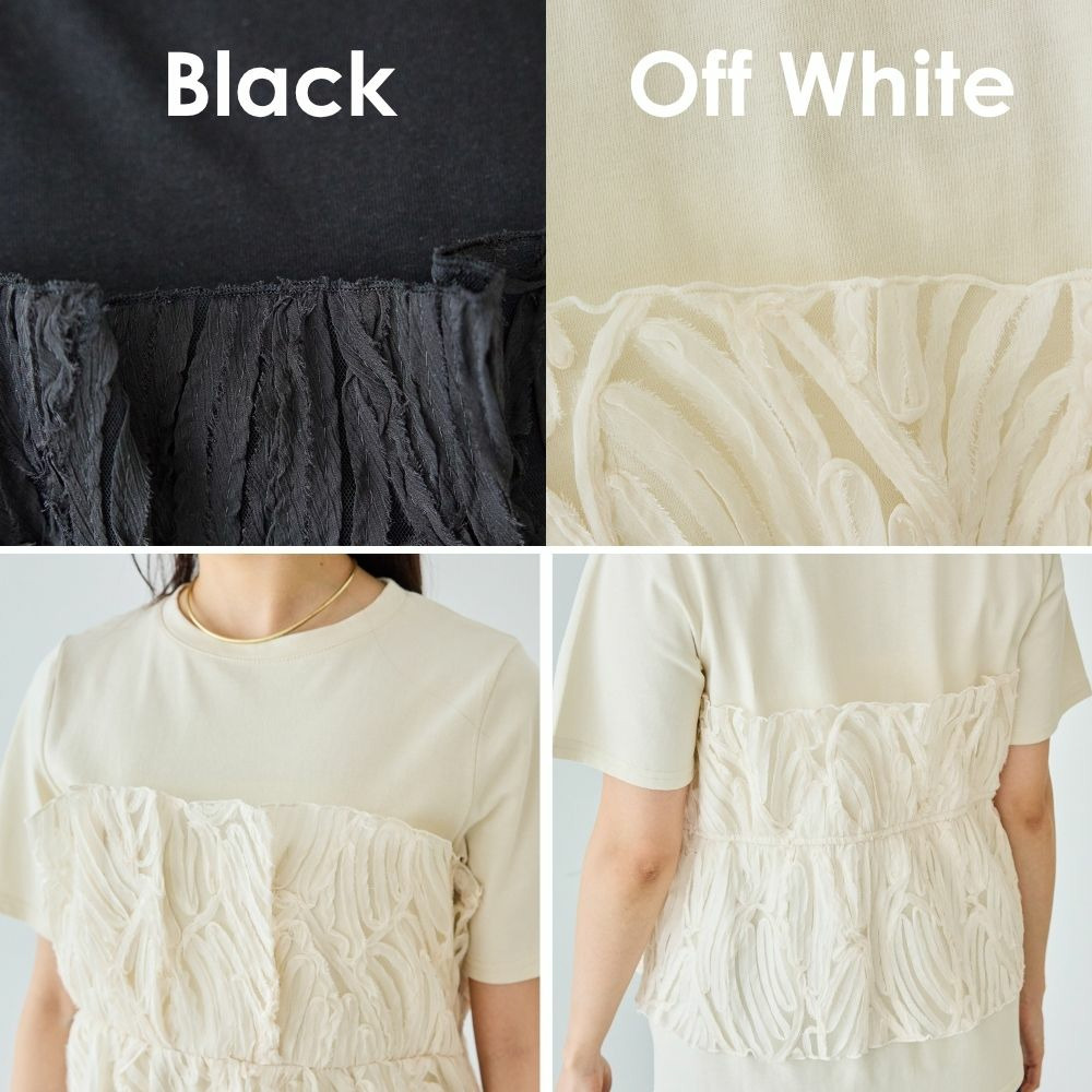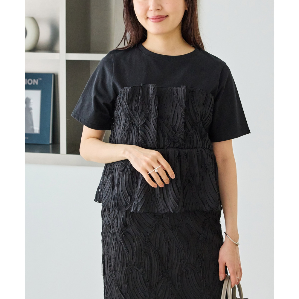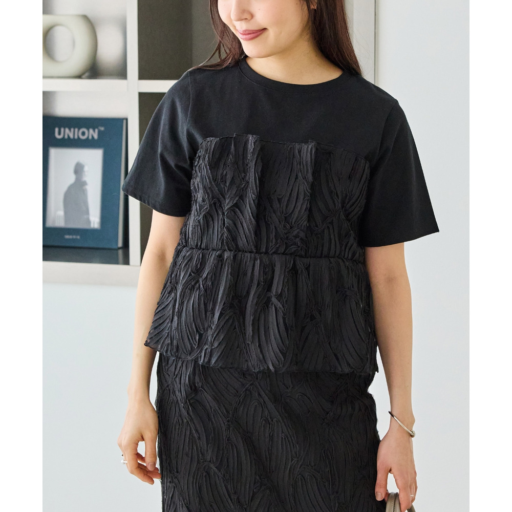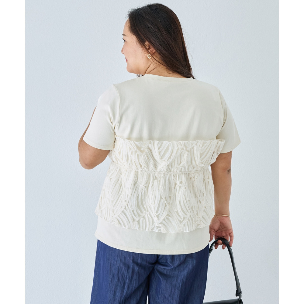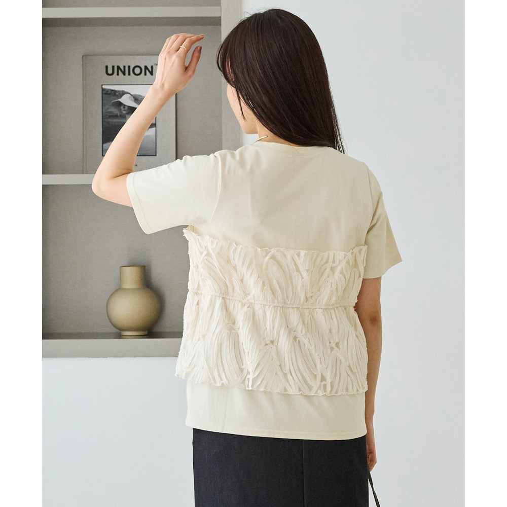 天竺Tシャツに立体感のあるチュールビスチェをドッキングした、着映えするトップス。