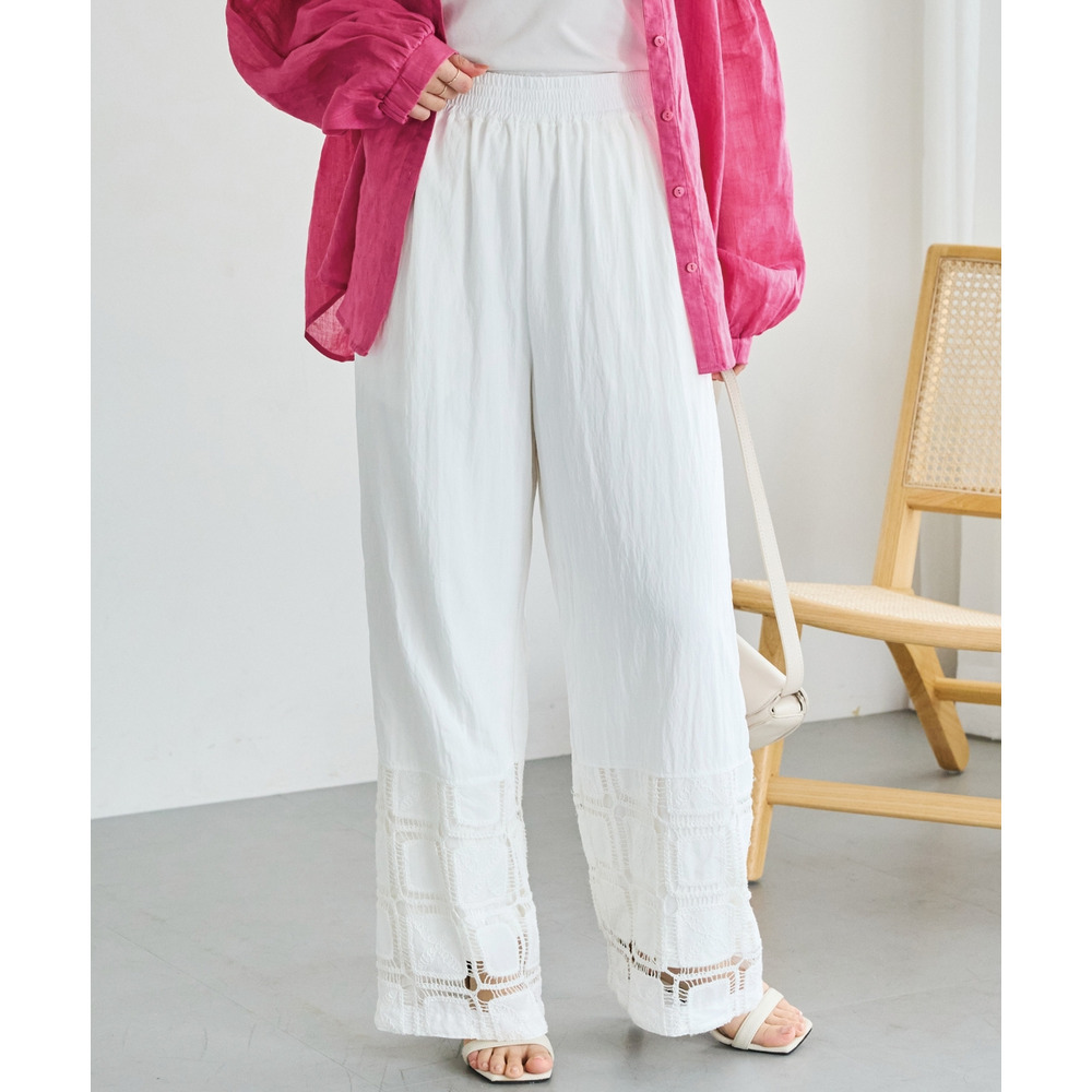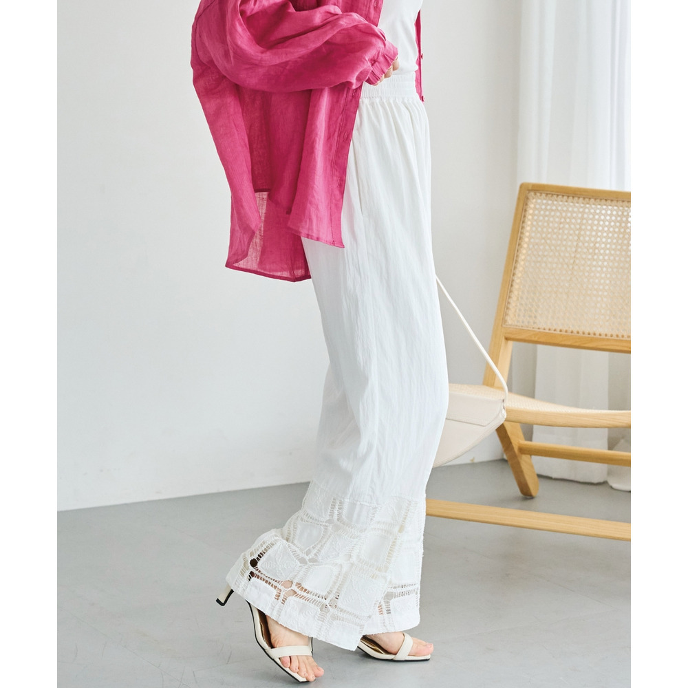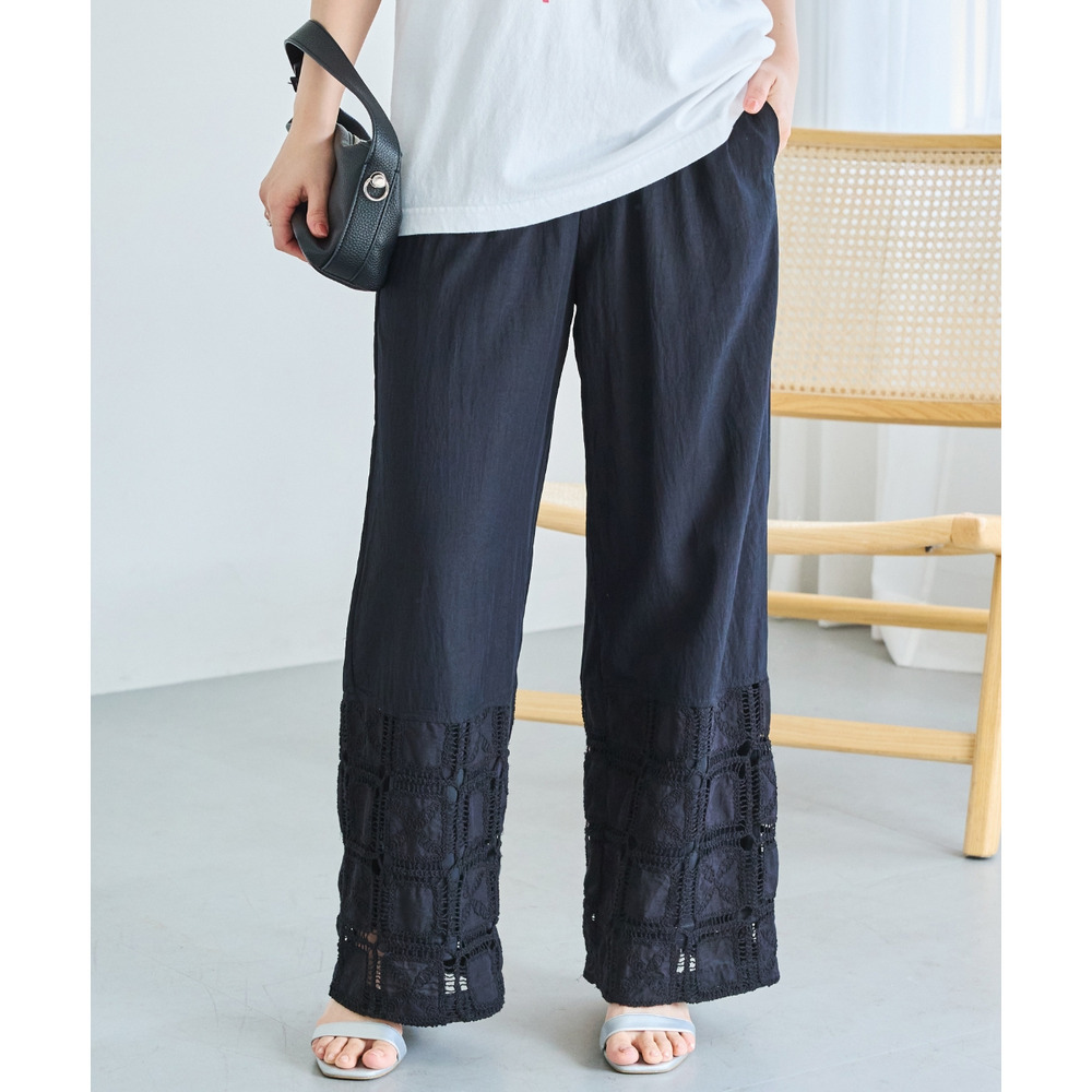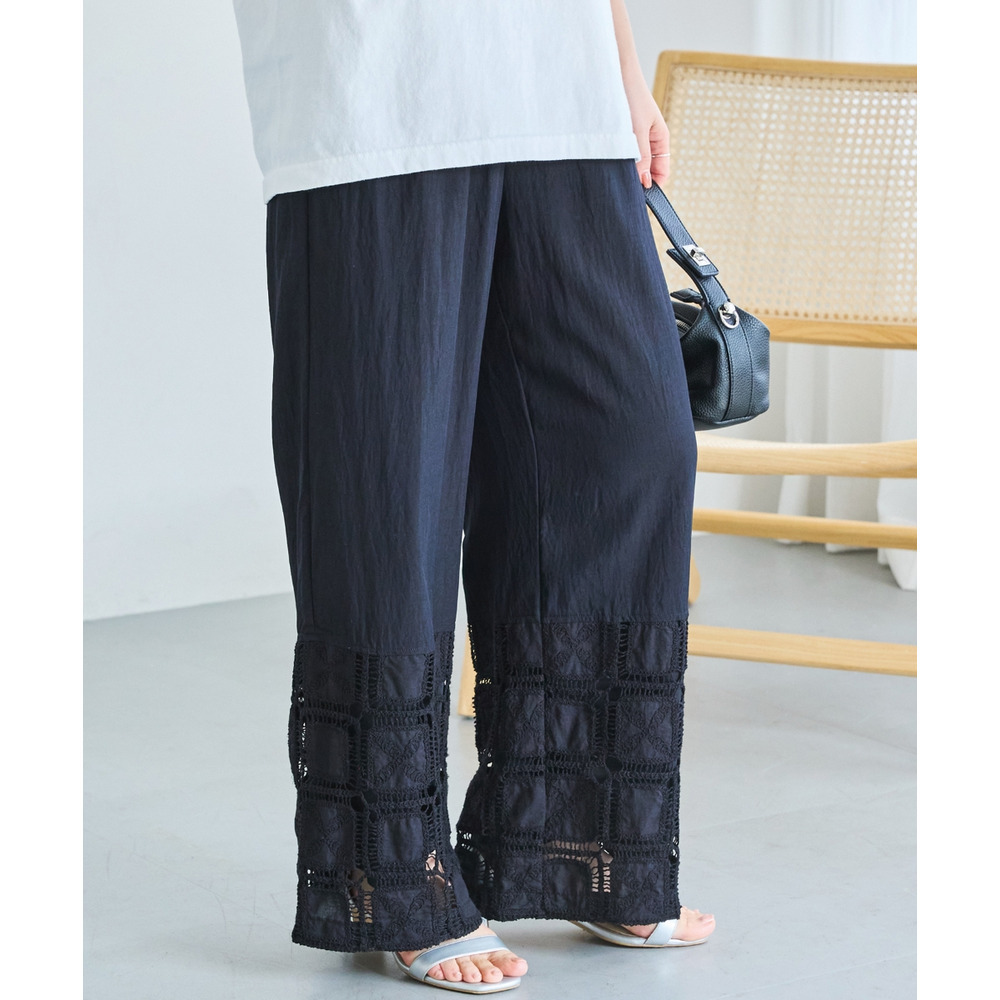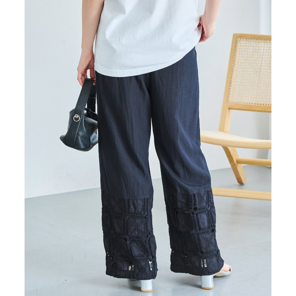 裾にレース切り替えを施した、パッチワーク風デザインが魅力のワイドパンツ。