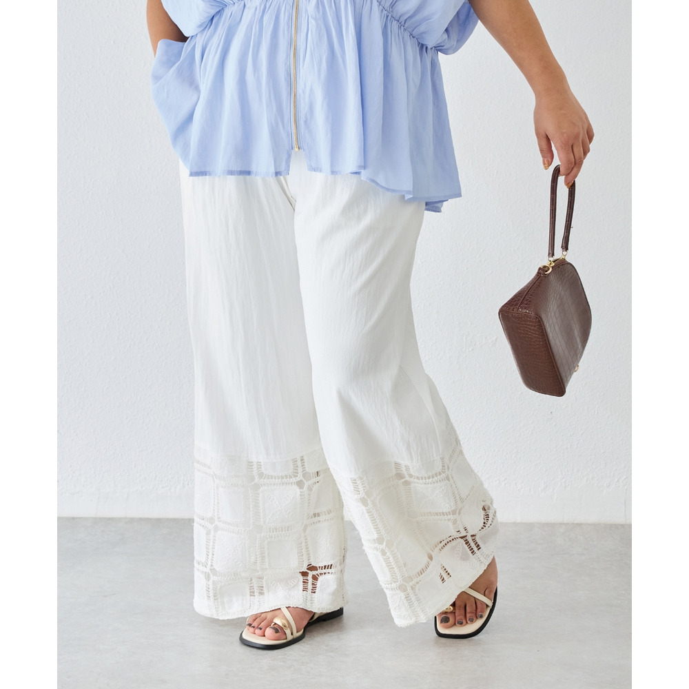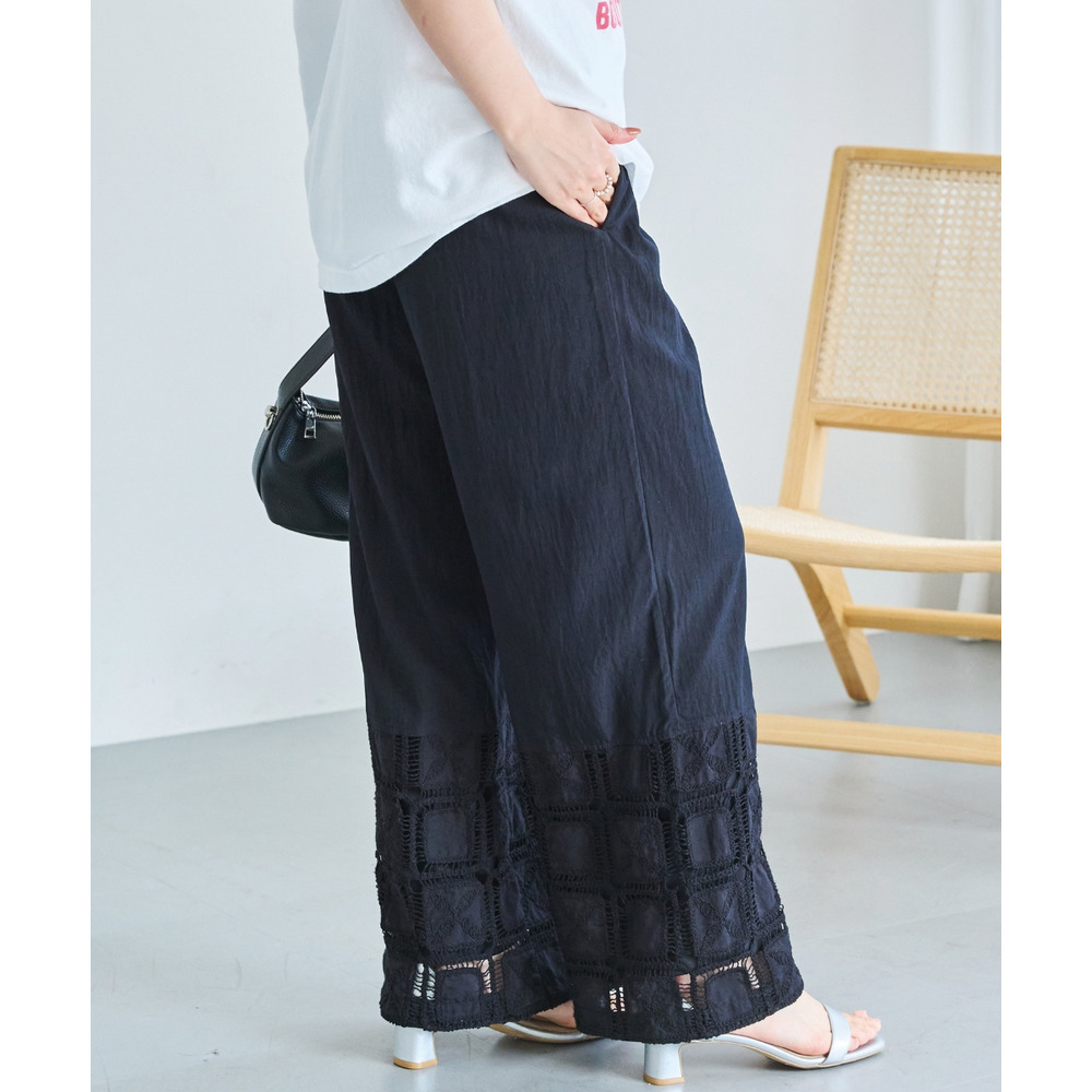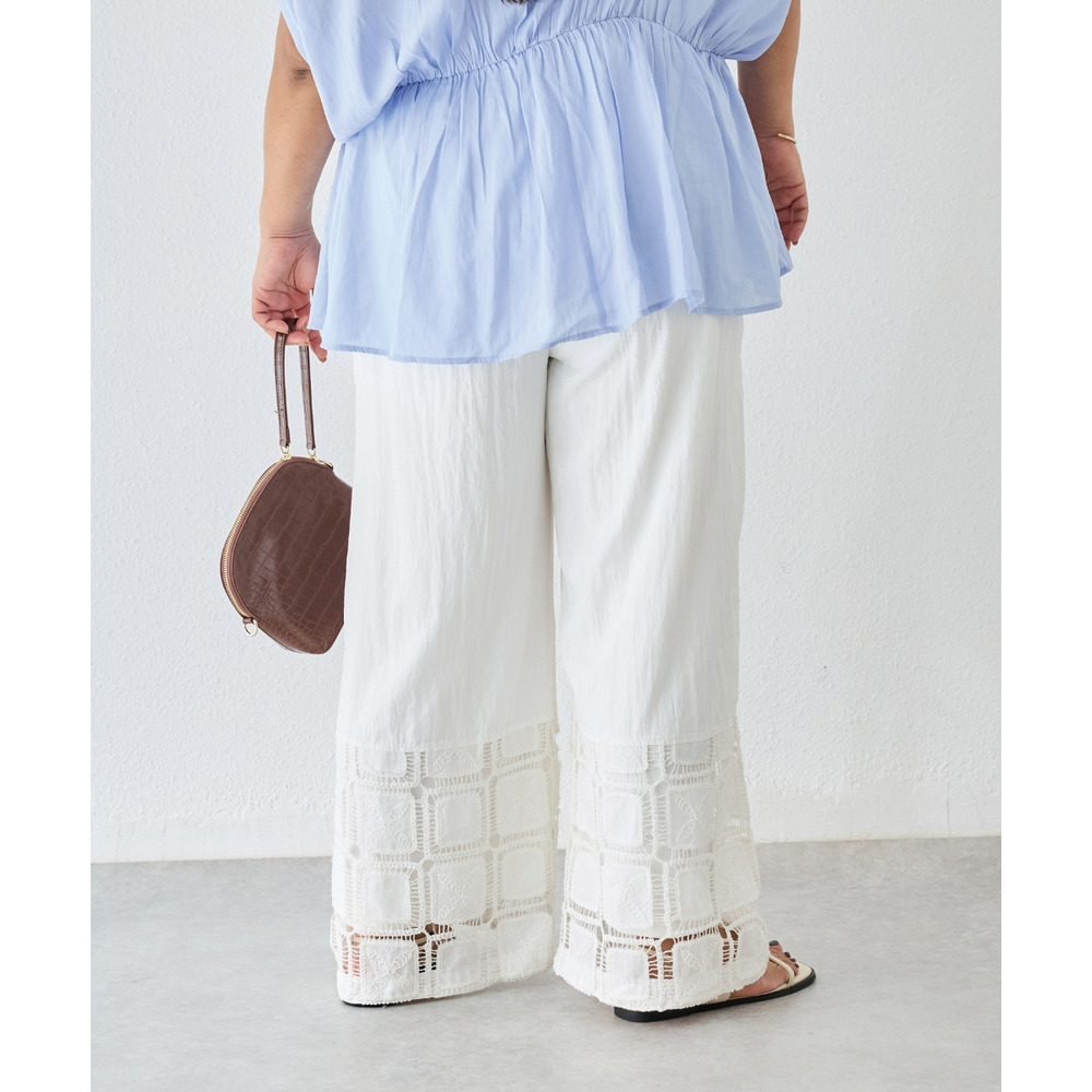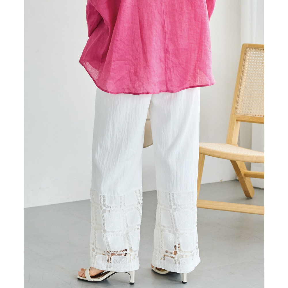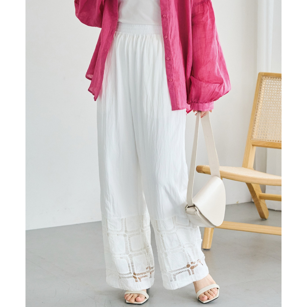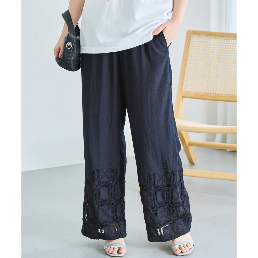 裾にレース切り替えを施した、パッチワーク風デザインが魅力のワイドパンツ。