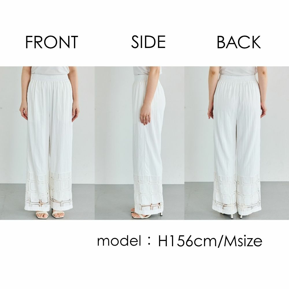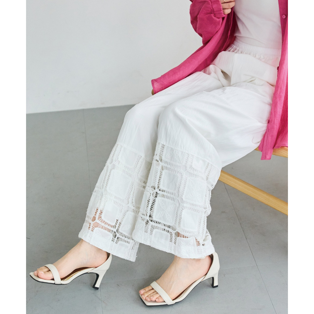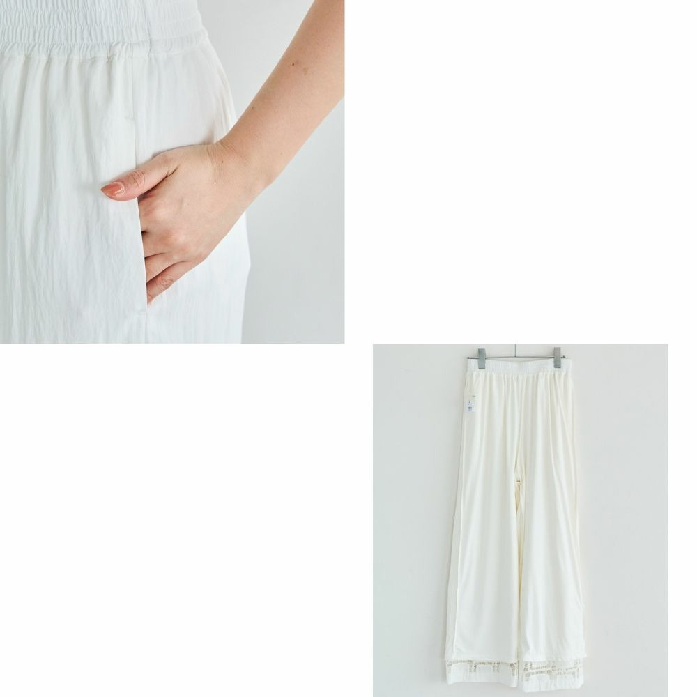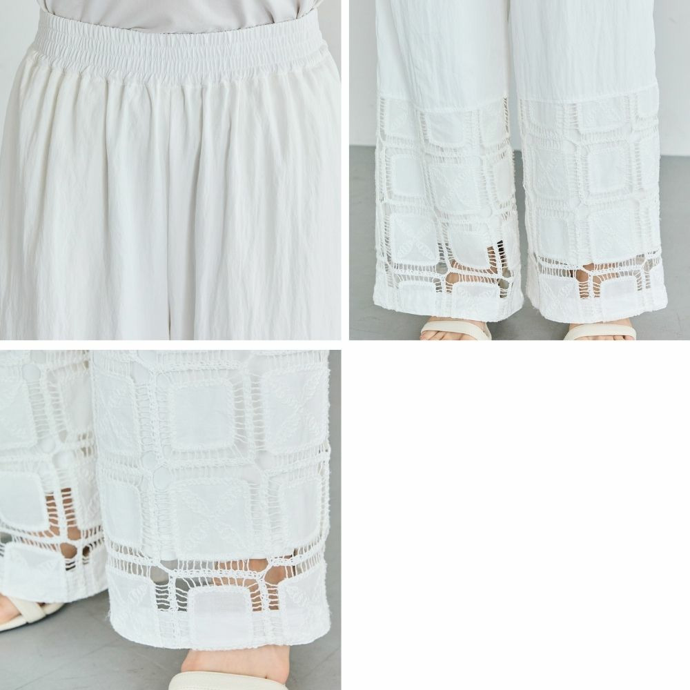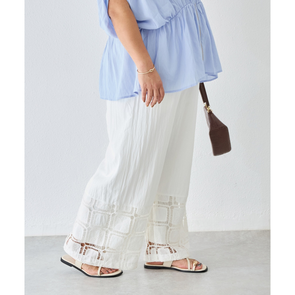 裾にレース切り替えを施した、パッチワーク風デザインが魅力のワイドパンツ。