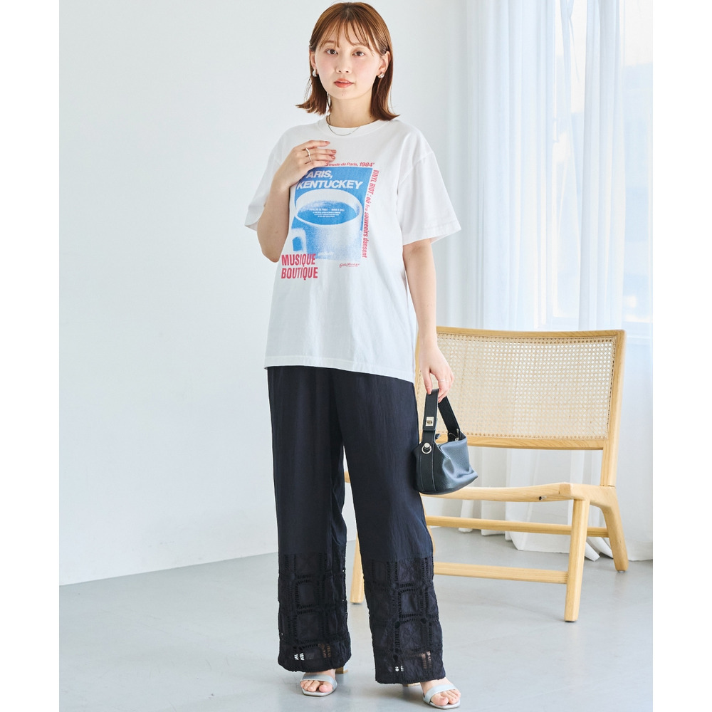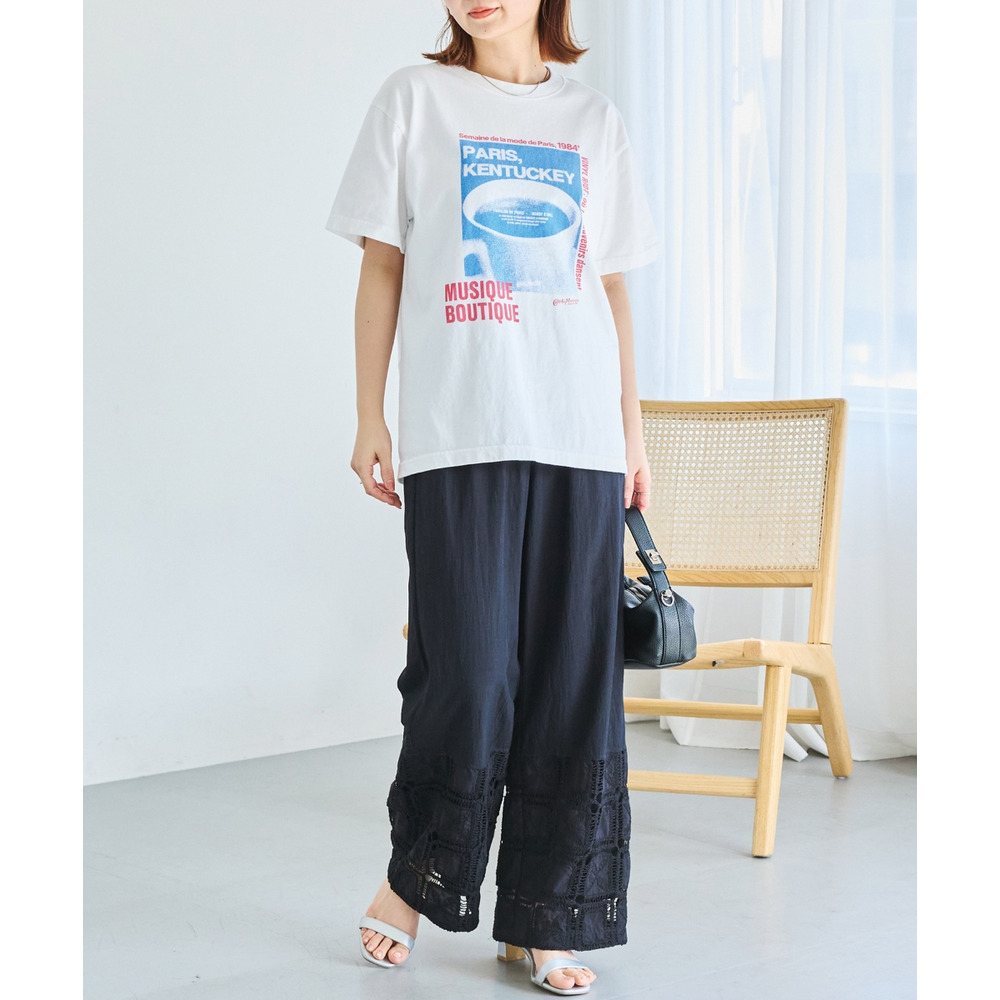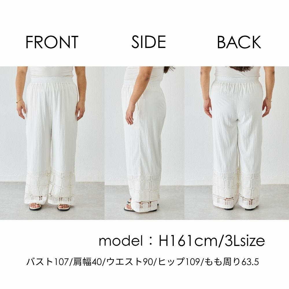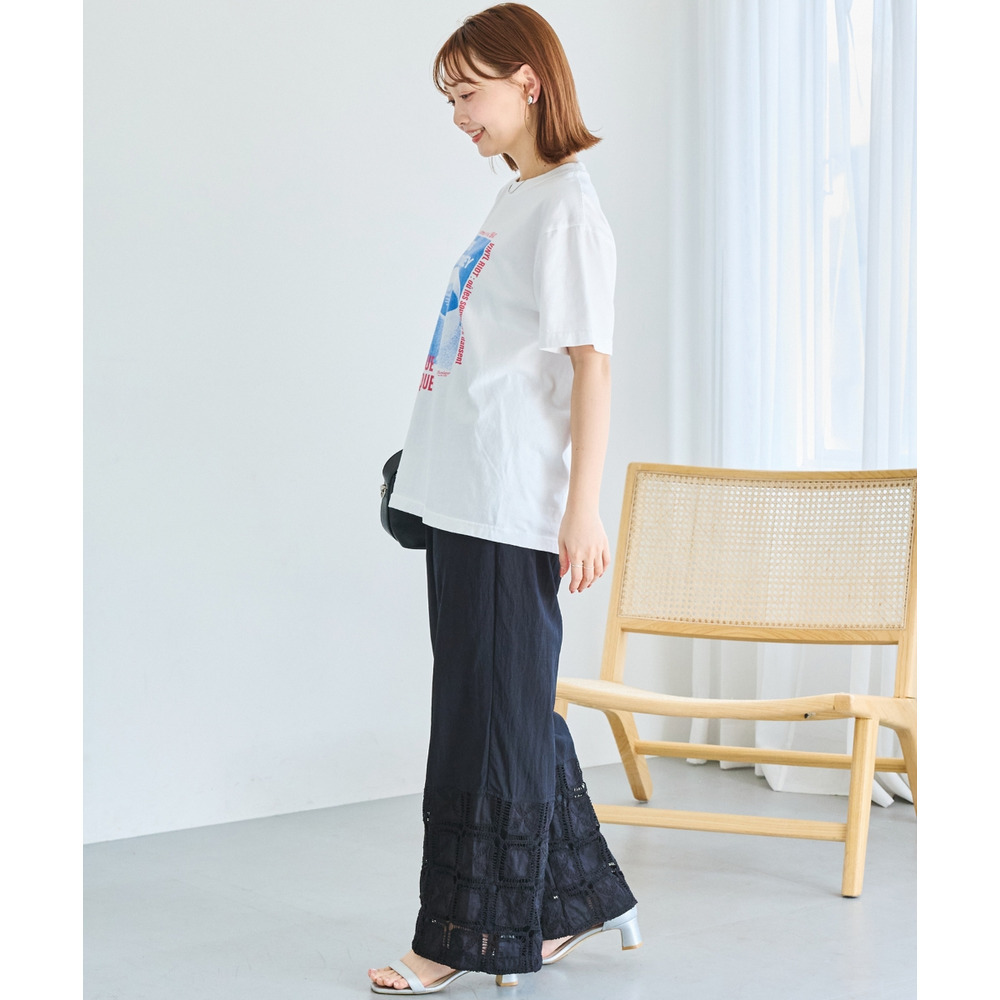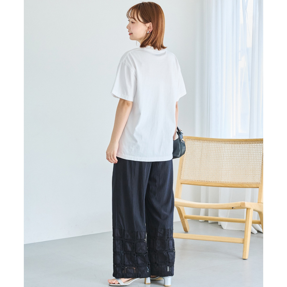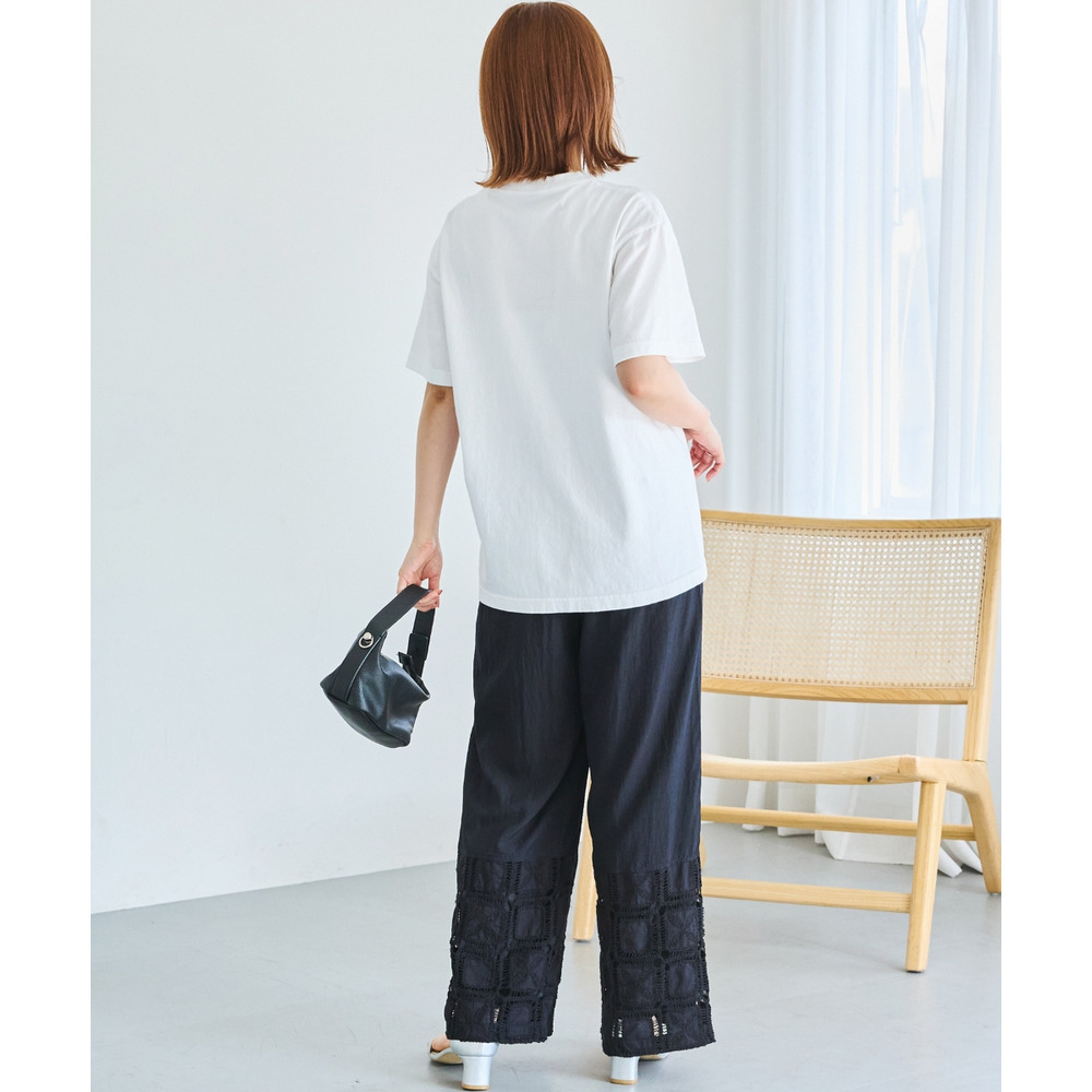 裾にレース切り替えを施した、パッチワーク風デザインが魅力のワイドパンツ。