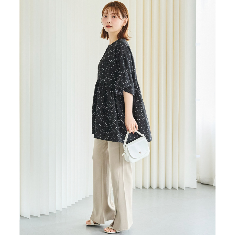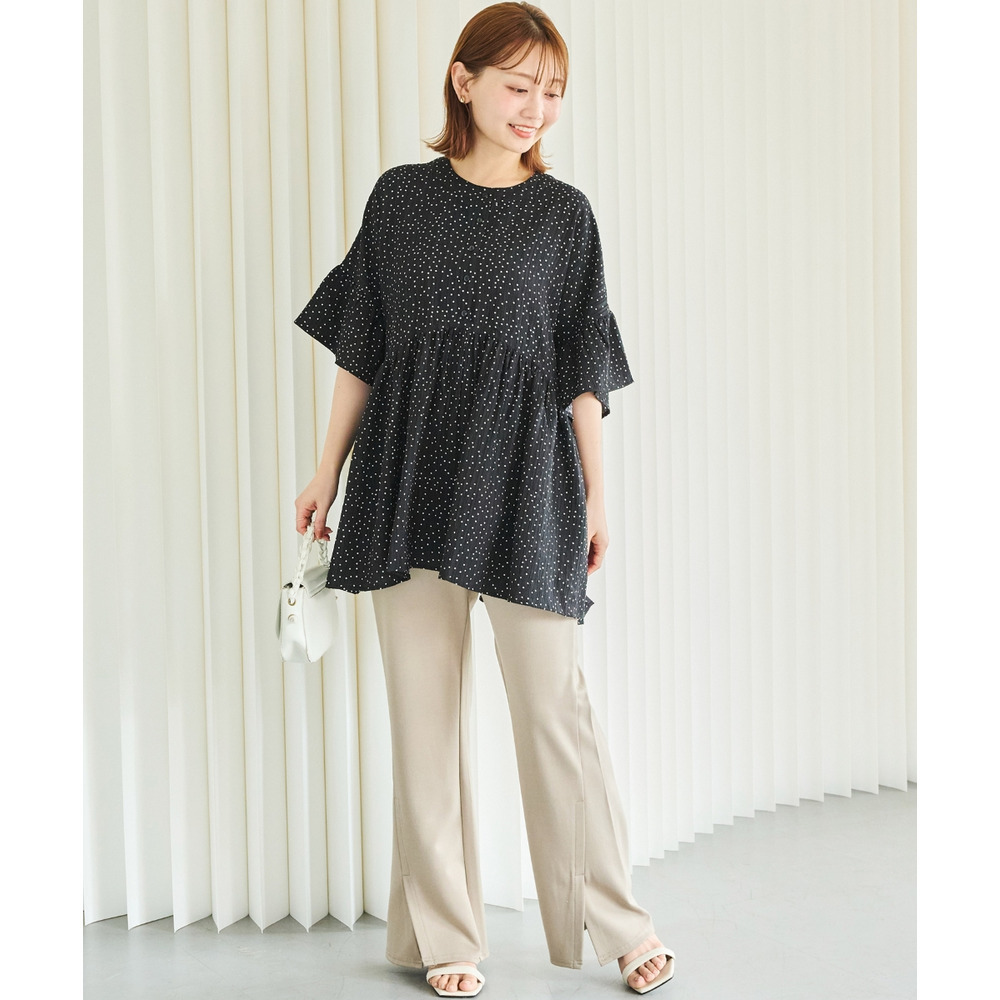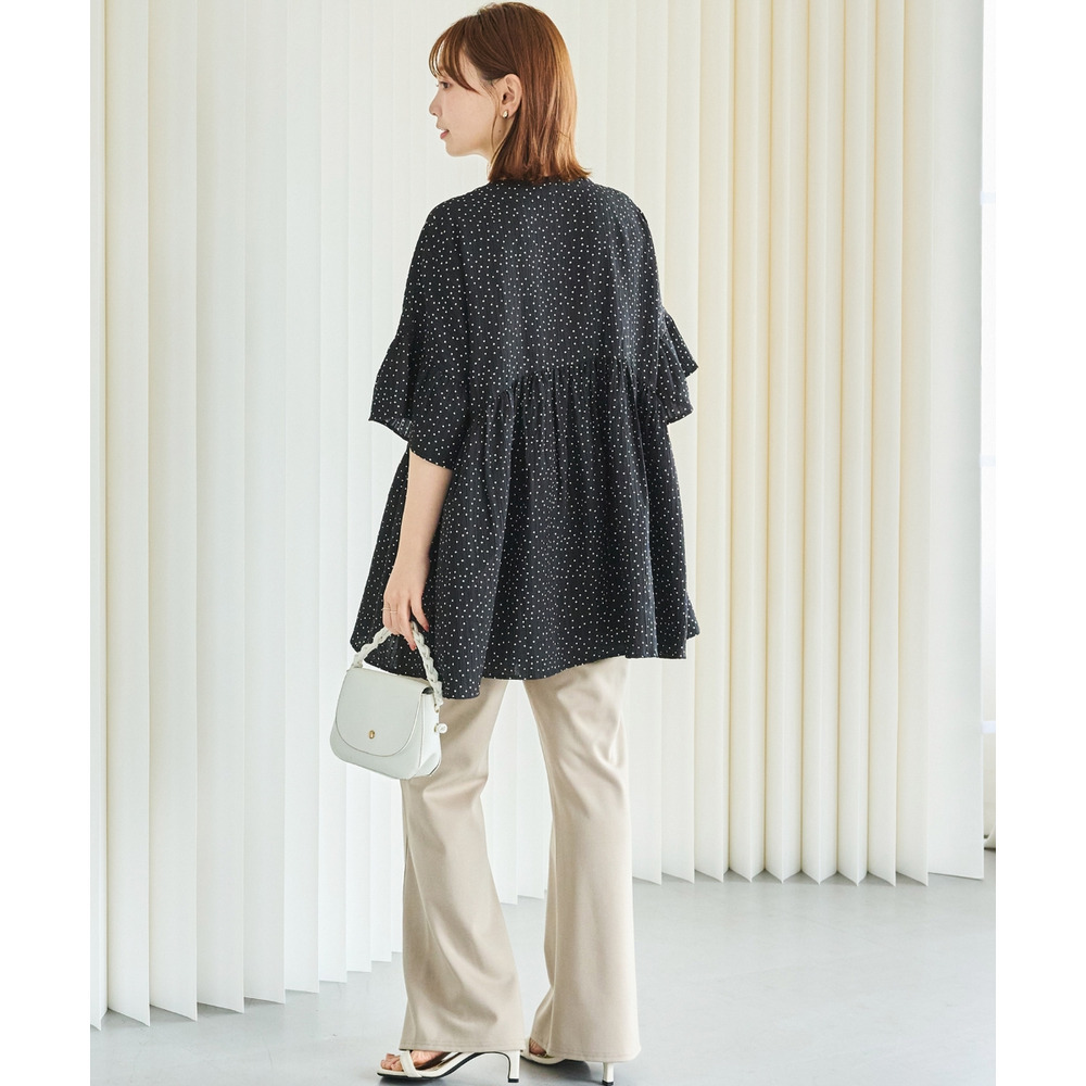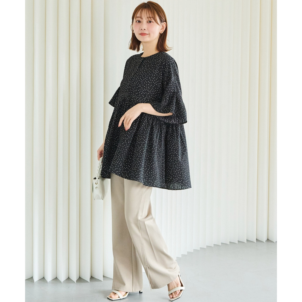 袖のフリルデザインでさりげない華やかさをプラスしました。切替から広がるフレアシルエットで体型カバーも◎