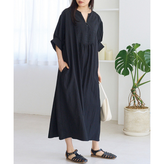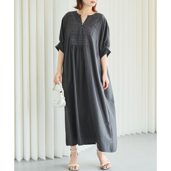 胸元の切替部分に施した繊細な刺繍が、シンプルながらも上品なアクセントに。