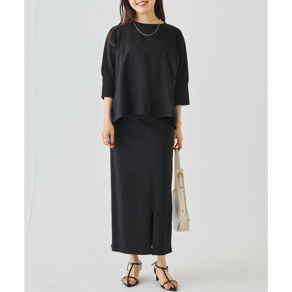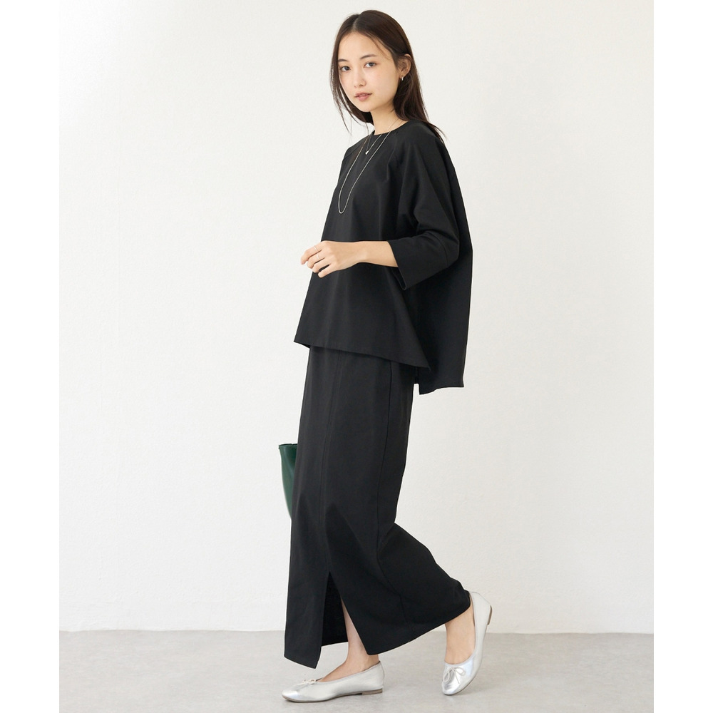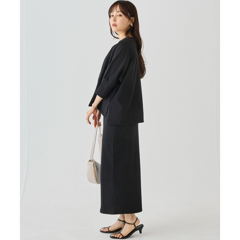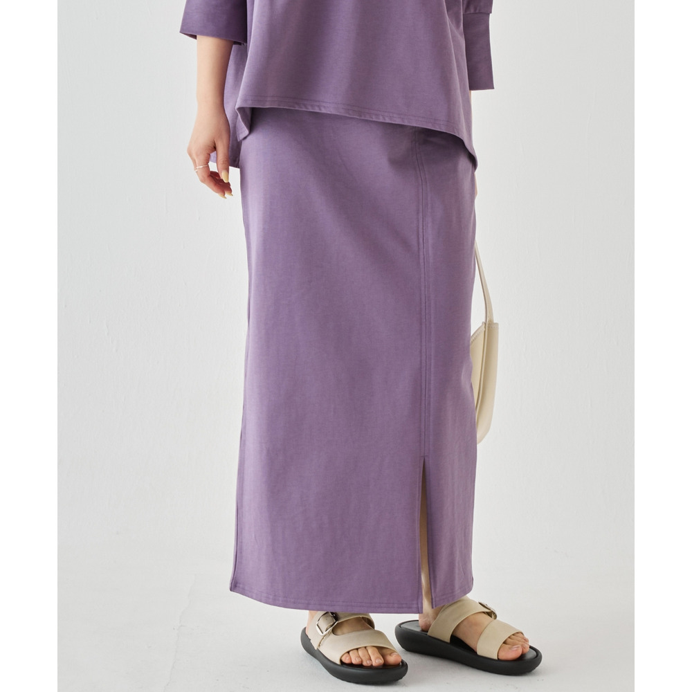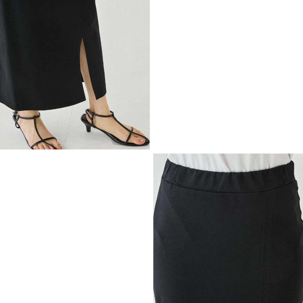 スカートは、身体のラインを拾いすぎないタイトシルエット。フロントスリット入りで足さばきが良く、動きやすさも◎ウエストゴム仕様でストレスフリーな穿き心地です。