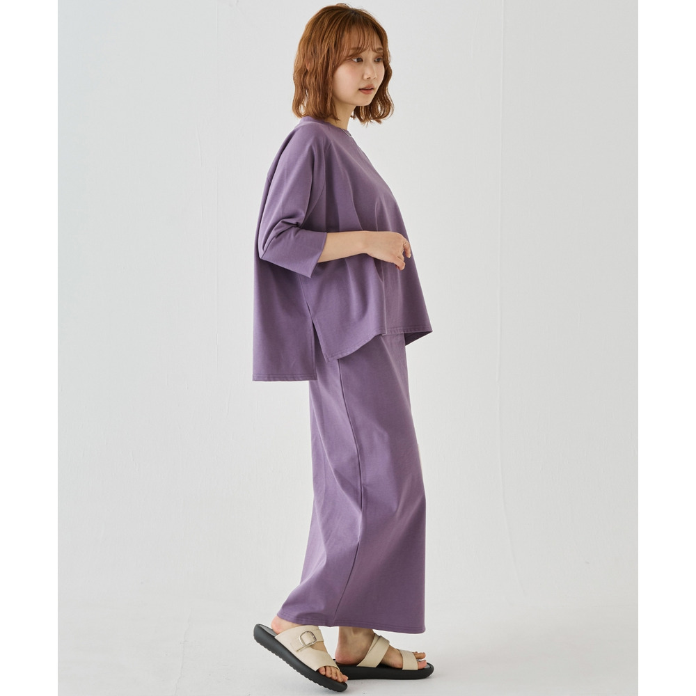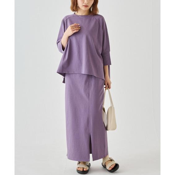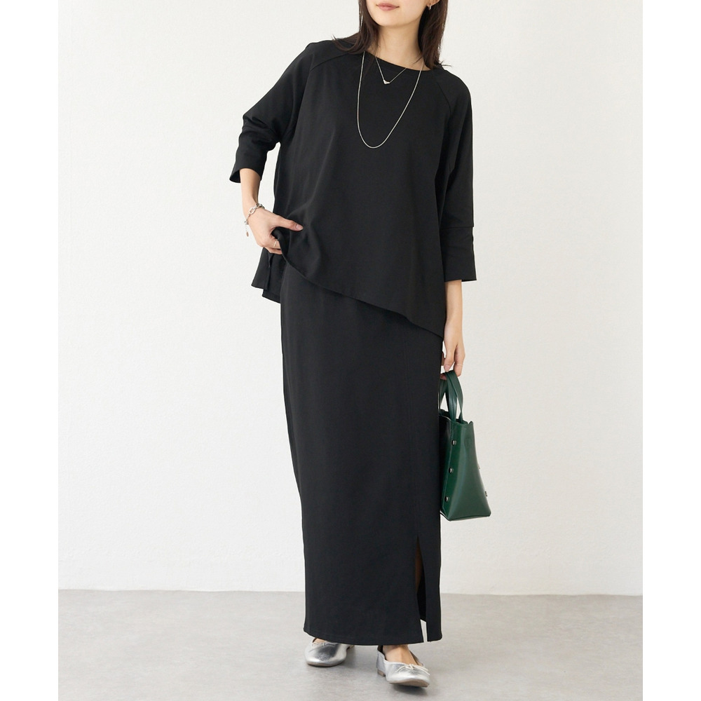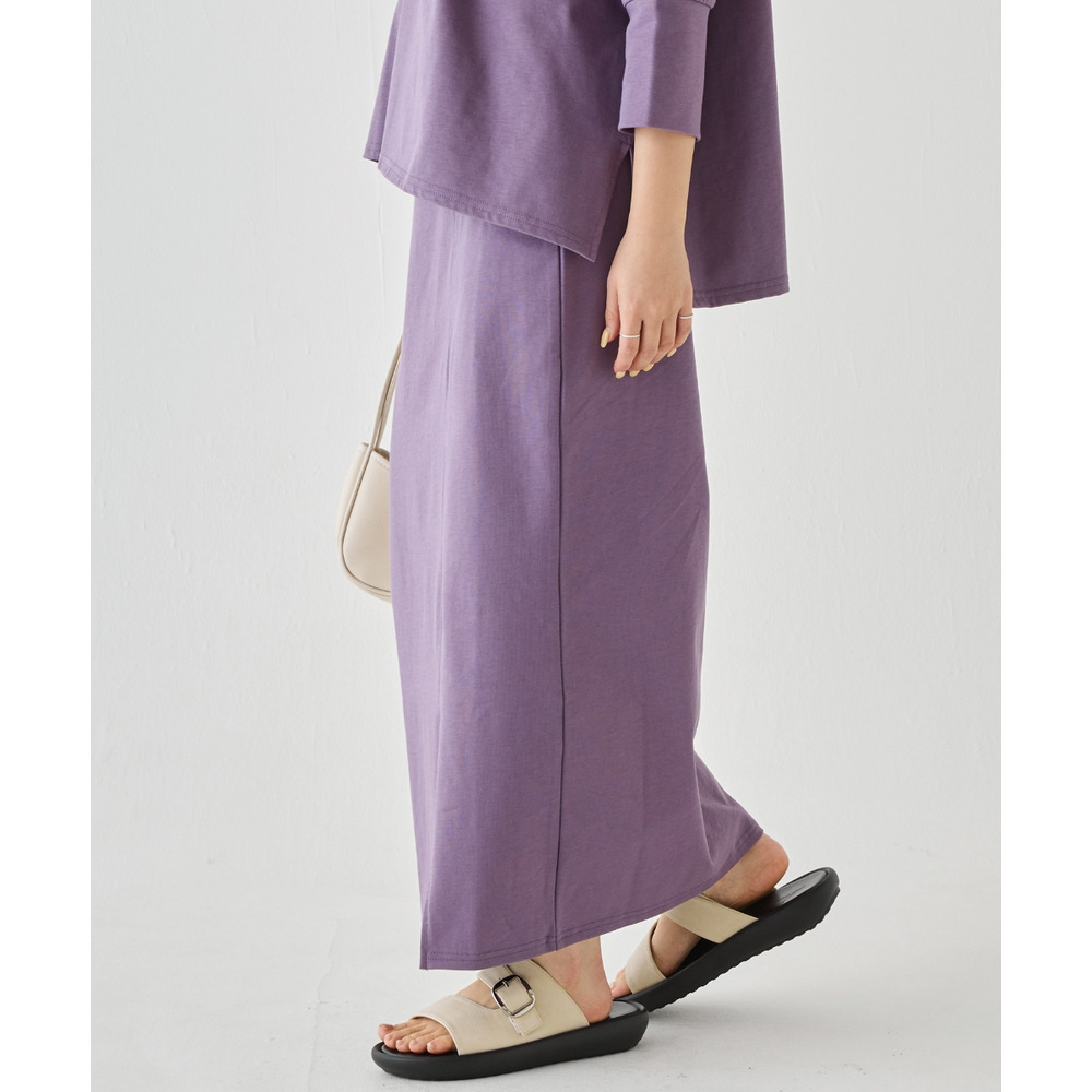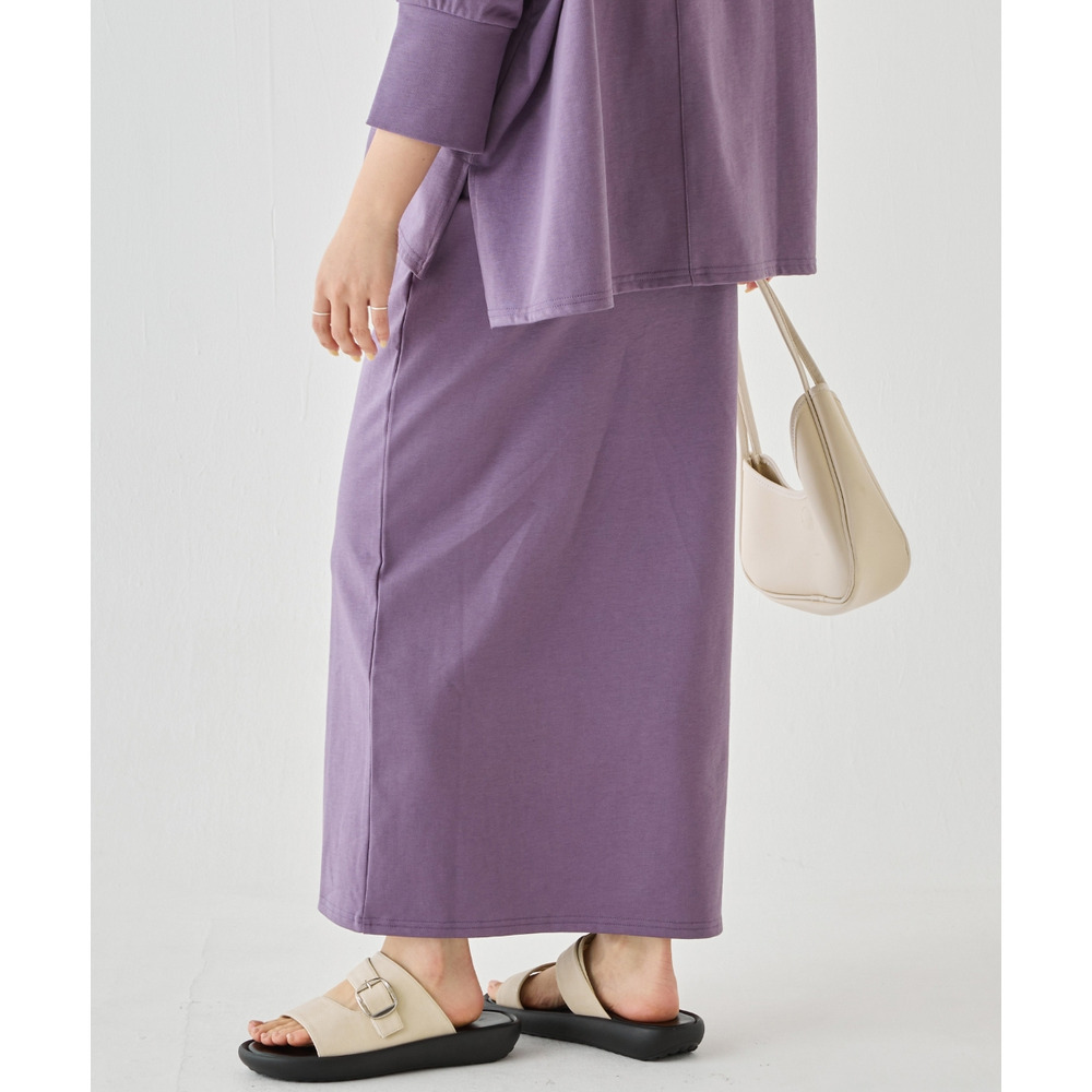 スカートは、身体のラインを拾いすぎないタイトシルエット。フロントスリット入りで足さばきが良く、動きやすさも◎ウエストゴム仕様でストレスフリーな穿き心地です。