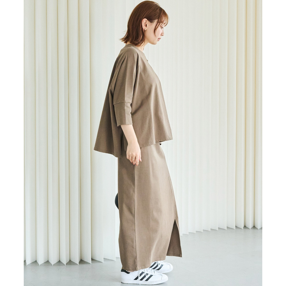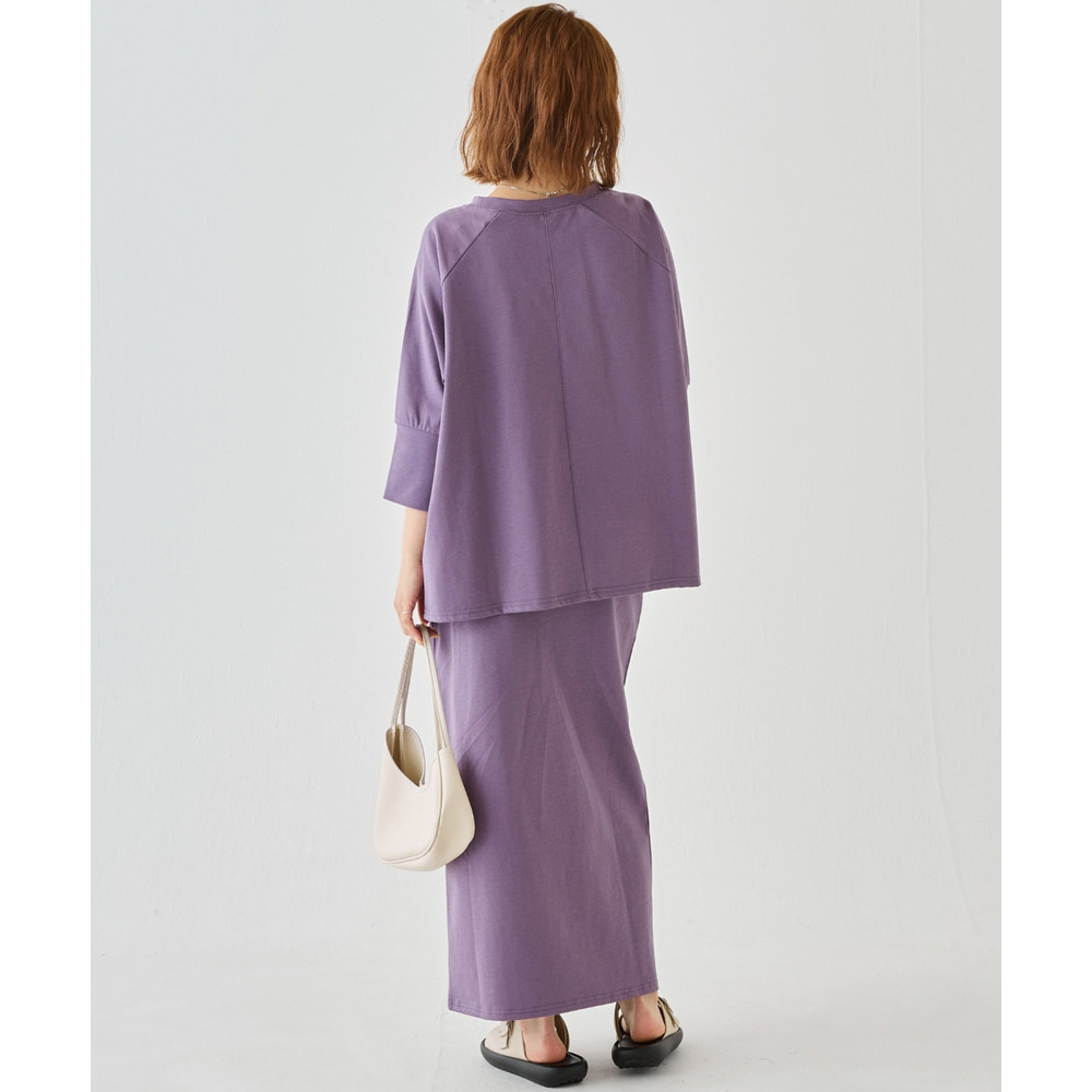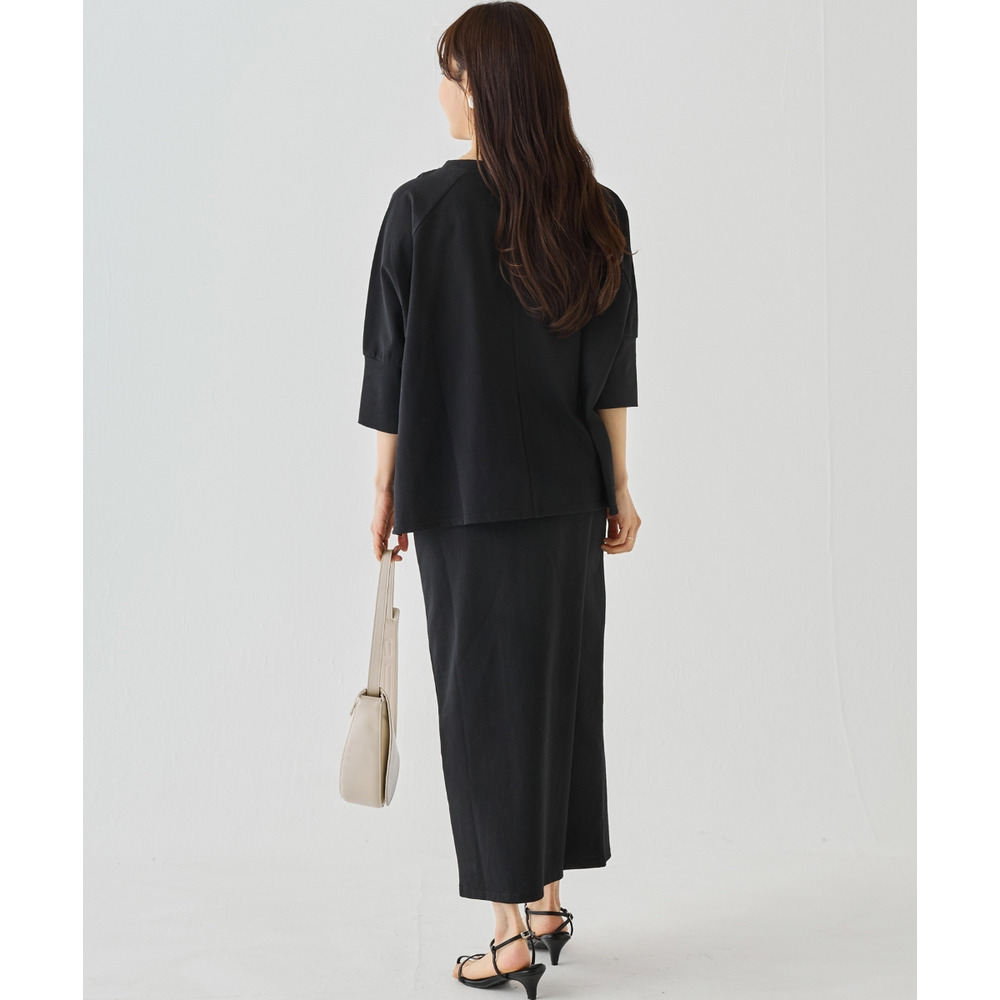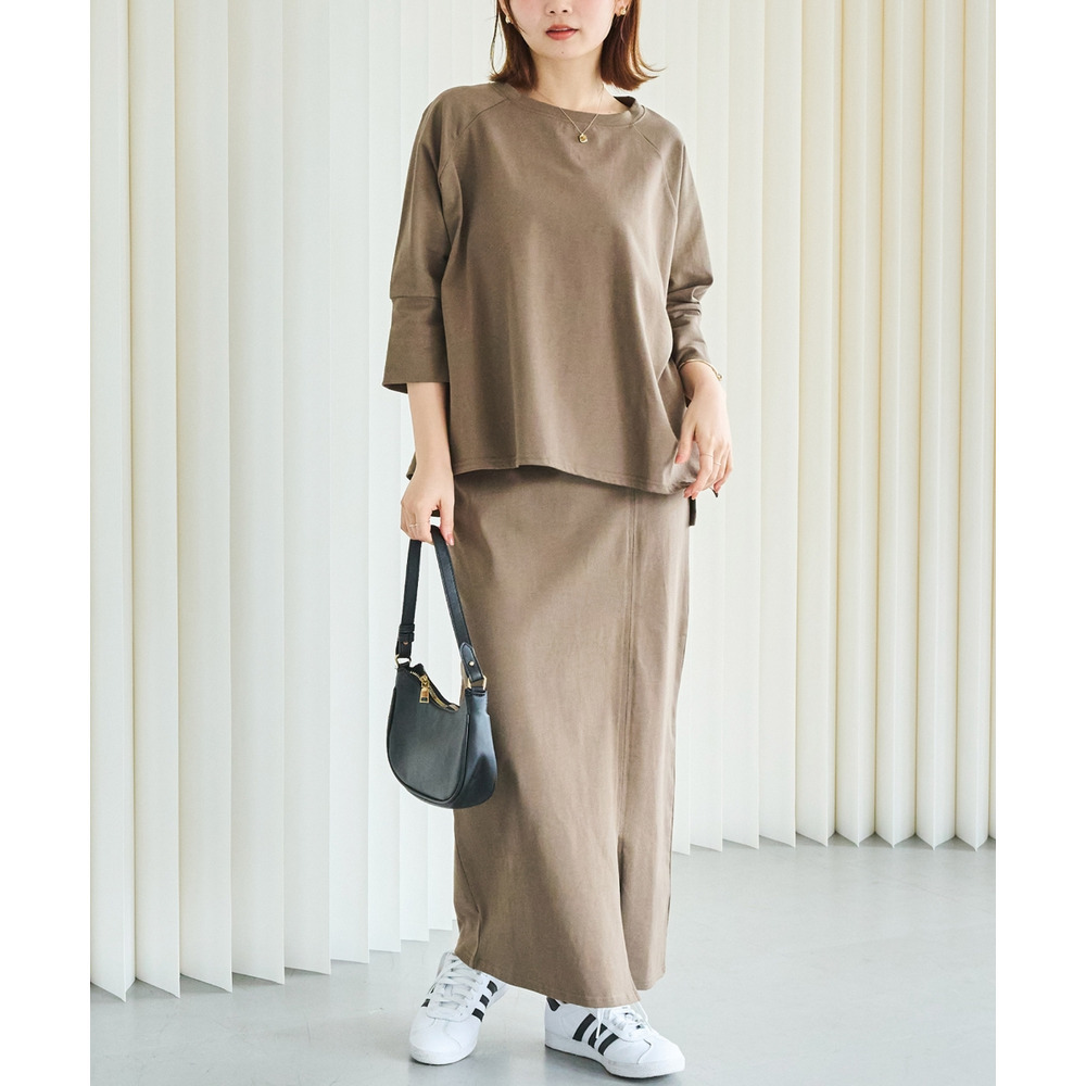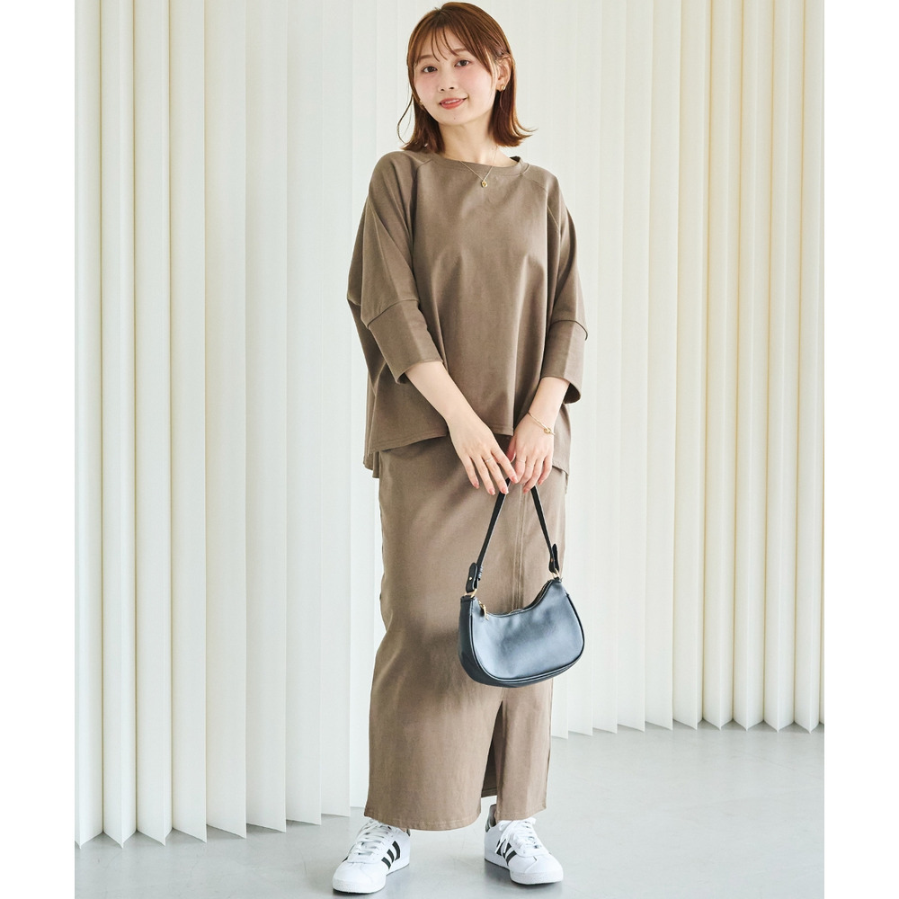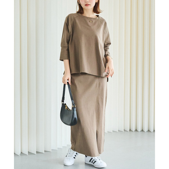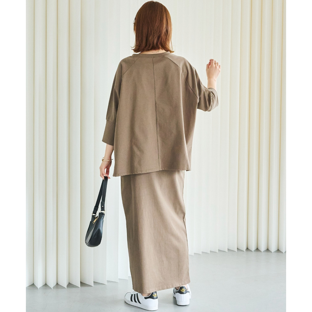 トップスは、ゆったりとした身幅にサイドスリットを施し、抜け感をプラス。ラグランスリーブで程よくラフさを出しつつ、長めの袖リブでメリハリのある印象に。
