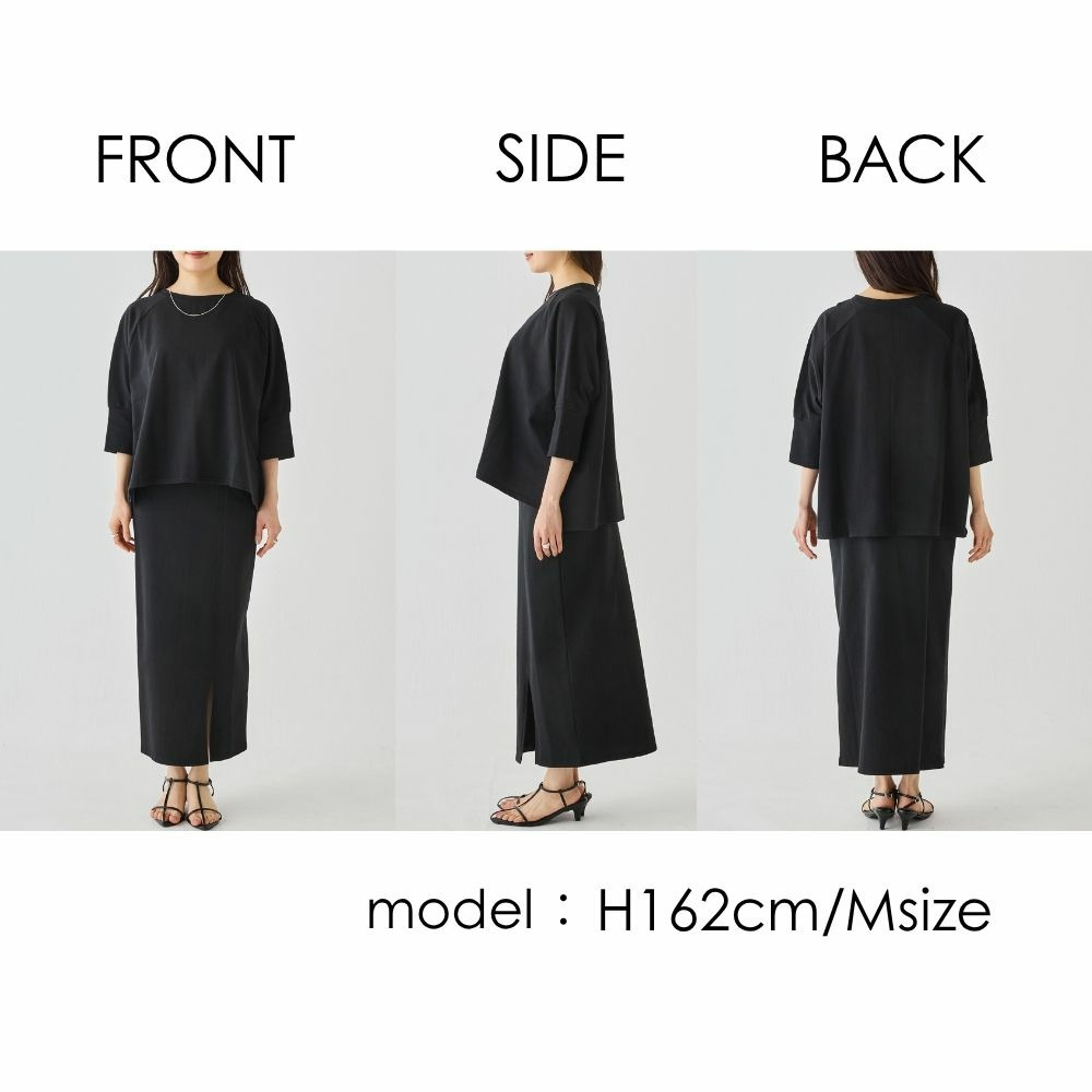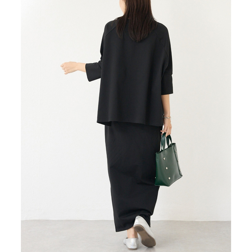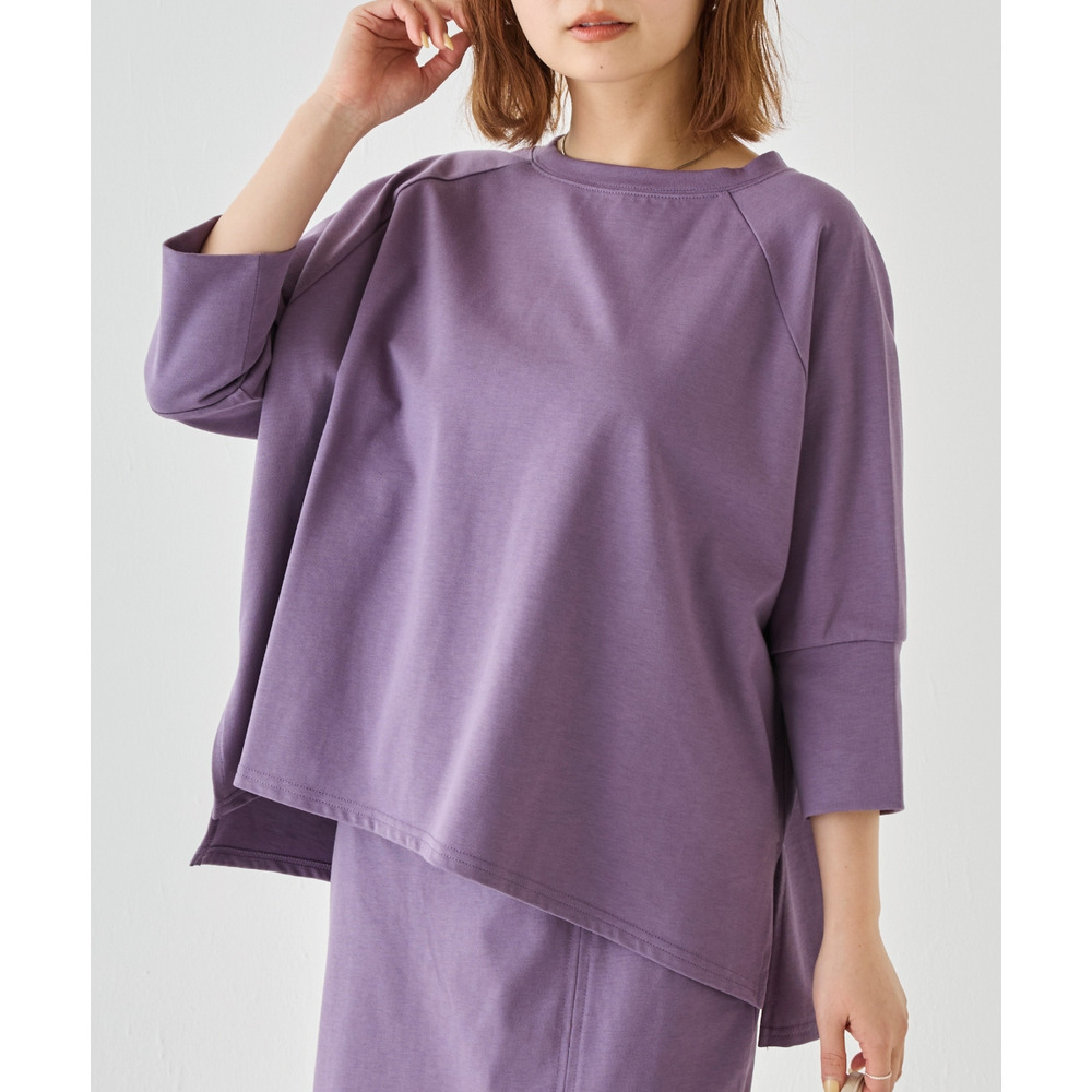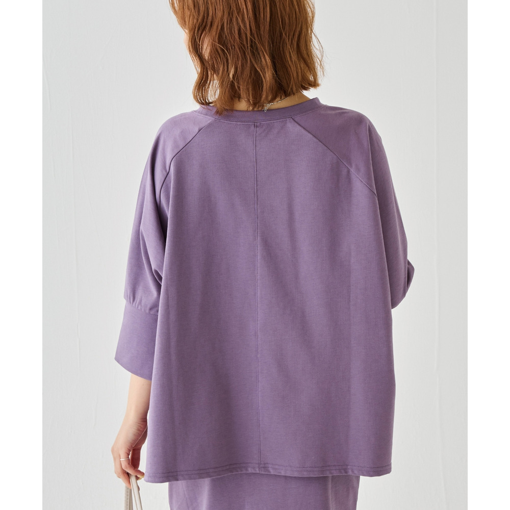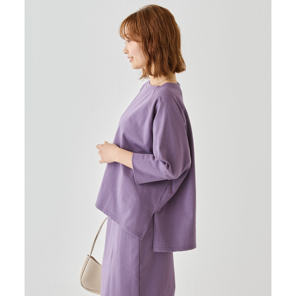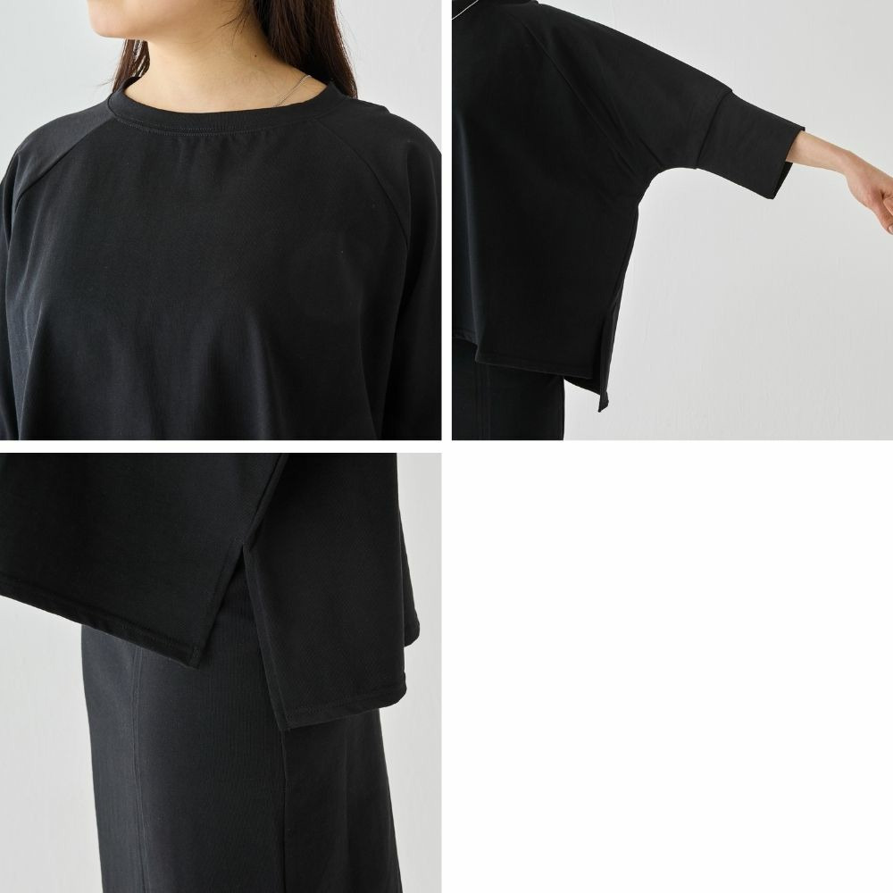 トップスは、ゆったりとした身幅にサイドスリットを施し、抜け感をプラス。ラグランスリーブで程よくラフさを出しつつ、長めの袖リブでメリハリのある印象に。
