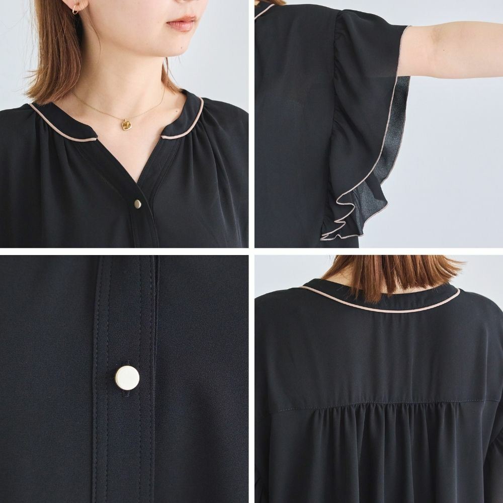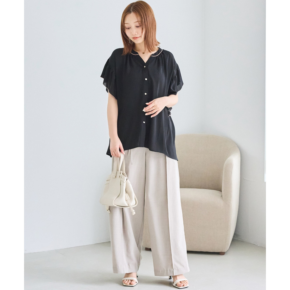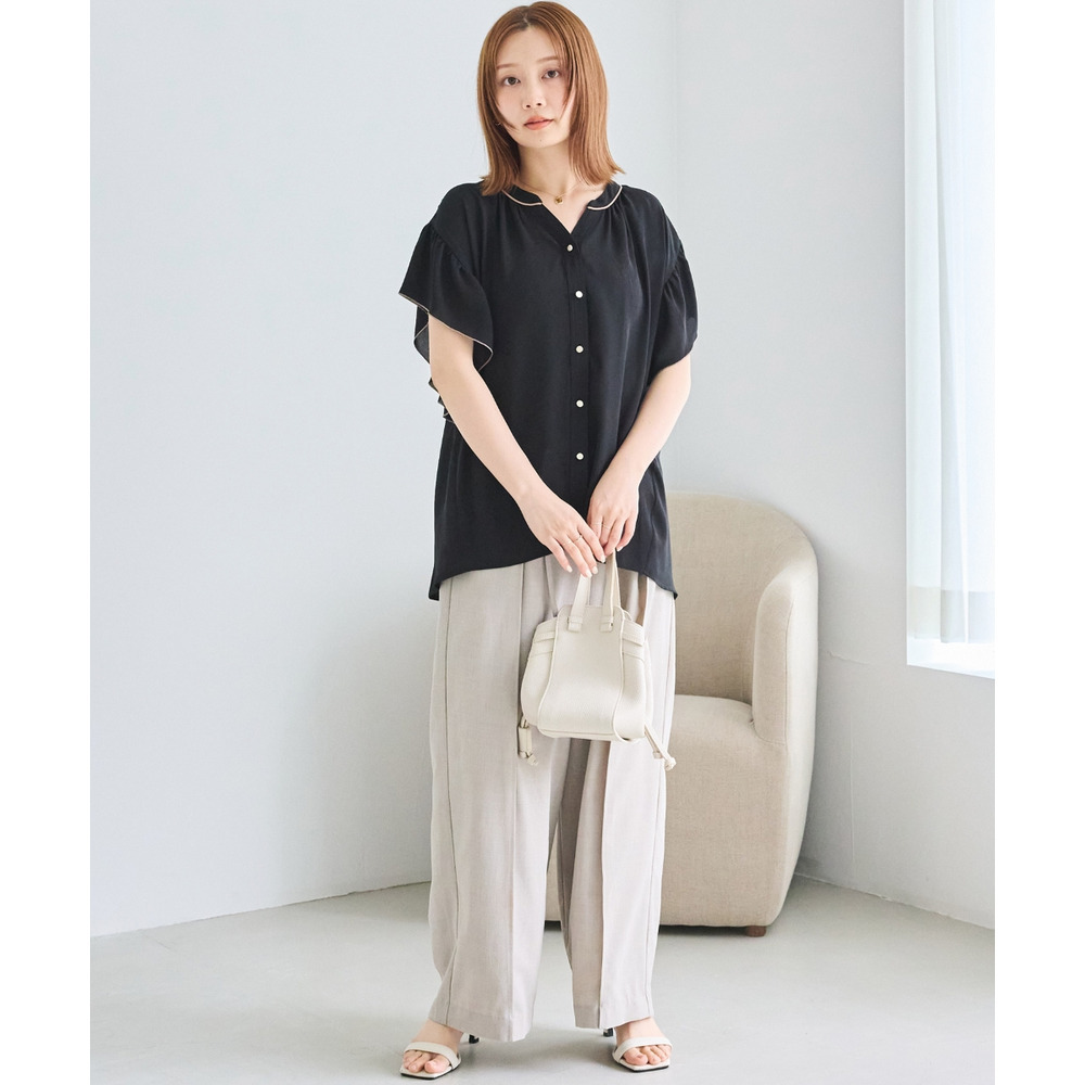 前後差のある着丈と、脇線を前に振った設計で、気になるラインをカバーしつつすっきり細見えを実現。袖は切り替え入りのフレアデザインで、動くたびに軽やかなニュアンスをプラスします。