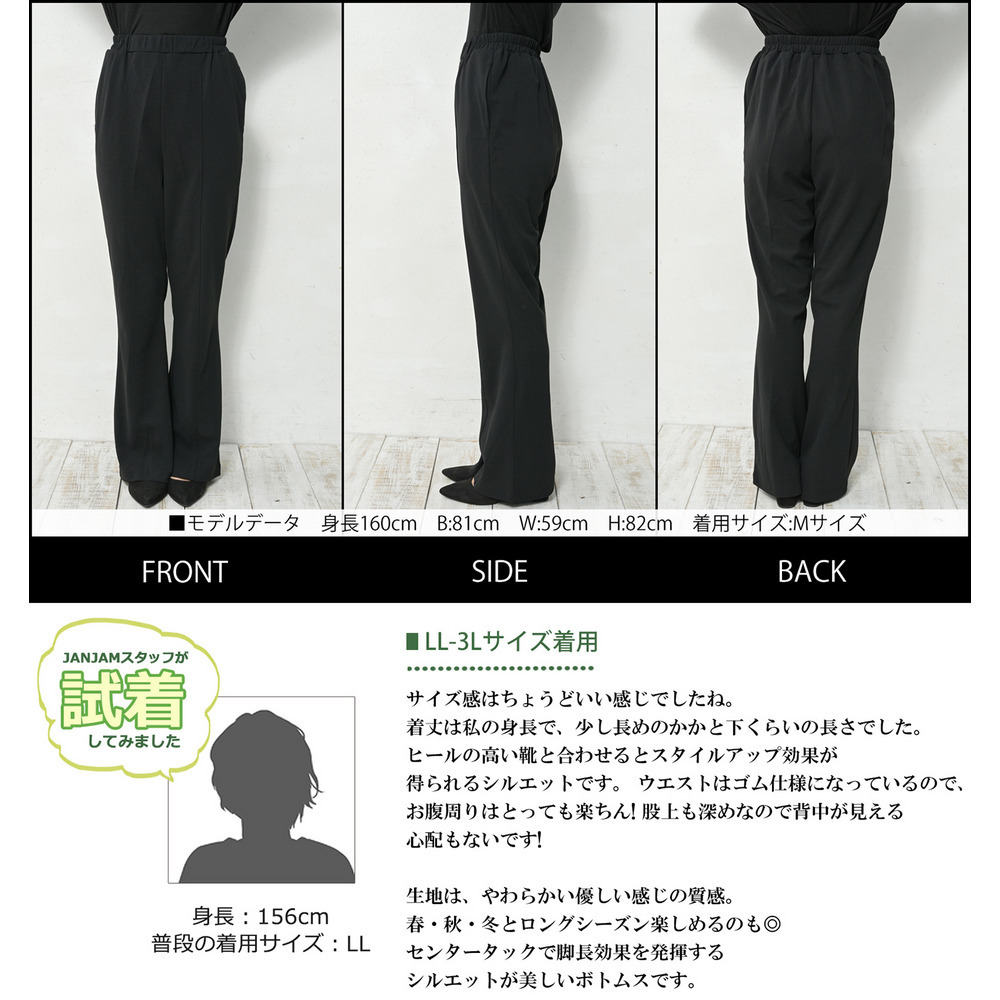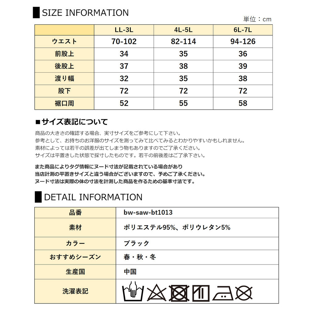 サイズ表記 LL-3L 4L-5L 6L-7L 総丈 106 107 108 ウエスト 70-102 82-114 94-126 ヒップ 106 118 130 前股上 34 35 36 後股上 37 38 39 股下 72 72 72 渡り幅 32 35 38 裾口周 52 55 58