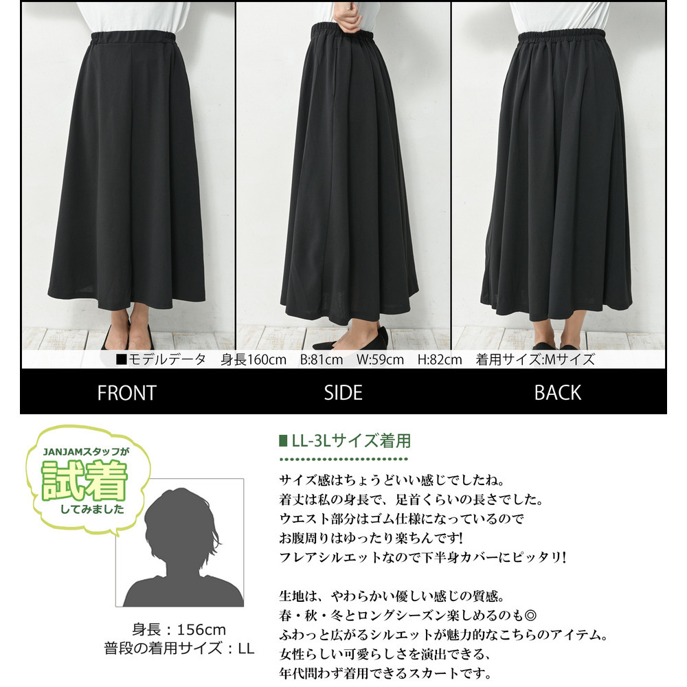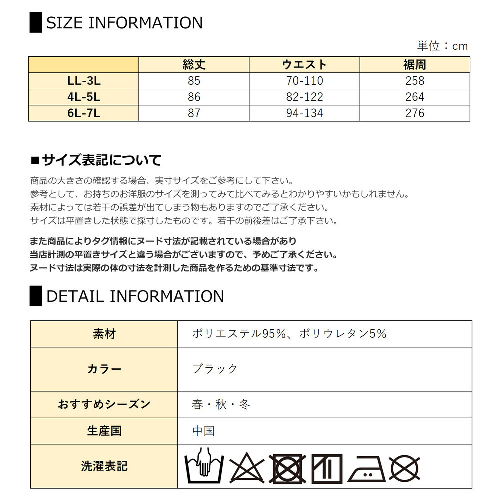 サイズ表記 LL-3L 4L-5L 6L-7L 総丈 85 86 87 ウエスト 70-110 82-122 94-134 裾周 258 264 276