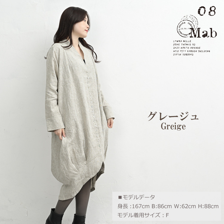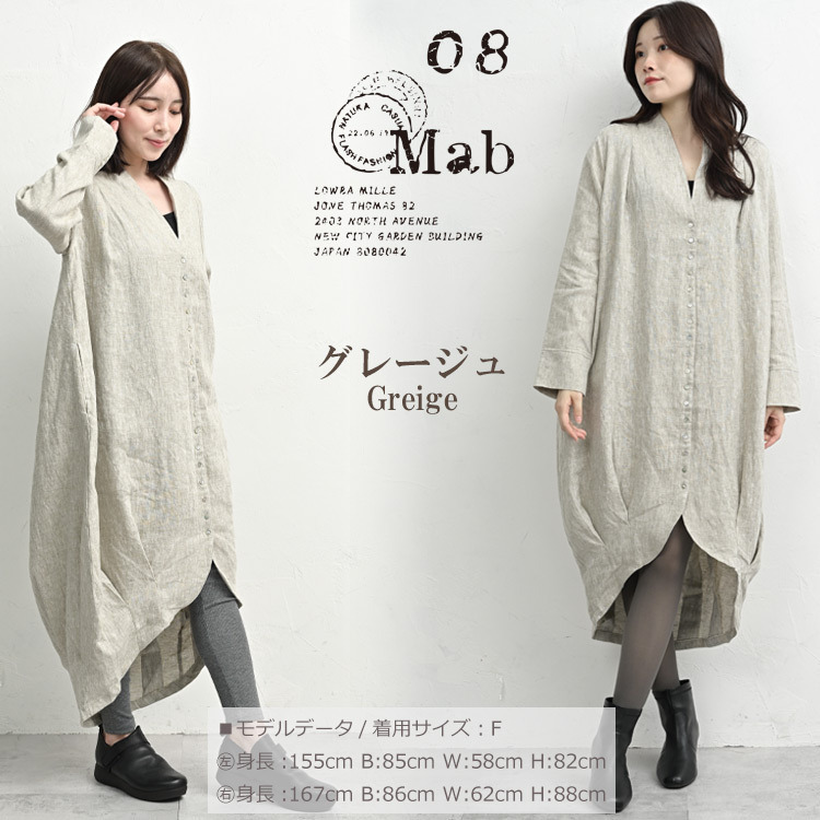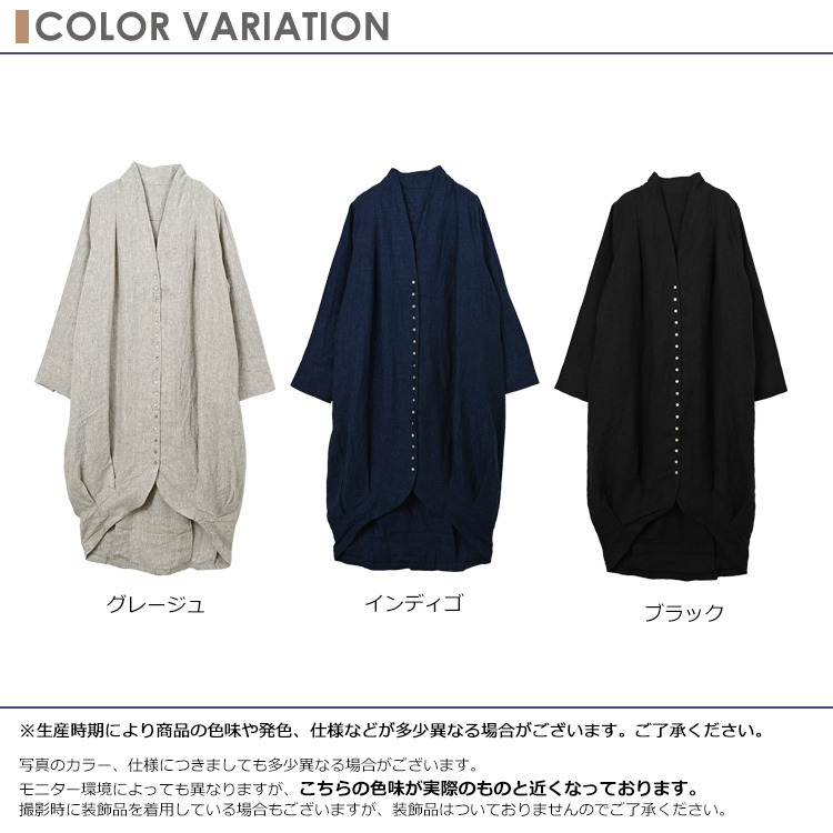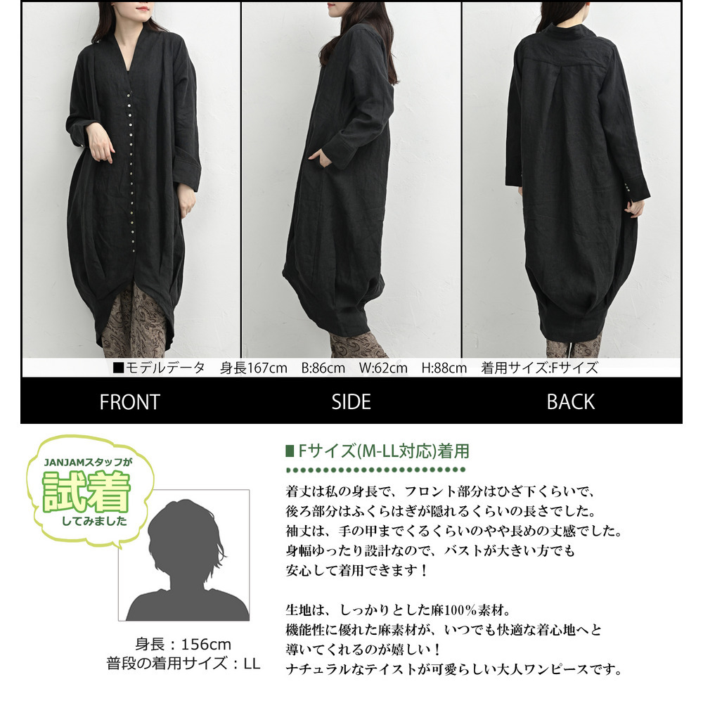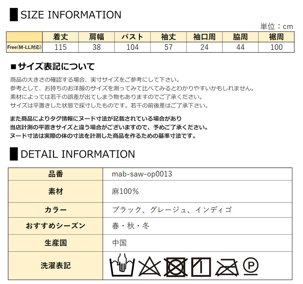 サイズ表記 F【M-LL対応】 着丈 115 肩幅 38 バスト 104 袖丈 57 袖口周 24 脇周 44 裾周 100
