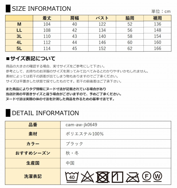 サイズ表記 LL 3L 4L 5L 着丈 108 110 112 114 肩幅 42 43 44 45 バスト 134 140 146 152 脇周 56 58 60 62 裾周 148 154 160 166