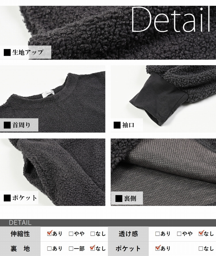 | 素材 | 本体:ポリエステル100% リブ部分:ポリエステル95%、ポリウレタン5% |