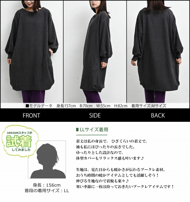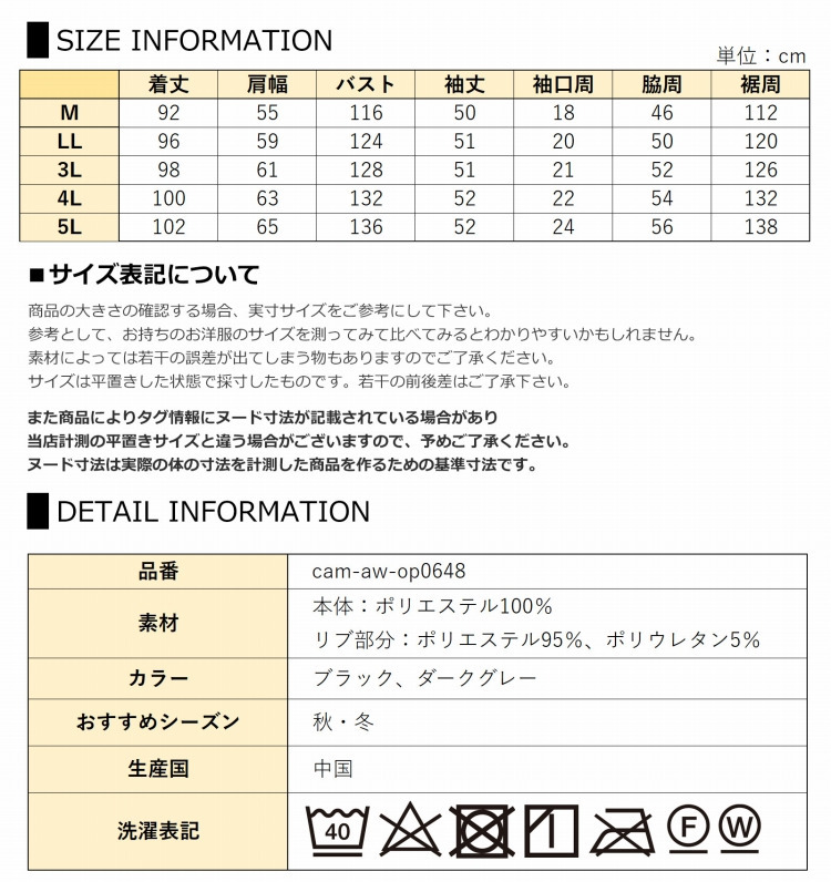 サイズ表記 LL 3L 4L 5L 着丈 96 98 100 102 肩幅 59 61 63 65 バスト 124 128 132 136 袖丈 51 51 52 52 袖口周 20 21 22 24 脇周 50 52 54 56 裾周 120 126 132 138