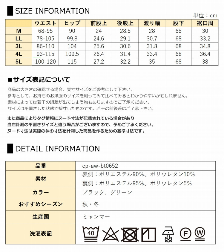 サイズ表記 LL 3L 4L 5L ウエスト 78-105 86-110 93-115 100-120 ヒップ 99.8 104 109.5 115 前股上 24.6 25.6 26.4 27.2 後股上 29.1 30.6 31.4 32.2 渡り幅 29.1 30.6 33.4 35 股下 68 68 68 68 裾口周 33.2 34.8 36.4 38