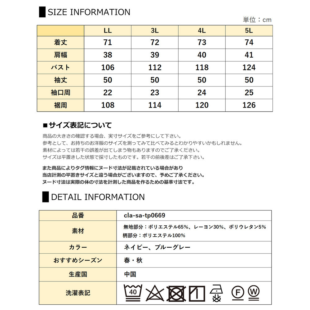 サイズ表記 LL 3L 4L 5L 着丈 71 72 73 74 肩幅 38 39 40 41 バスト 106 112 118 124 袖丈 50 50 50 50 袖口周 22 23 24 25 裾周 108 114 120 126