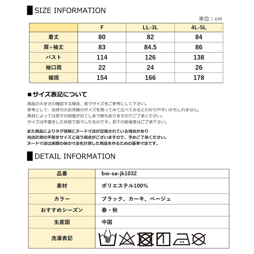 サイズ表記 LL-3L 4L-5L 着丈 82 84 肩+袖丈 84.5 86 バスト 126 138 袖口周 24 26 裾周 166 178