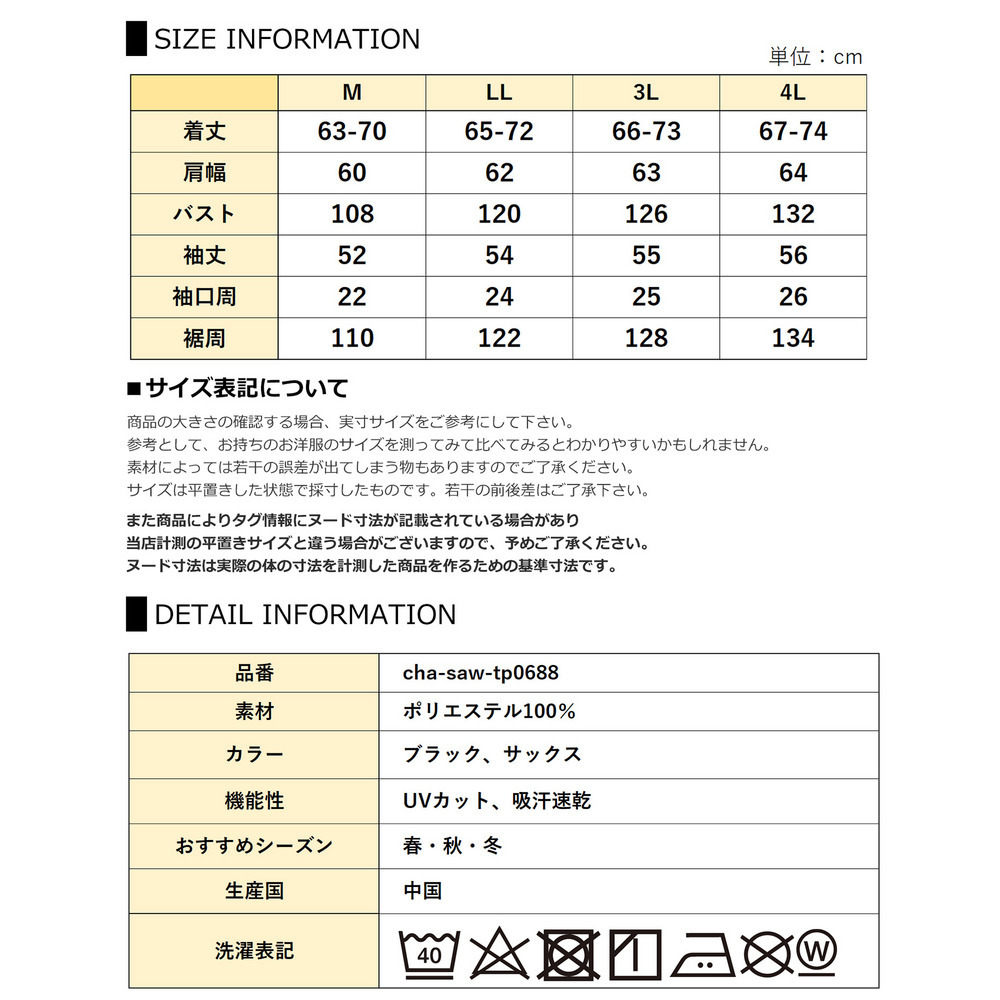 サイズ表記 LL 3L 4L 着丈 65-72 66-73 67-74 肩幅 62 63 64 バスト 120 126 132 袖丈 54 55 56 袖口周 24 25 26 裾周 122 128 134