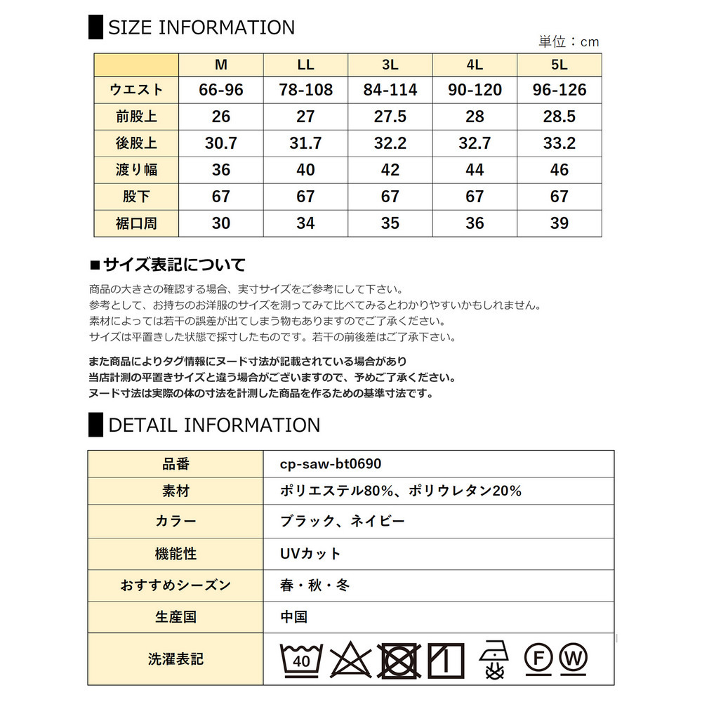 サイズ表記 LL 3L 4L 5L ウエスト 78-108 84-114 90-120 96-126 前股上 27 27.5 28 28.5 後股上 31.7 32.2 32.7 33.2 渡り幅 40 42 44 46 股下 67 67 67 67 裾口周 34 35 36 39