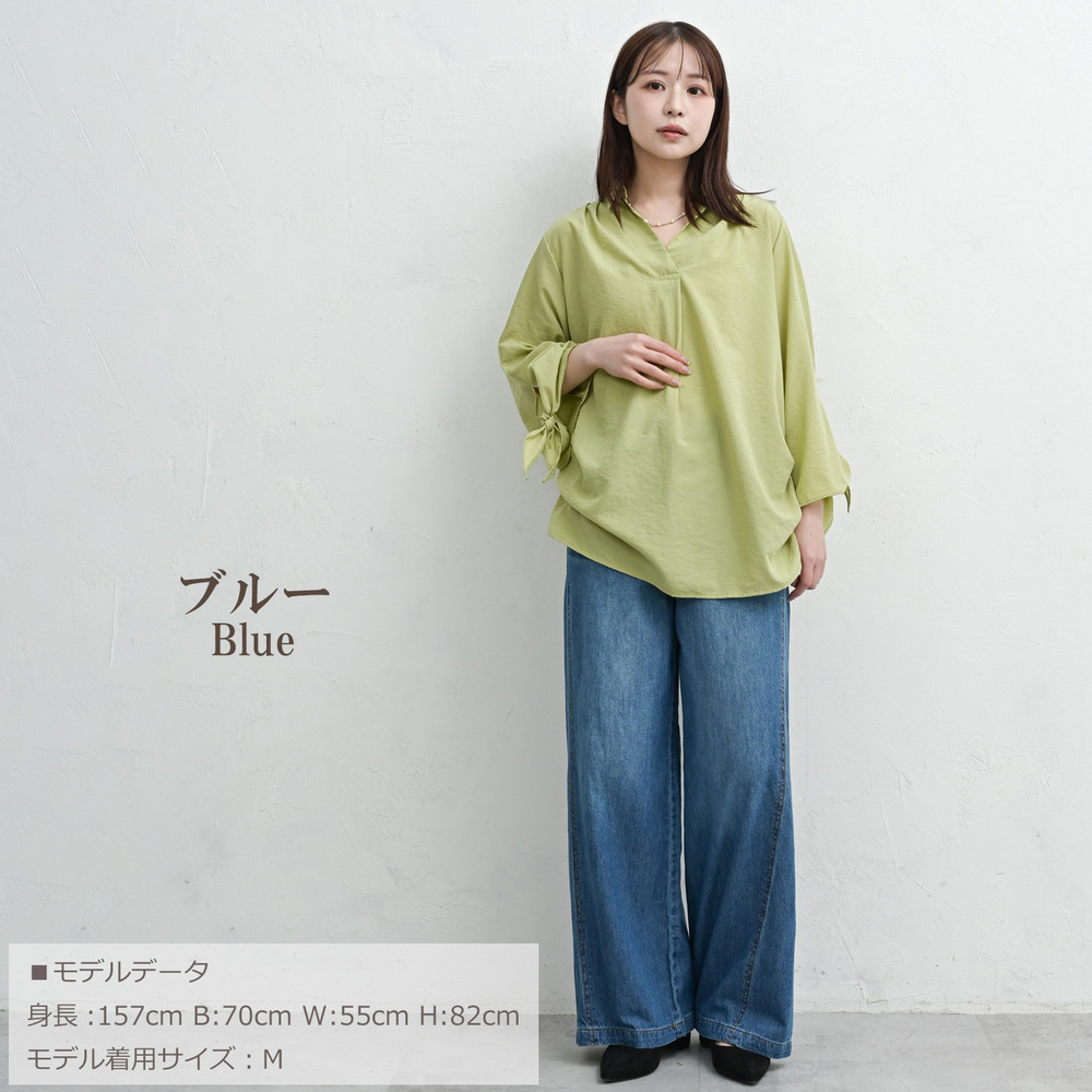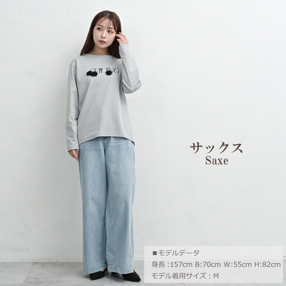 ゆとりのあるバギーシルエットながら、縦のラインを強調するデザインで