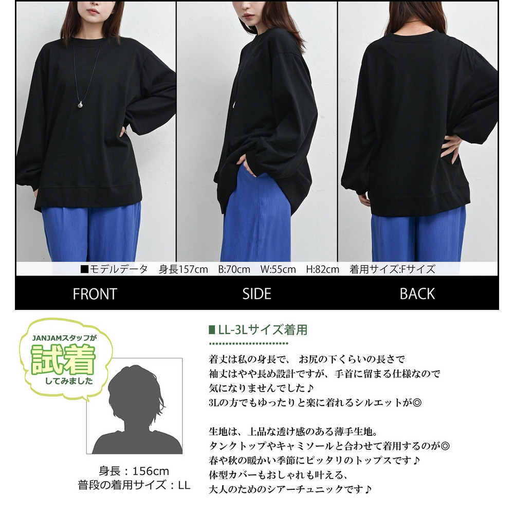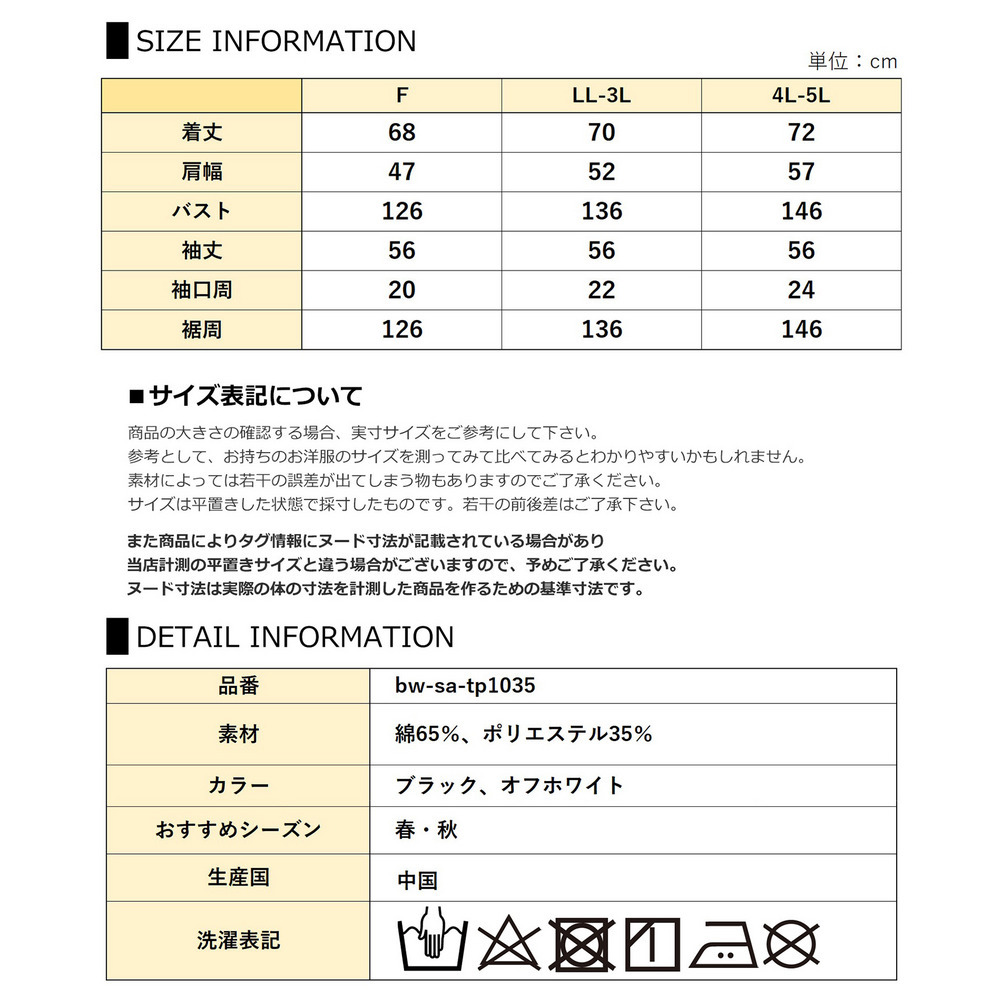 サイズ表記 LL-3L 4L-5L 着丈 70 72 肩幅 52 57 バスト 136 146 袖丈 56 56 袖口周 22 24 裾周 136 146