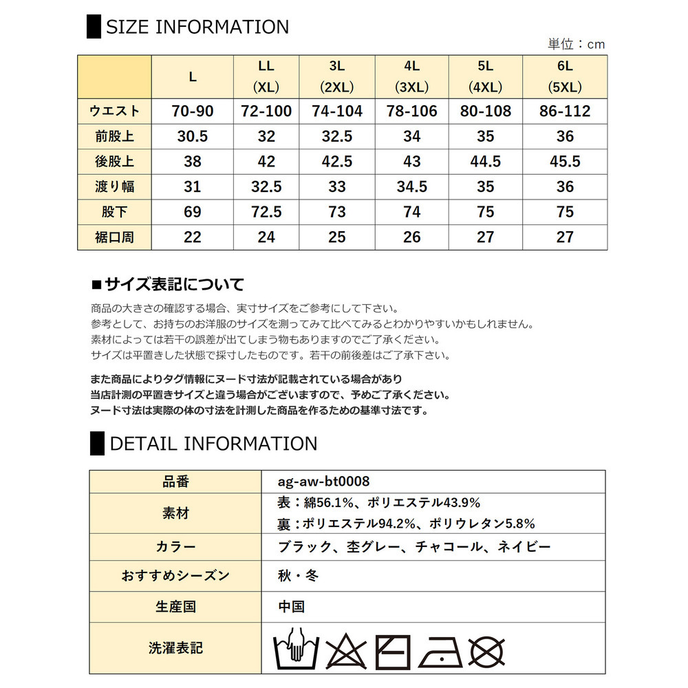 サイズ表記 LL 3L 4L 5L 6L ウエスト 72-100 74-104 78-106 80-108 86-112 前股上 32 32.5 34 35 36 後股上 42 42.5 43 44.5 45.5 渡り幅 32.5 33 34.5 35 36 股下 72.5 73 74 75 75 裾口周 24 25 26 27 27