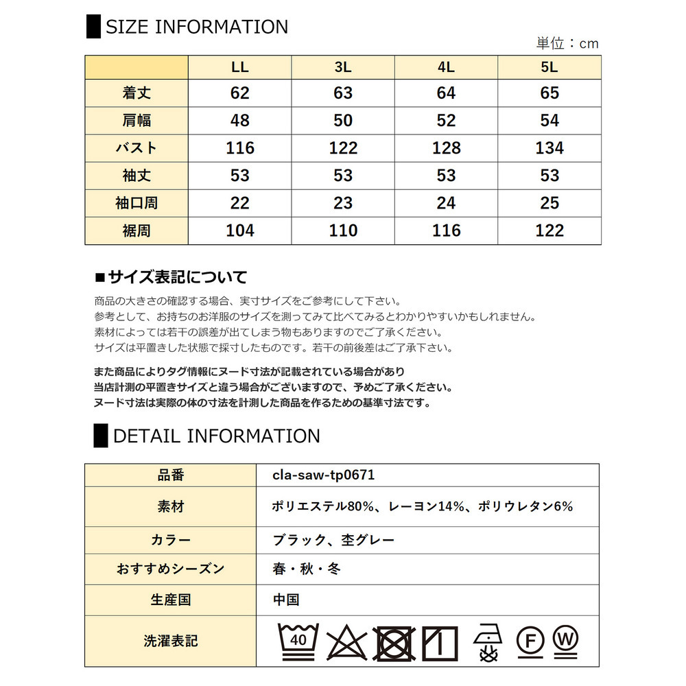 サイズ表記 LL 3L 4L 5L 着丈 62 63 64 65 肩幅 48 50 52 54 バスト 116 122 128 134 袖丈 53 53 53 53 袖口周 22 23 24 25 裾周 104 110 116 122