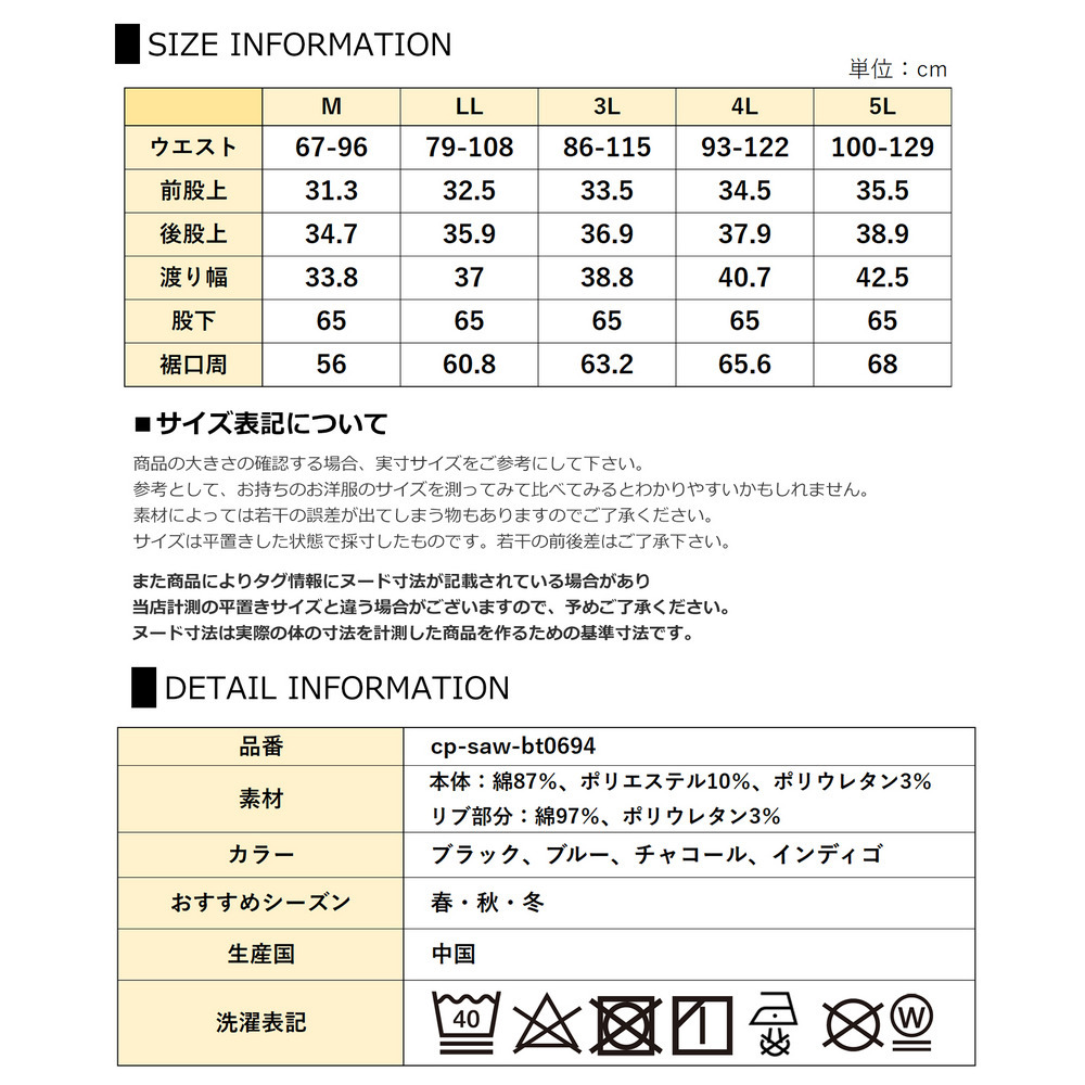 サイズ表記 LL 3L 4L 5L ウエスト 79-108 86-115 93-122 100-129 前股上 32.5 33.5 34.5 35.5 後股上 35.9 36.9 37.9 38.9 渡り幅 37 38.8 40.7 42.5 股下 65 65 65 65 裾口周 60.8 63.2 65.6 68