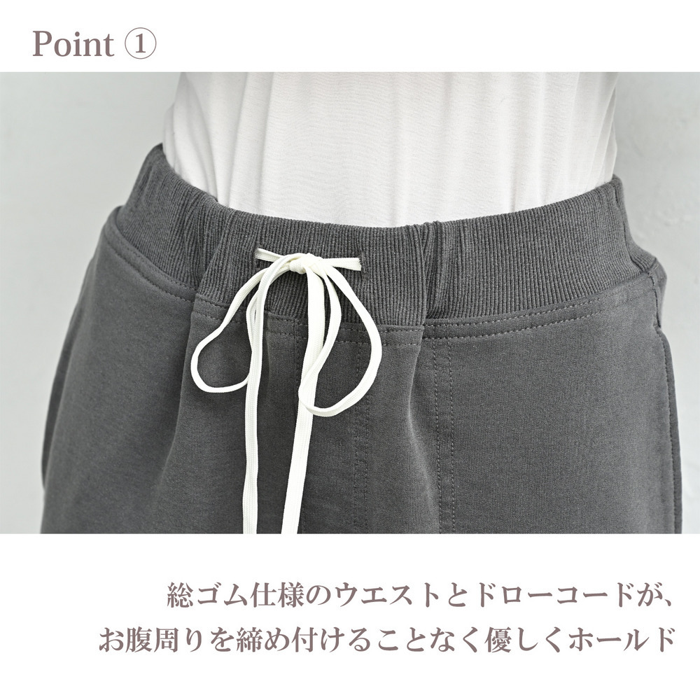 「もう、ボトムスの窮屈さにサヨナラ。2wayの裾絞りで、ワイドもジョガーも自由自在。今日はどこへ寄り道しよう?」