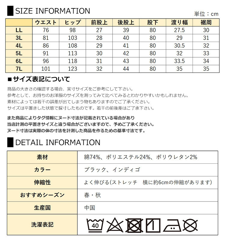 サイズ表記 LL 3L 4L 5L 6L 7L 総丈 104cm 104cm 105cm 106cm 106cm 107cm W 76cm 80cm 86cm 88cm 94cm 101cm H 98cm 103cm 108cm 113cm 118cm 123cm 前股上 24.5cm 25.5cm 25.5cm 27.5cm 28cm 29cm 後股上 34cm 35cm 35.5cm 36cm 36cm 38cm 股下 80cm 80cm 80cm 80cm 80cm 80cm 渡り幅 27.5cm 29cm 30.5cm 32cm 33.5cm 35cm 裾周 30cm 32cm 34cm 36cm 38cm 40cm