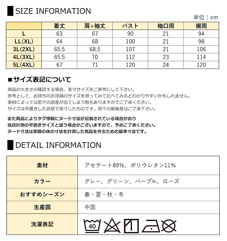 サイズ表記 LL 3L 4L 5L 着丈 64cm 65.5cm 65.5cm 67cm バスト 100cm 107cm 112cm 120cm 肩+袖丈 68cm 68.5cm 70cm 71cm 袖口周 21cm 21cm 23cm 24cm 裾周 98cm 106cm 114cm 120cm