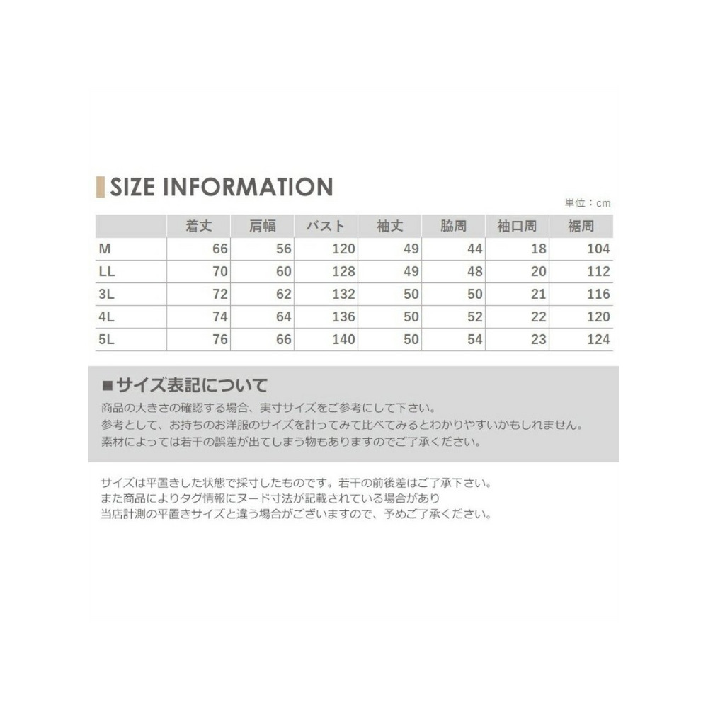 サイズ表記 LL 3L 4L 5L 着丈 70cm 72cm 74cm 76cm 肩幅 60cm 62cm 64cm 66cm バスト 128cm 132cm 136cm 140cm 袖丈 49cm 50cm 50cm 50cm 脇周 48cm 50cm 52cm 54cm 袖口周 20cm 21cm 22cm 23cm 裾周 112cm 116cm 120cm 124cm